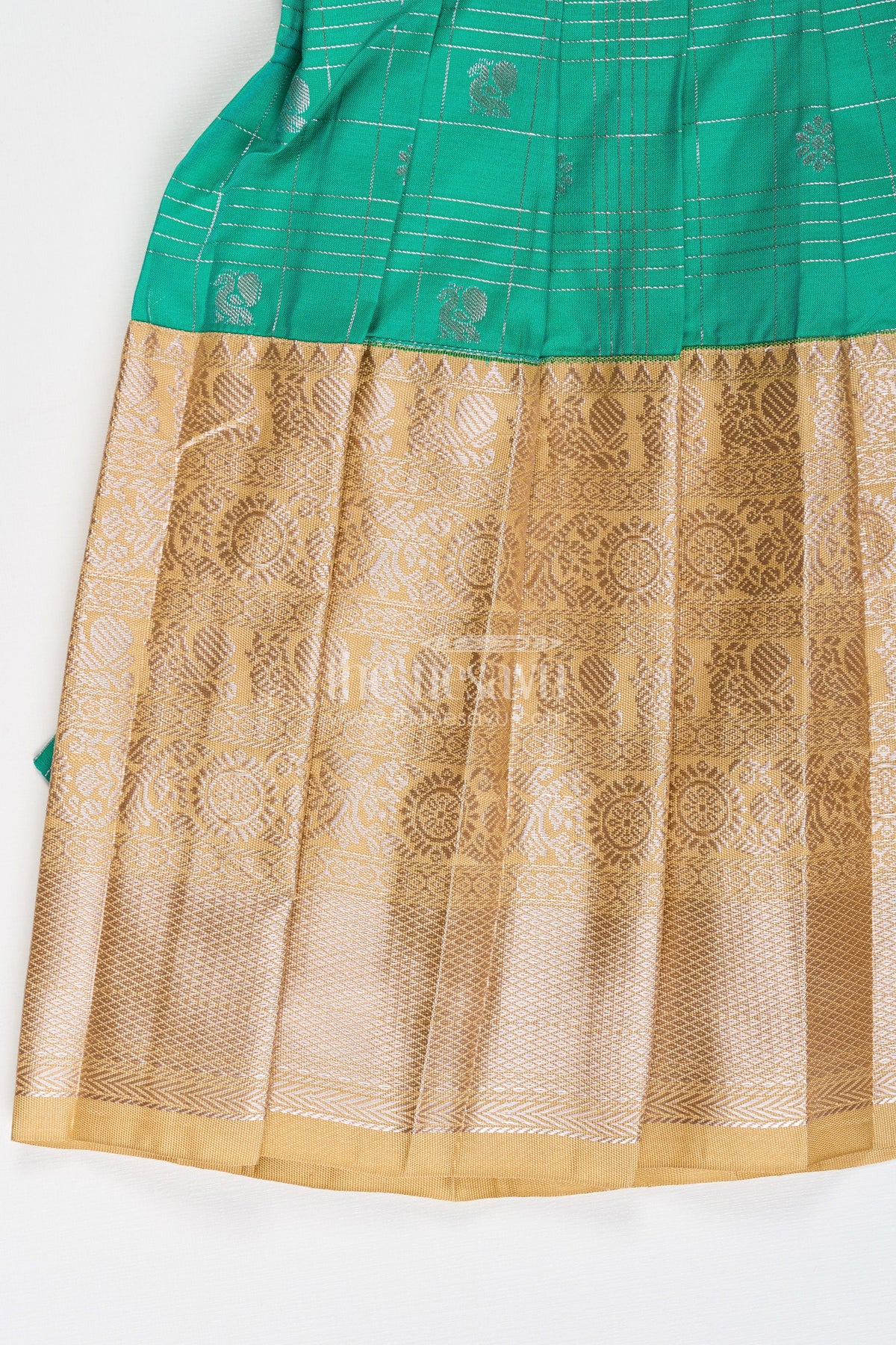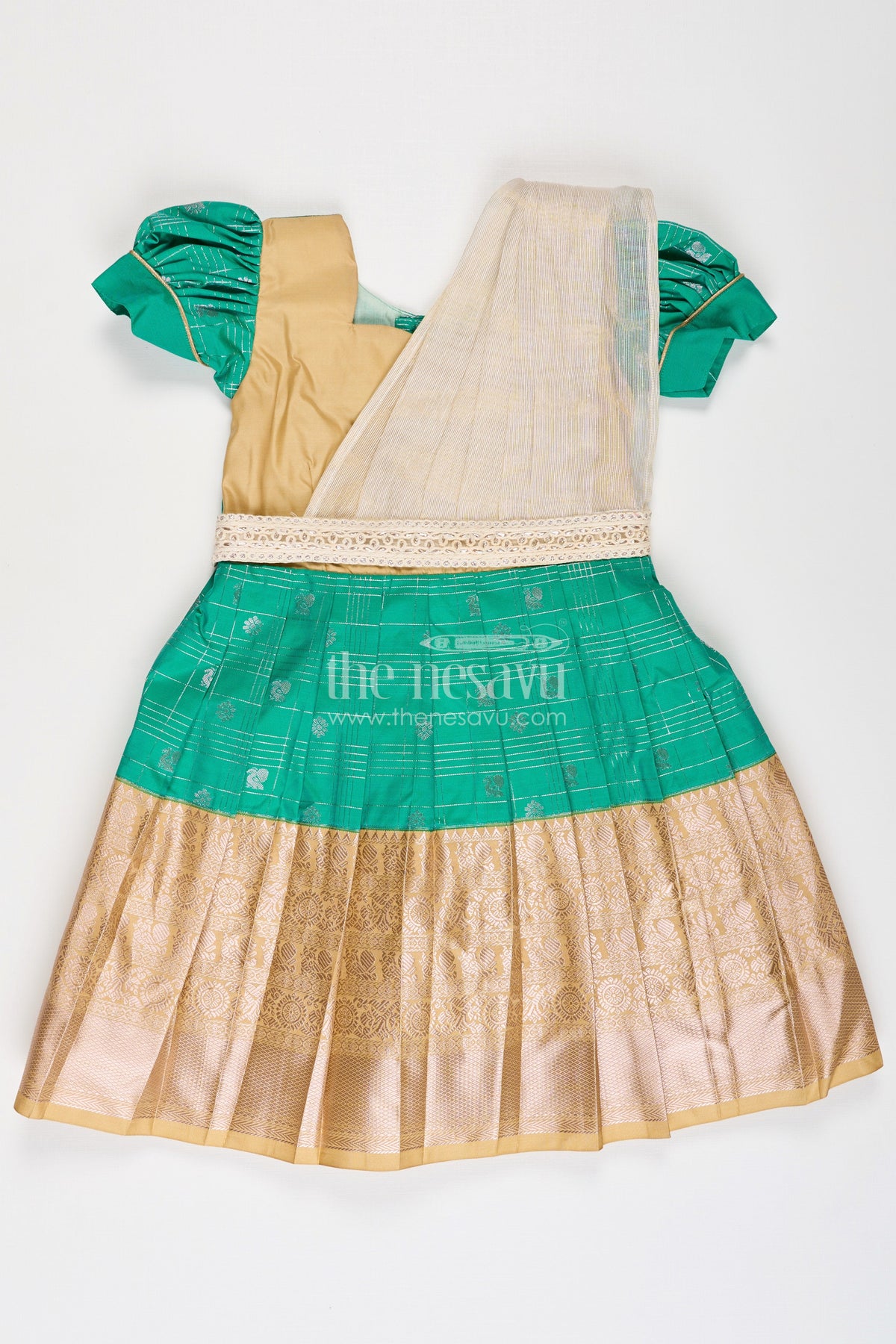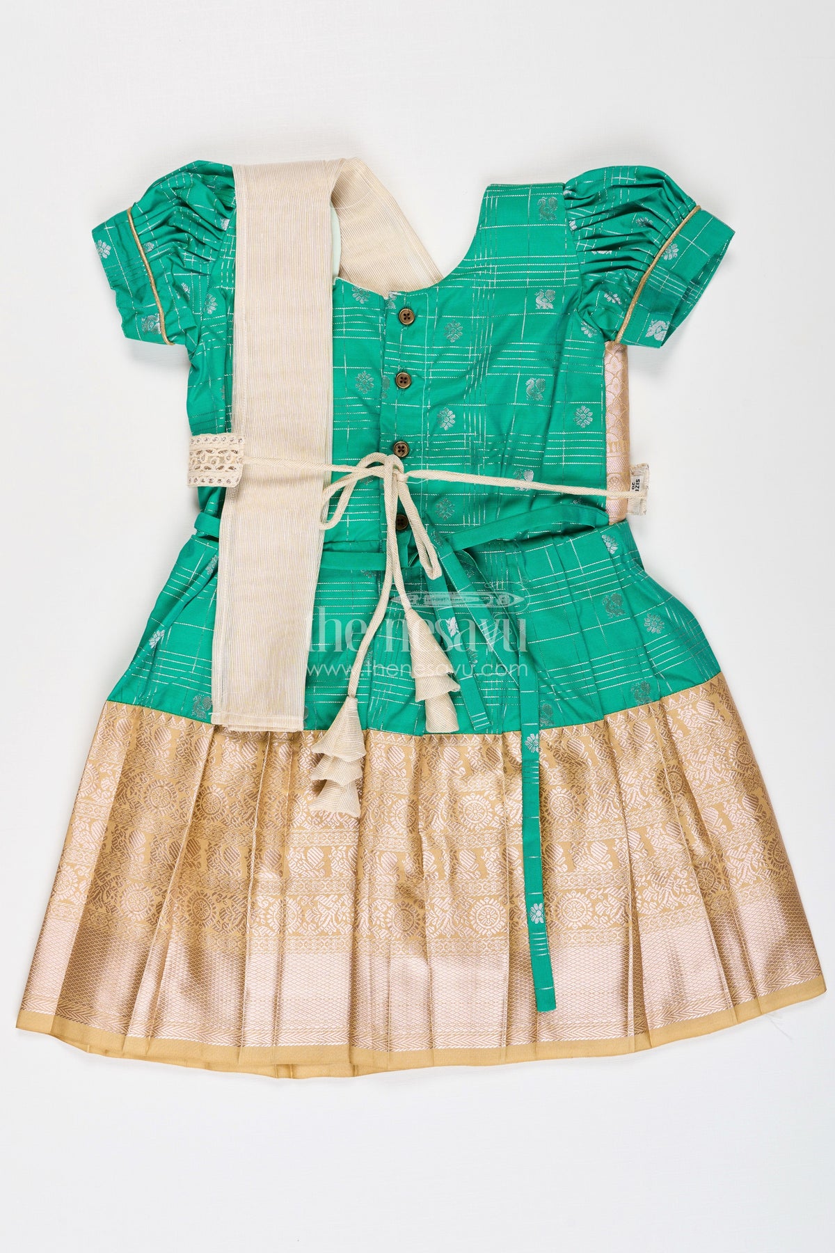Frocks designs come to life in this beautifully crafted green and gold Kanchi-style silk frock for girls. Tailored from semi Kanchivaram silk, this outfit features a pleated golden skirt paired with a richly detailed green yoke. The bodice is highlighted with intricate thread embroidery, while the included lace-embellished dupatta adds a touch of tradition and grace. With its puff sleeves and structured silhouette, this frock is perfect for festive occasions, traditional events, or cultural celebrations. Designed to offer both comfort and elegance, it’s a timeless addition to any young girl's ethnic wardrobe.