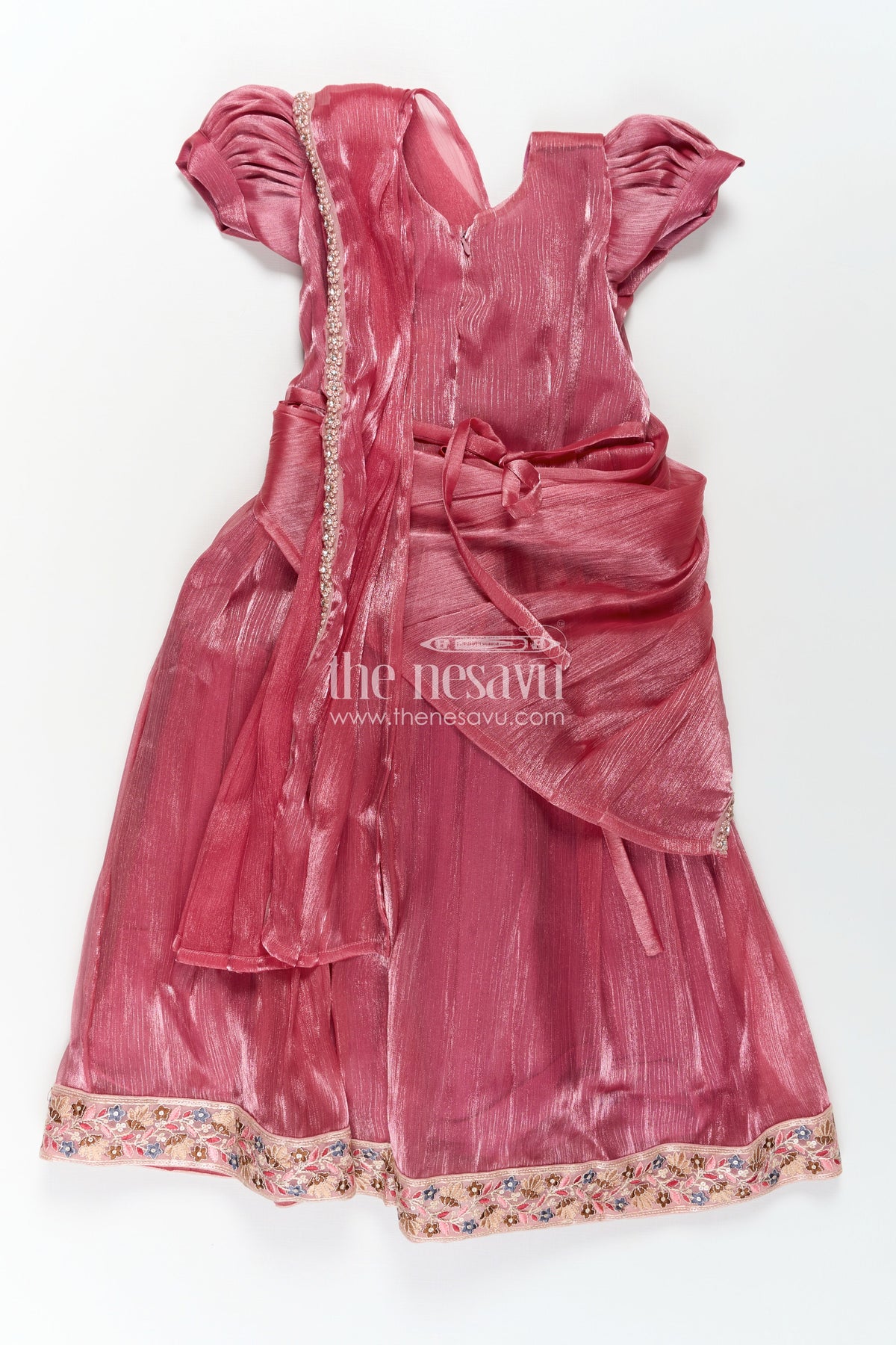 Gown dresses are the perfect statement for little fashionistas, and this rich wine-hued organza party gown adds a magical blend of elegance and sparkle. Crafted from fine organza fabric with a smooth, flowing finish, the gown features stone lace embellishments along the hem and dupatta, adding a delicate shimmer with every movement. The puff sleeves enhance its classic charm, while the soft pleats give it a flattering silhouette. Ideal for festive functions or formal events, this gown is lightweight and breathable—perfect for girls who love to look regal and feel comfortable all day long.