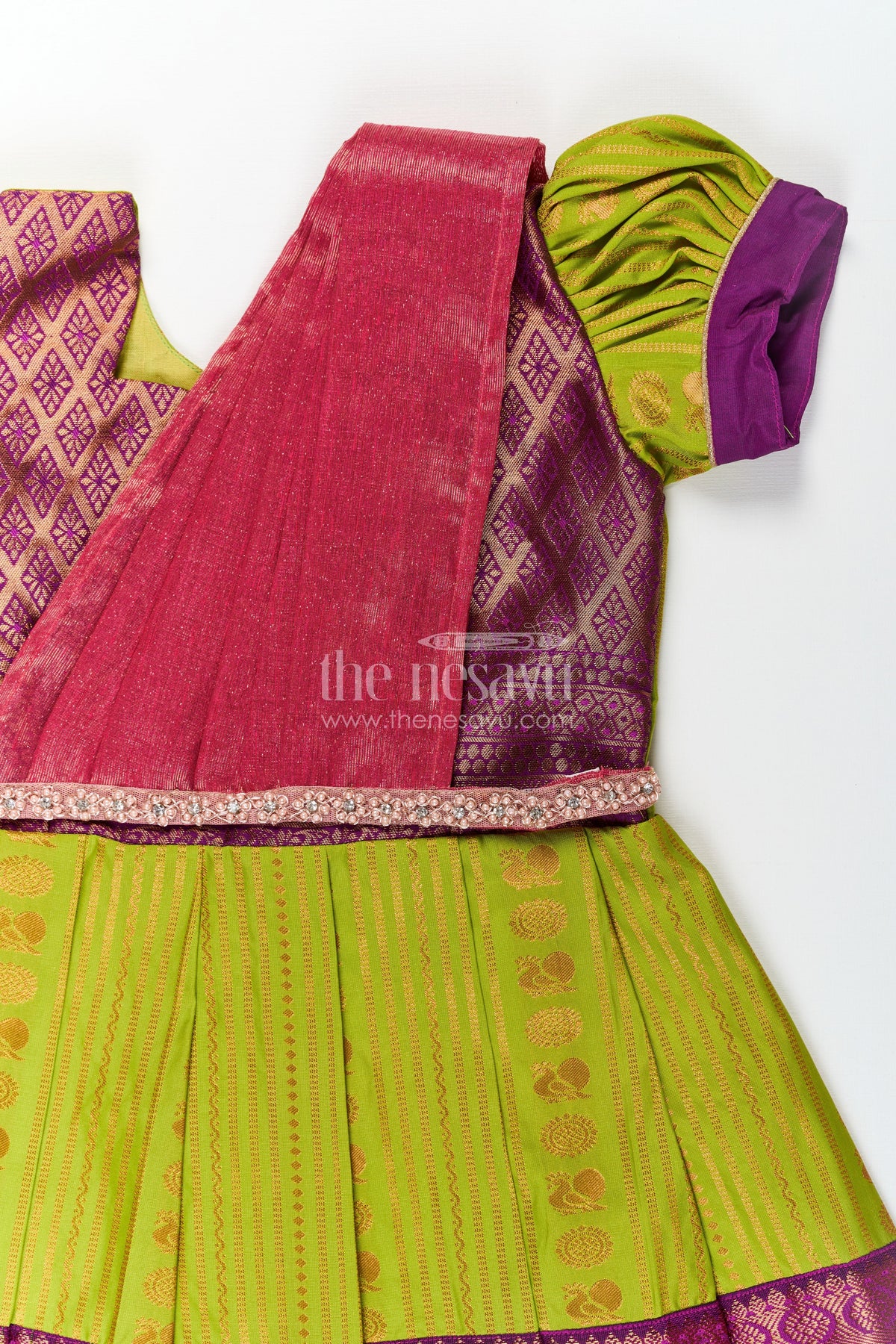 Maroon silk dress that blends tradition with vibrant style, this semi Kanchivaram frock is a standout choice for festive occasions. The rich maroon and green pleated skirt features detailed zari work, paired with a contrasting purple blouse in traditional weave design. A highlight of the set is the matching dupatta adorned with delicate stone lace work, adding a regal finishing touch. The soft silk fabric ensures comfort while delivering elegance, making it perfect for temple visits, family functions, or festivals.