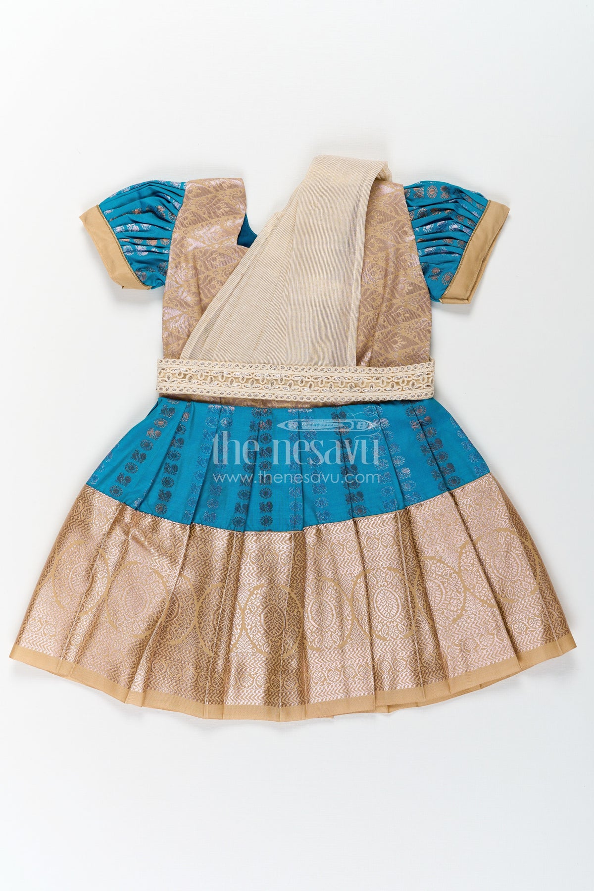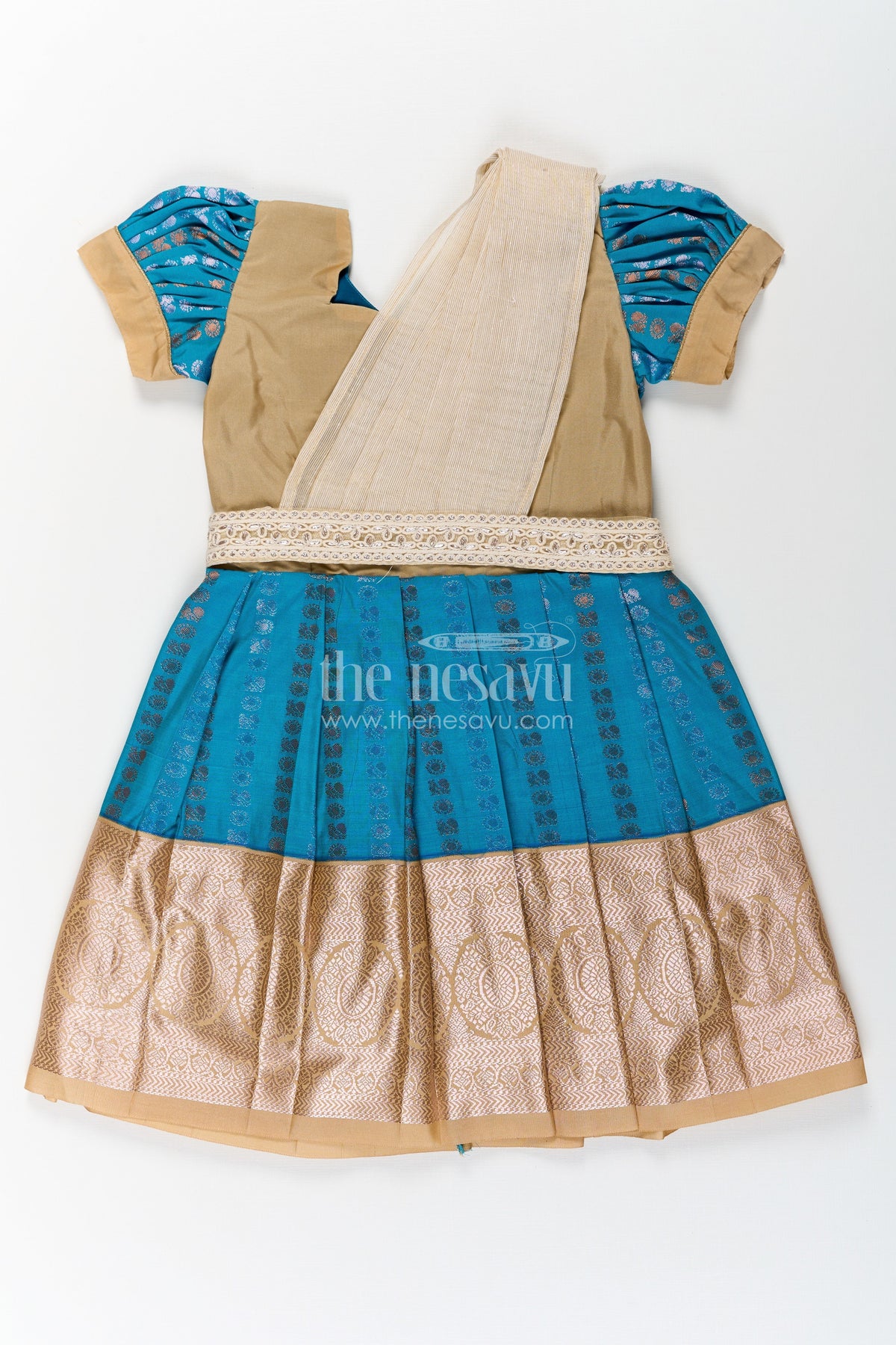 Silk dress royal blue styles are always a favorite for their timeless charm, and this girls Kanchi silk frock brings that royal hue to life with rich tradition and playful elegance. Crafted from semi Kanchivaram silk, this frock features intricate thread embroidery and a beautifully embellished lace dupatta that drapes gently across the shoulder. The bodice is woven with shimmering motifs in soft gold tones, perfectly complementing the deep royal blue pleated skirt adorned with traditional patterns and a wide golden zari border. Puff sleeves with golden trim add to its festive feel, while the soft inner lining ensures lasting comfort for your little one. With its blend of structure and flow, this dress is perfect for twirling at family events and gatherings. Designed for young girls who love to dress up without compromising on ease, this frock is a standout choice for both daily elegance and special moments.