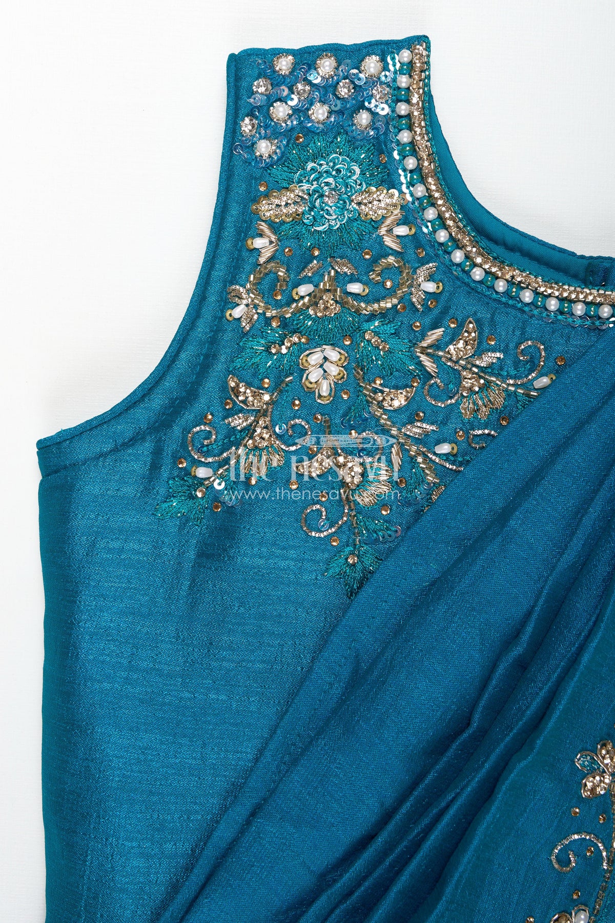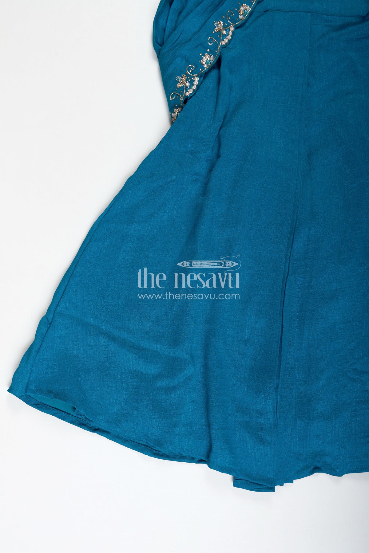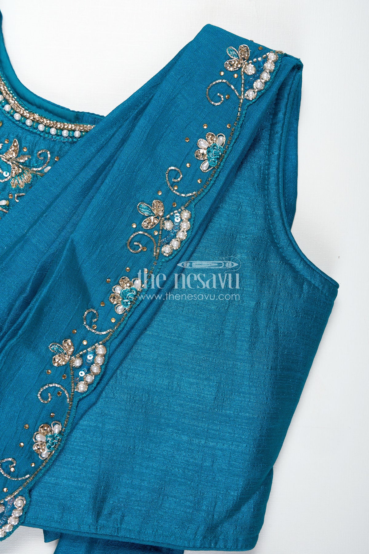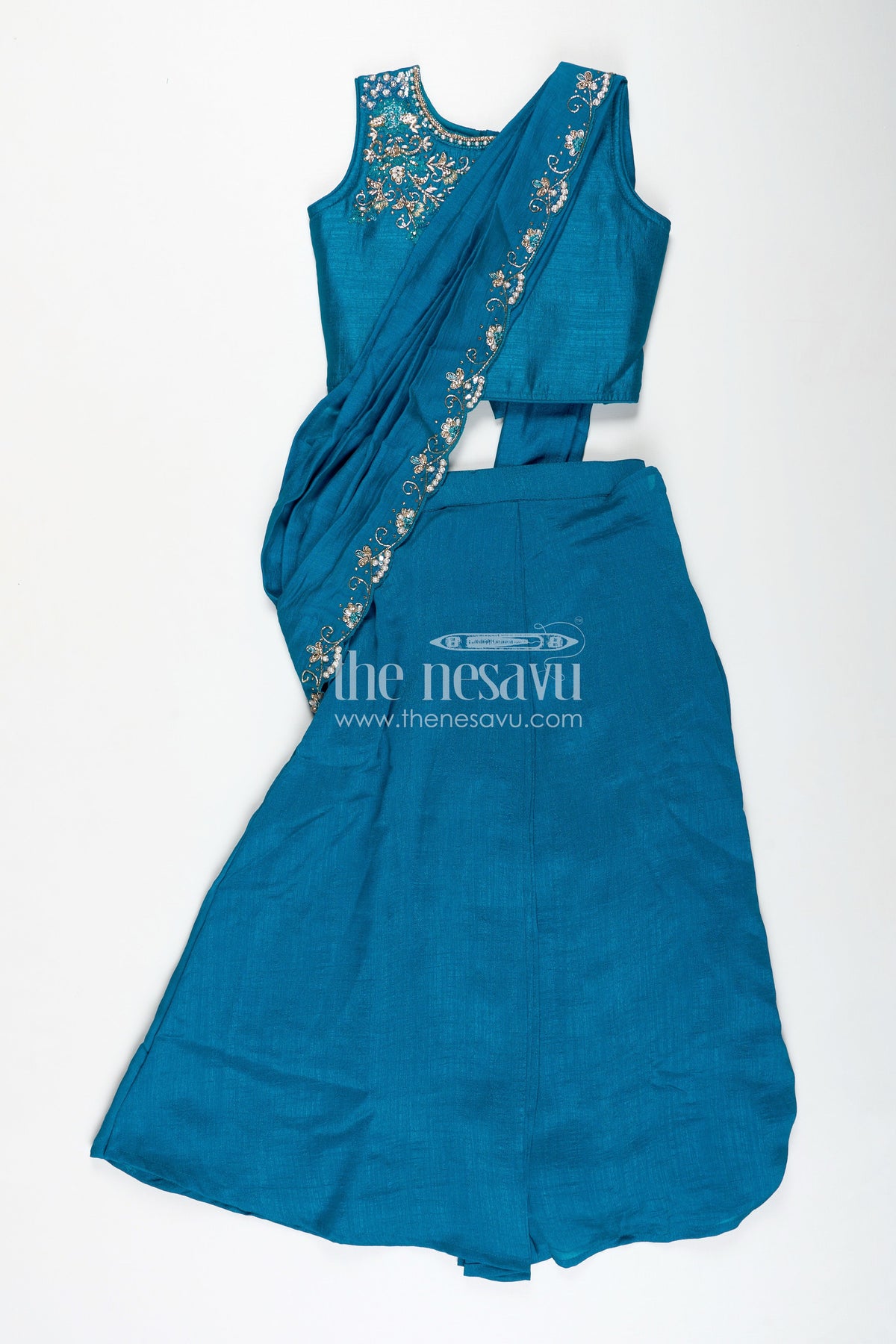 This stunning Kids Saree Style Lehenga Choli for Family Functions is the perfect fusion of elegance and tradition. Made from pure georgette in a beautiful teal shade, this set is designed for young girls who love dressing up in graceful ethnic wear. The blouse features designer embroidery with intricate sequin work, while the lehenga falls gracefully in a semi-saree style silhouette. The dupatta drapes easily and matches the embroidery of the blouse for a cohesive festive look. Lightweight and comfortable, this outfit is ideal for weddings, family celebrations, and cultural events. The fabric ensures breathability and free movement so your little one can enjoy every moment in style.