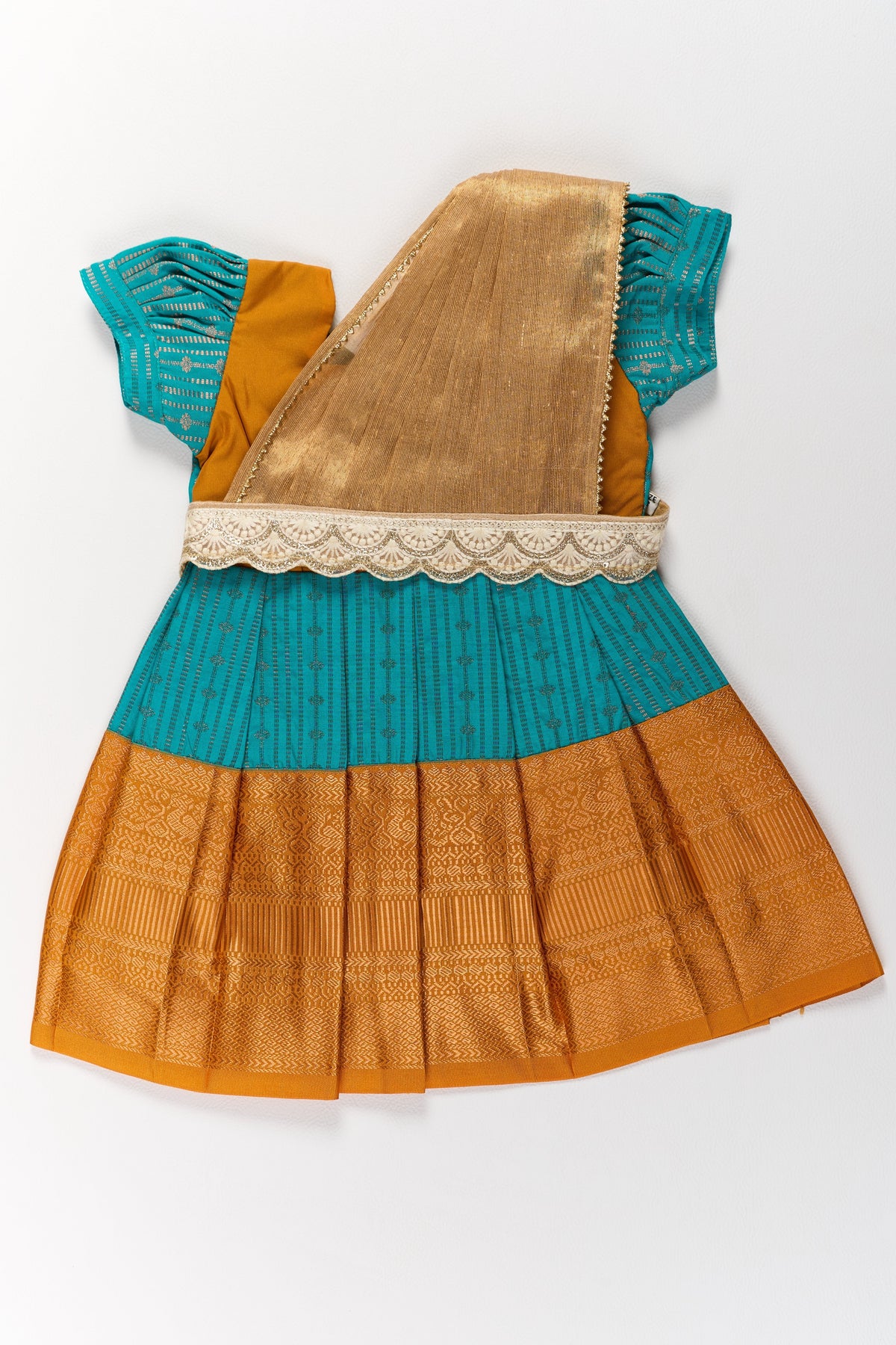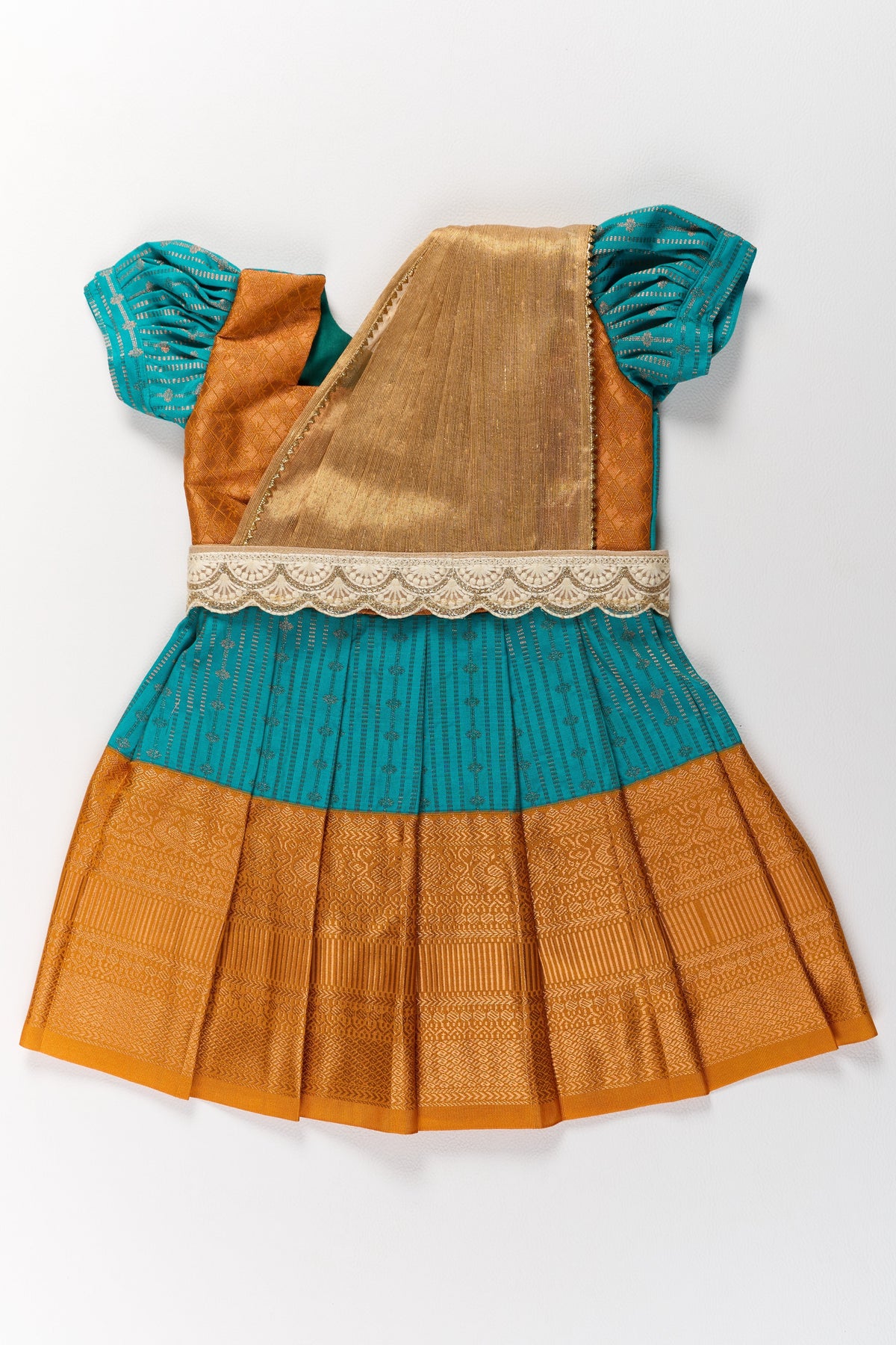 This exquisite pattu pavadai is a timeless piece crafted from rich silk fabric, blending tradition with elegance. The vibrant green and gold combination, complemented by intricate zari borders, makes it a perfect choice for festive occasions like Pongal, Navratri, and weddings. The puff sleeves add a touch of grace, while the pleated skirt enhances the traditional appeal. Designed with comfort in mind, this outfit ensures ease of movement for your little one. Pair it with traditional accessories to complete the ethnic look.