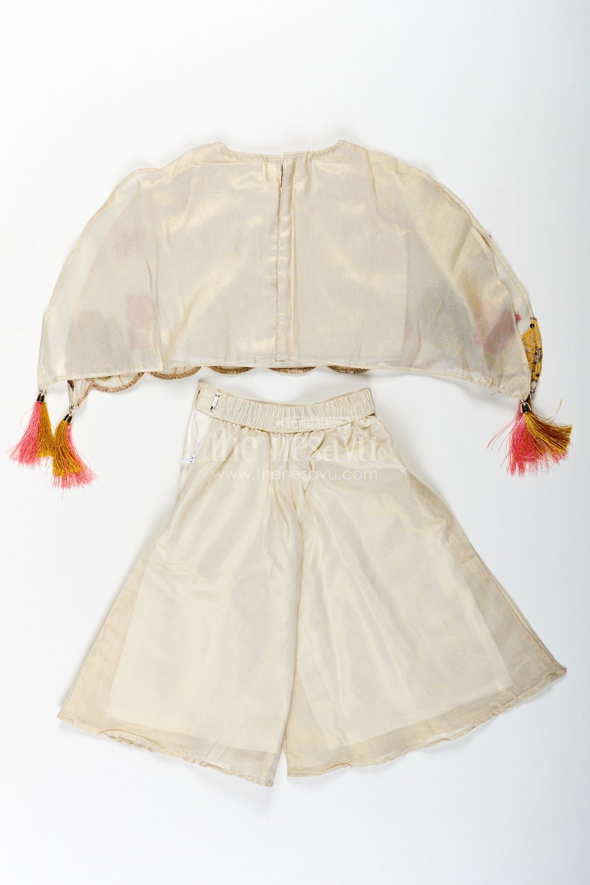 The Nesavu Girls Sharara / Plazo Set Cream Color Sharara Set for Girls in Shimmer Viscose Silk with Designer Embroidered Cape and Tassels Nesavu Nesavu Girls Cream Color Sharara Set Embroidered Shimmer Cape Top Flared Silk Pants