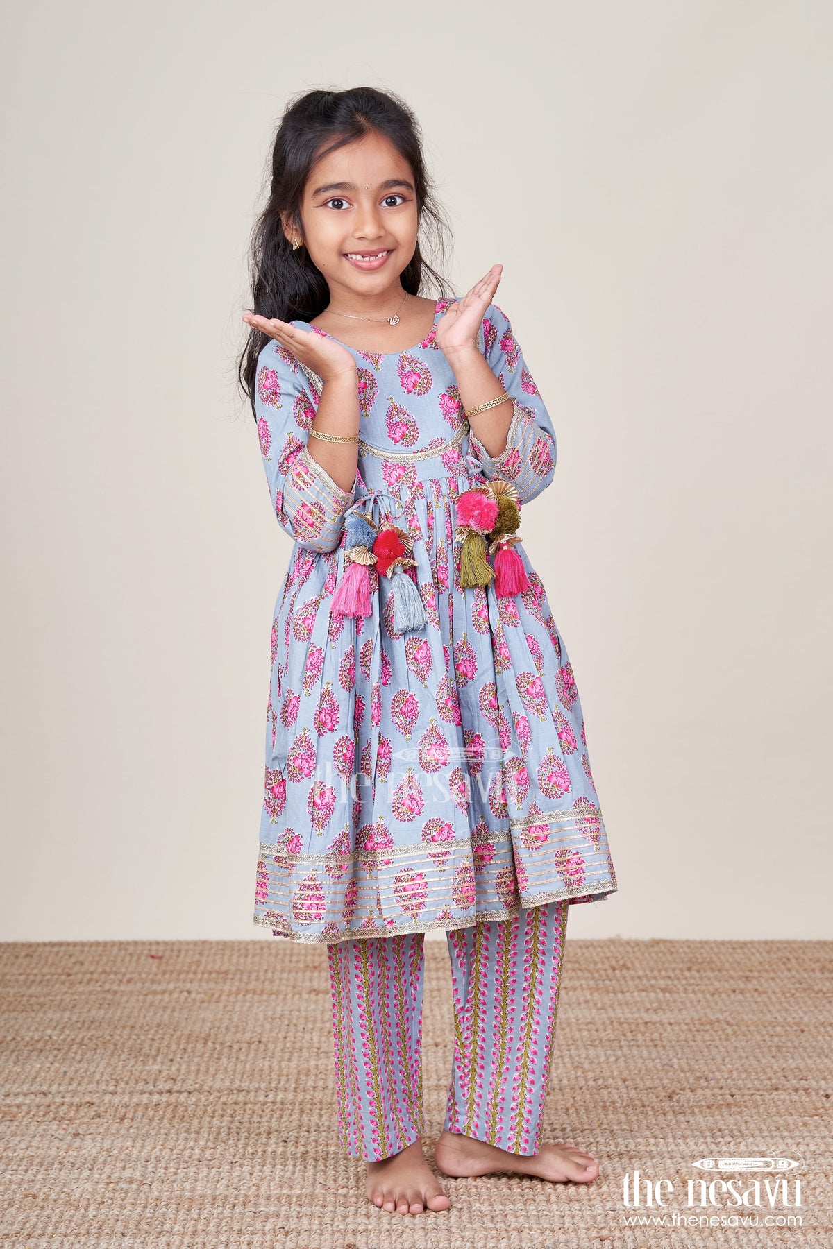 Girls Cotton Kurti Set with Floral Block Print and Festive Tassels
