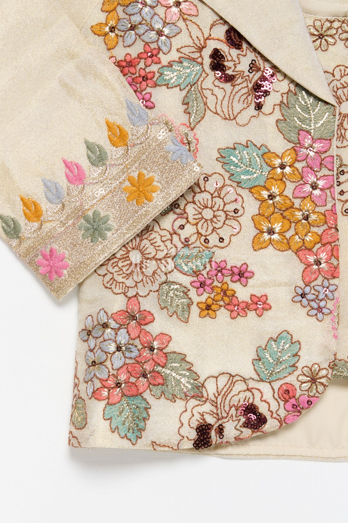 • The jacket is adorned with floral embroidery and sequins, adding a festive charm
