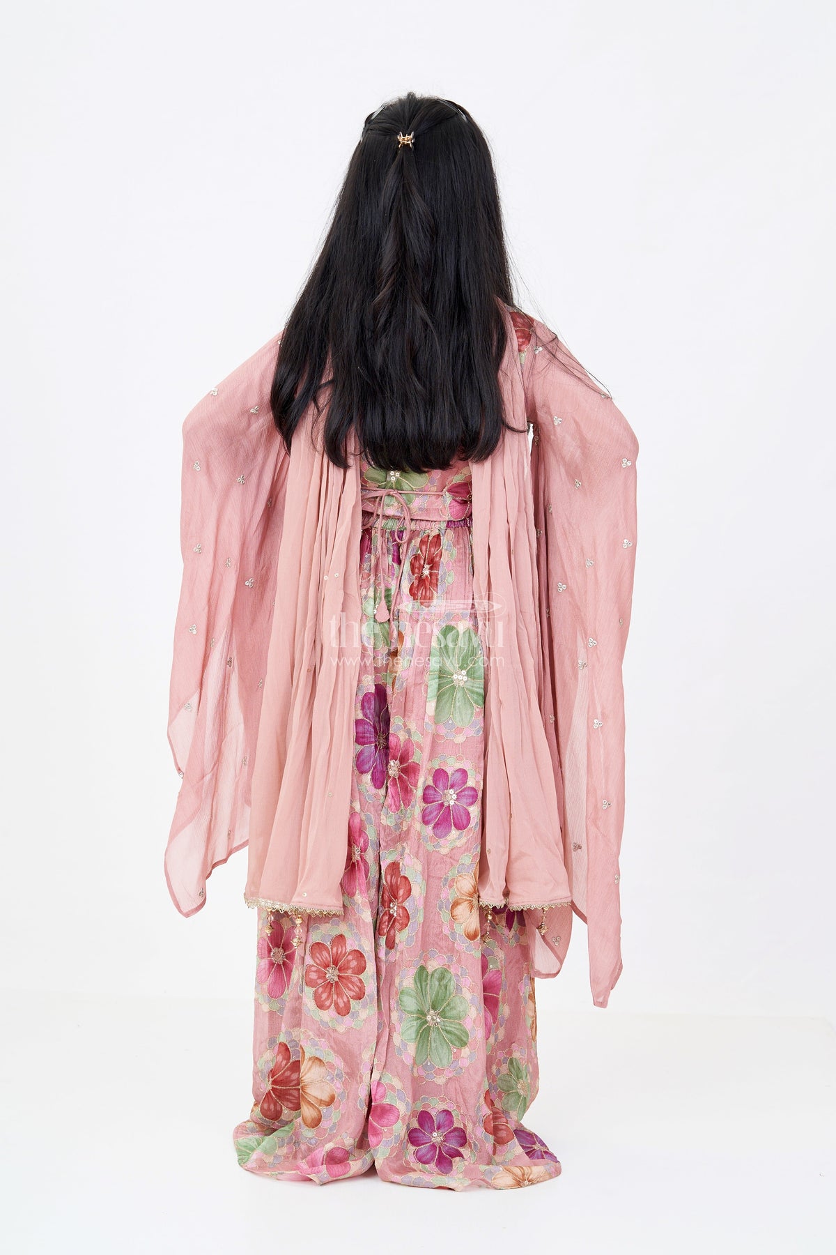 This plazo and top set is a perfect fusion of traditional elegance and contemporary fashion. Crafted from pure chinon fabric with digital floral prints, the V-neck top is adorned with intricate embroidery and is paired with flared plazo pants for a graceful silhouette. The statement organza puff sleeves add a dramatic touch, making this outfit ideal for weddings, festive gatherings, and cultural events. A matching net dupatta with sequin embellishments completes the look, ensuring a regal and sophisticated appeal.