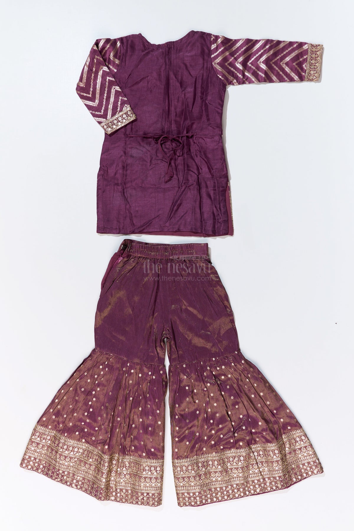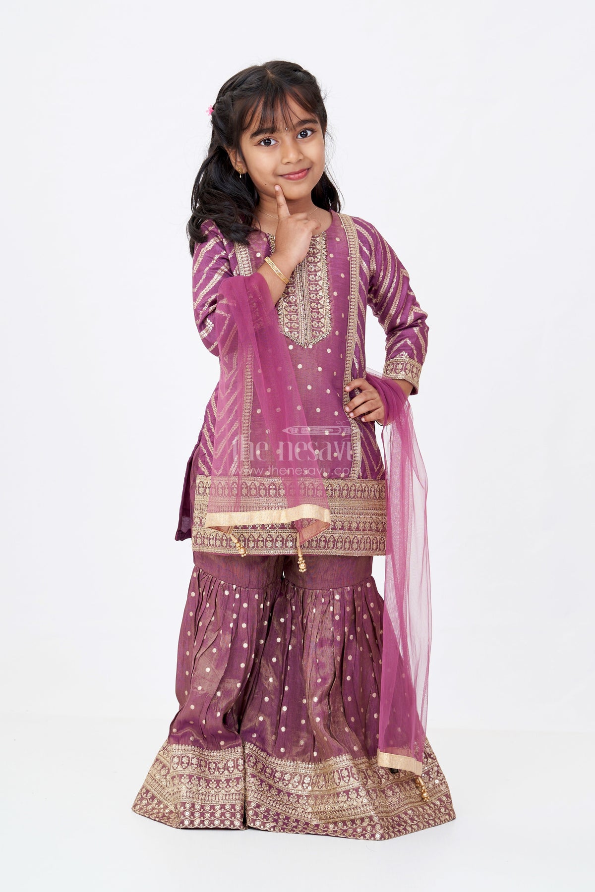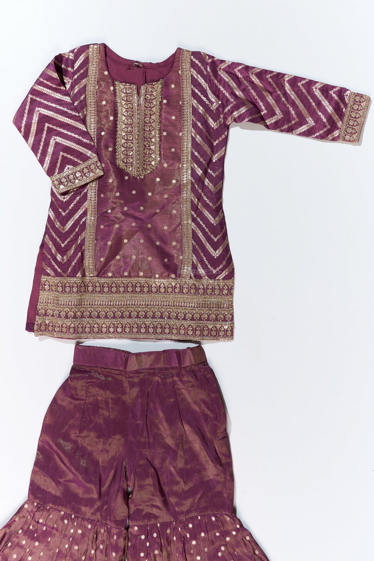 This exquisite kurta sharara set is a stunning addition to any festive wardrobe. Crafted from pure tissue jacquard, the rich maroon fabric is adorned with intricate gold embroidery, adding a regal touch to the outfit. The three-quarter sleeve kurta features detailed embellishments, while the flared sharara pants provide a graceful silhouette. Paired with a matching embroidered dupatta, this set is perfect for weddings, Diwali, and other grand celebrations. Designed for both comfort and style, this kurta sharara set ensures your little one looks elegant while staying at ease throughout the occasion.