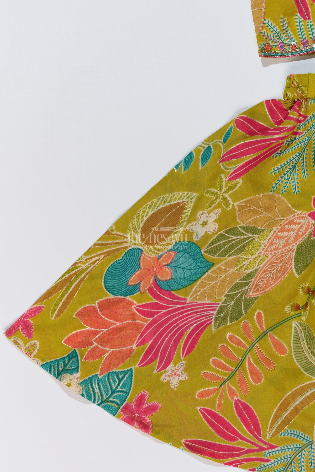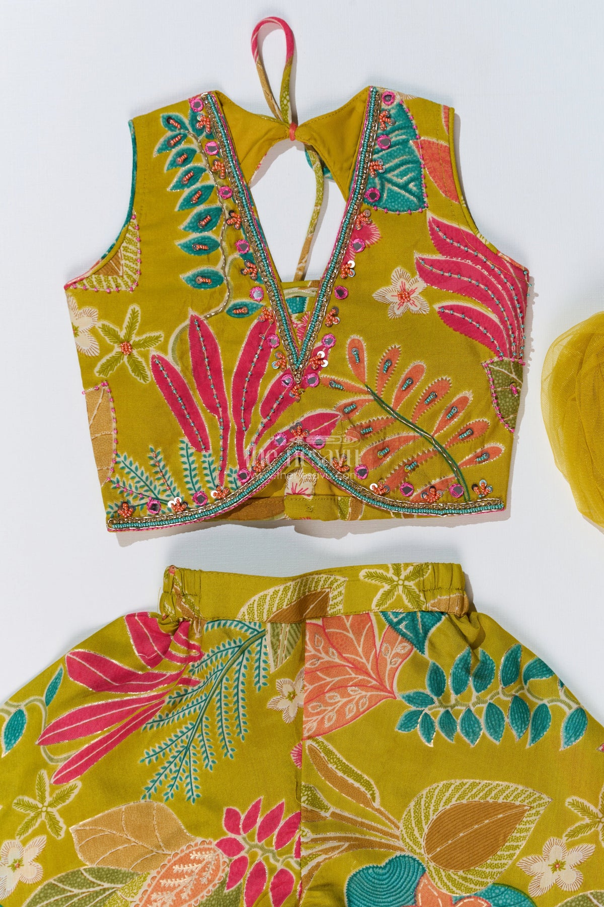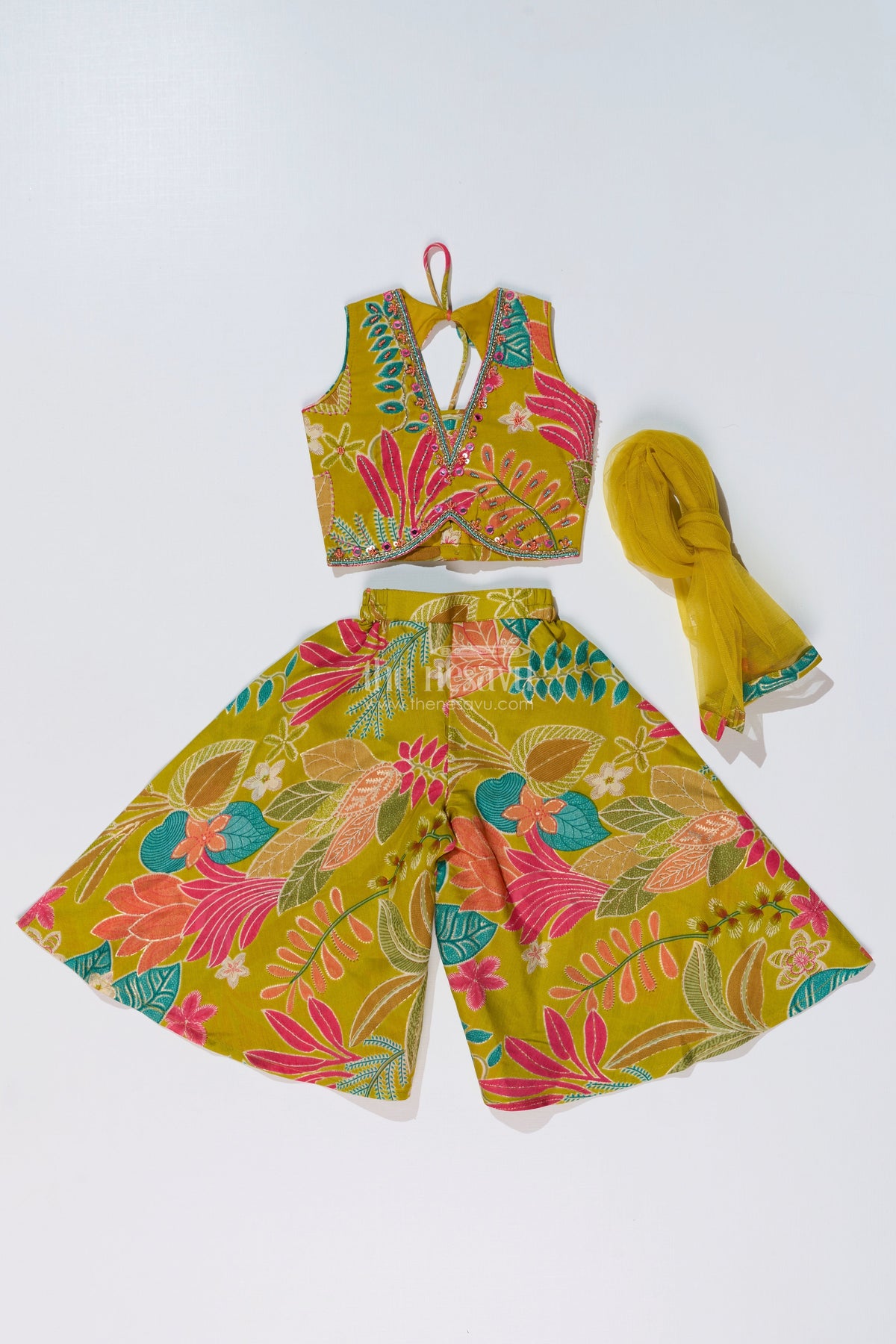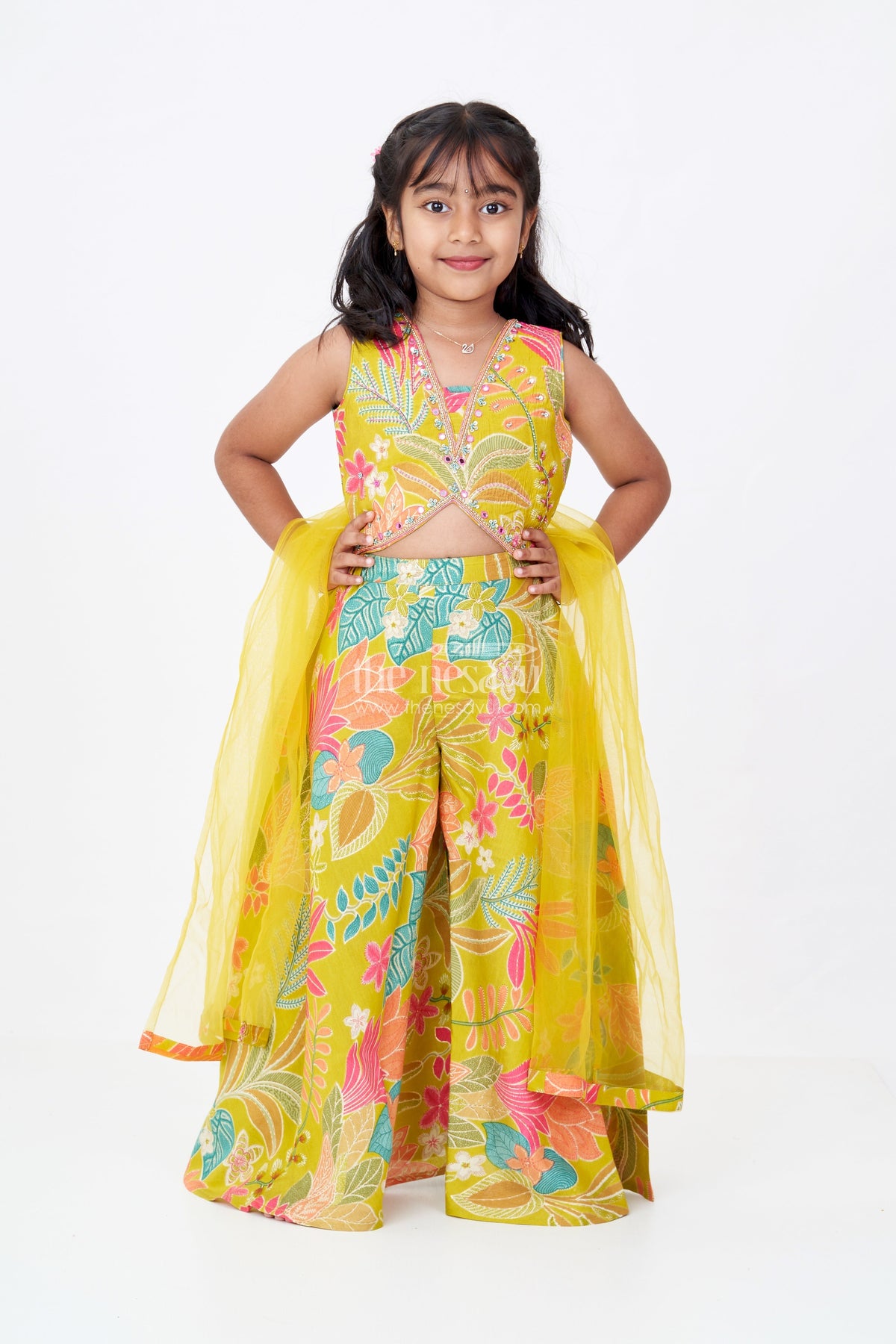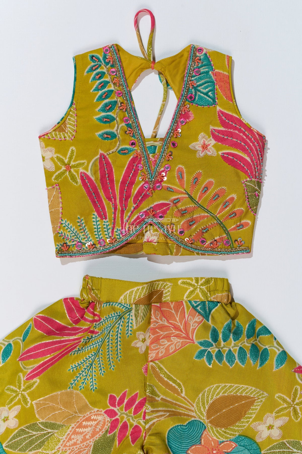 This chic modern classy sharara dress is designed for girls who love a perfect blend of tradition and contemporary fashion. Made from soft muslin silk, the outfit features a vibrant floral digital print on a flared sharara bottom, paired with a stylish embroidered blouse. The detailed mirror work on the blouse adds a festive sparkle, while the flowy silhouette ensures comfort and elegance. Ideal for weddings, cultural events, and festive gatherings, this outfit is a must-have for your little fashionista.