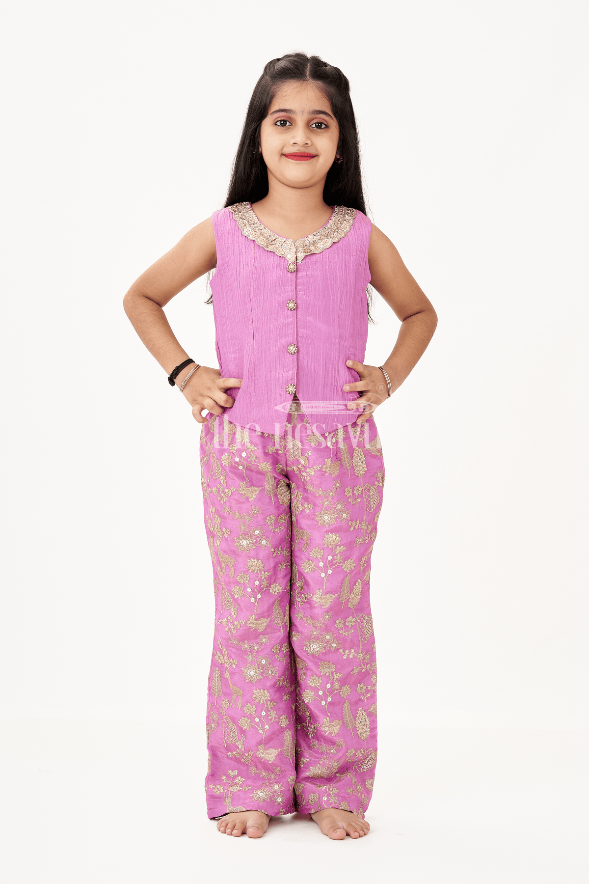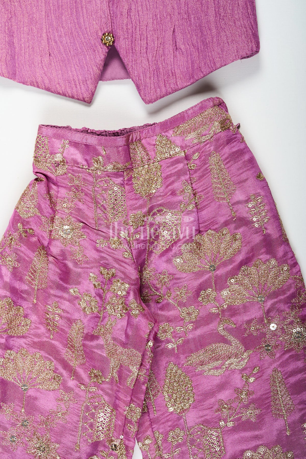 Party wear sharara with crop top gets a chic update with this Nesavu outfit crafted in luxurious blended silk. The lavender crop top is accentuated with sequins and zari thread embroidery around the neckline, matched with coordinated sharara pants boasting intricate golden motifs. With its rich texture and shimmering finish, this outfit is a head-turner for festive gatherings and family celebrations. Designed for comfort and style, it offers a modern silhouette that keeps your little one looking elegant and feeling fabulous.