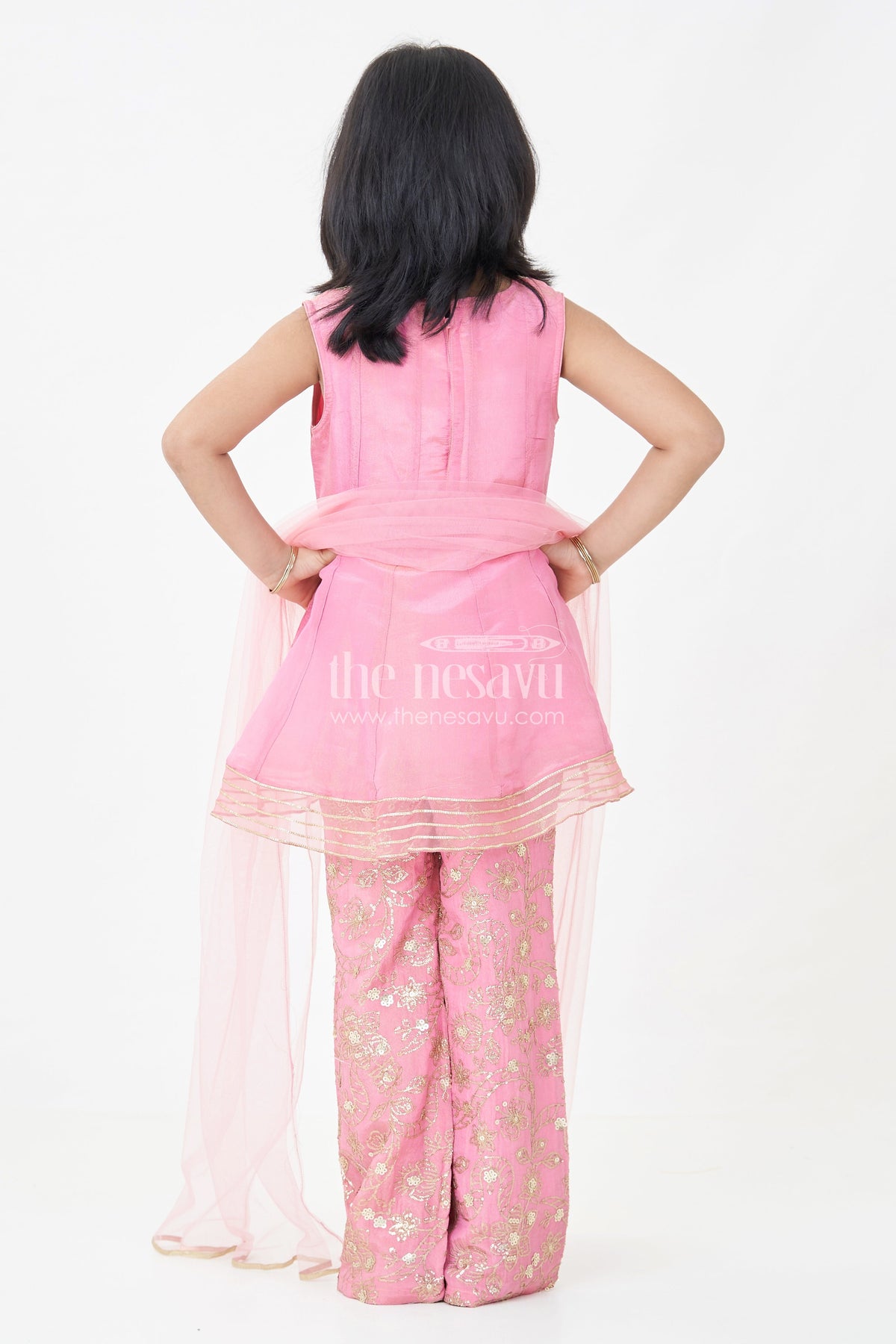 Sharara set is the focus keyword that beautifully defines this vibrant girls outfit in pink. Crafted from soft viscose tissue fabric, this set is adorned with sparkling sequin embroidery on the bottoms, making it both festive and fabulous. The peplum-style top features golden thread detailing and pairs perfectly with the flared sharara pants, creating a charming silhouette for little girls. A sheer dupatta and matching sleeves complete the set, offering a complete traditional ensemble with modern flair. Designed for all-day comfort, the breathable fabric ensures ease of movement while the embellishments maintain their sparkle. It’s an ideal choice for weddings, festive occasions, or simply when your little one wants to shine.