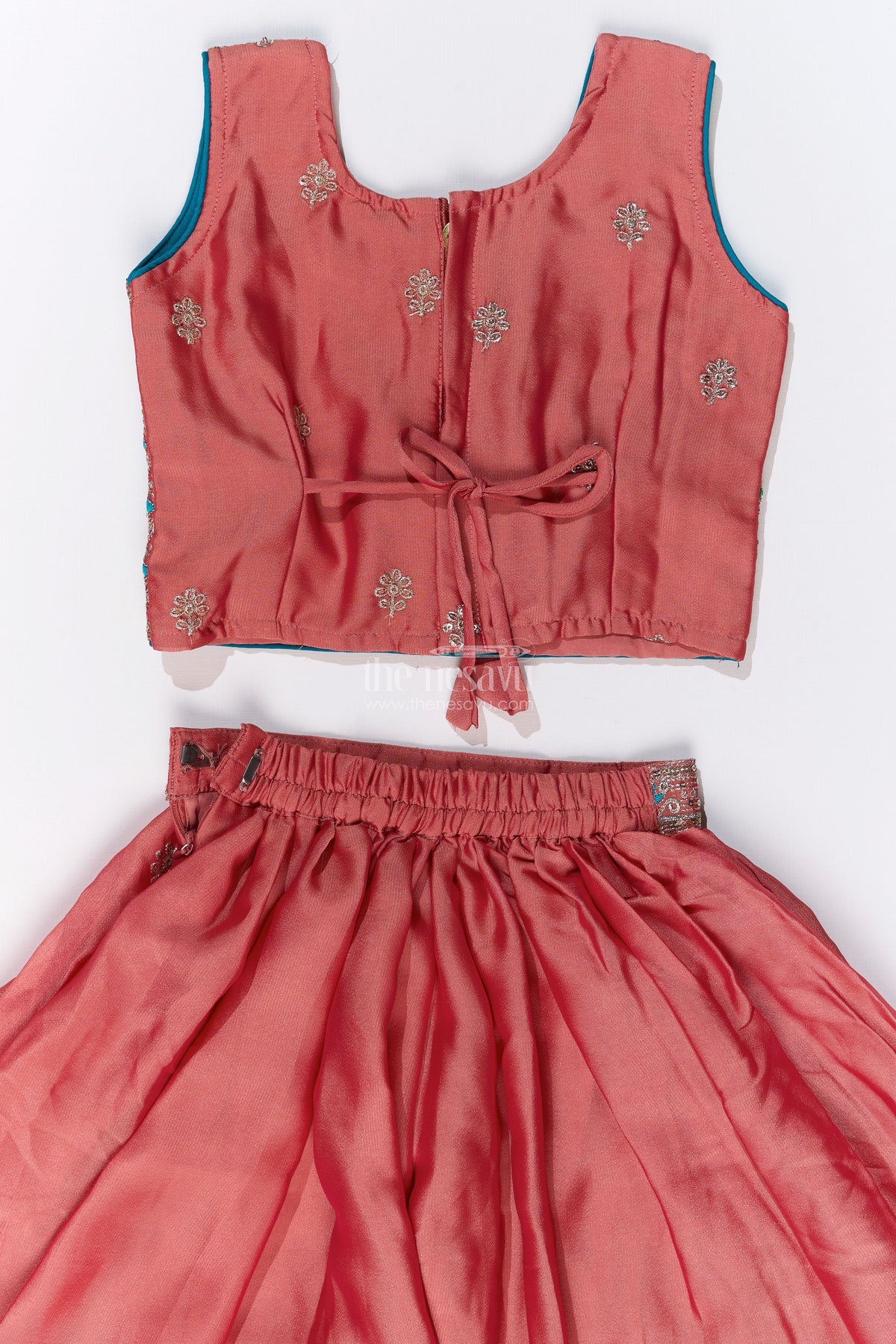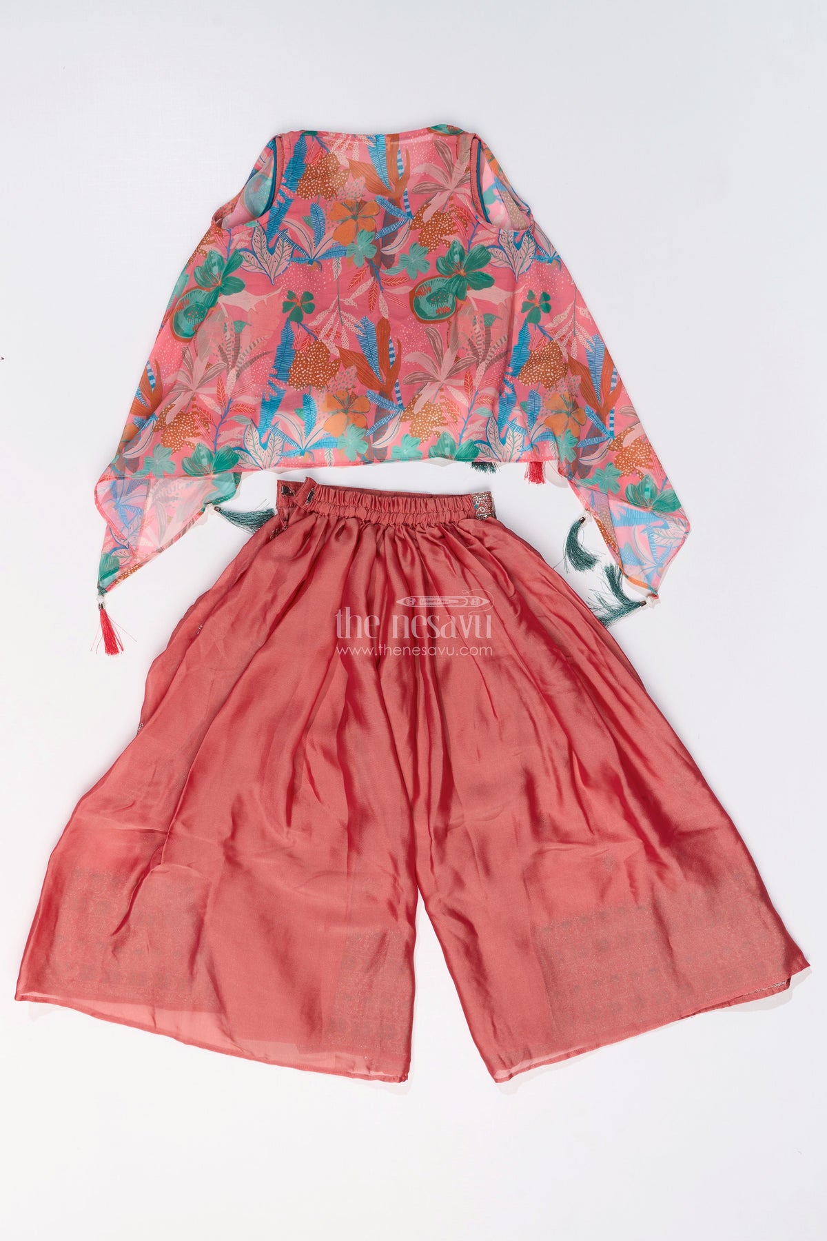 This stylish plazo and shrug set is a stunning fusion of traditional and contemporary fashion, perfect for festive occasions and celebrations. The beautifully embroidered georgette top is paired with flared plazo pants, featuring intricate zari and sequin work along the hemline. The standout element of this set is the digital printed shrug, adding a vibrant and fashionable touch to the ensemble. The soft and breathable fabric ensures all-day comfort, while the trendy silhouette allows for easy movement. Whether it’s a wedding, family gathering, or festive celebration, this set is designed to make your little one look elegant and feel comfortable.