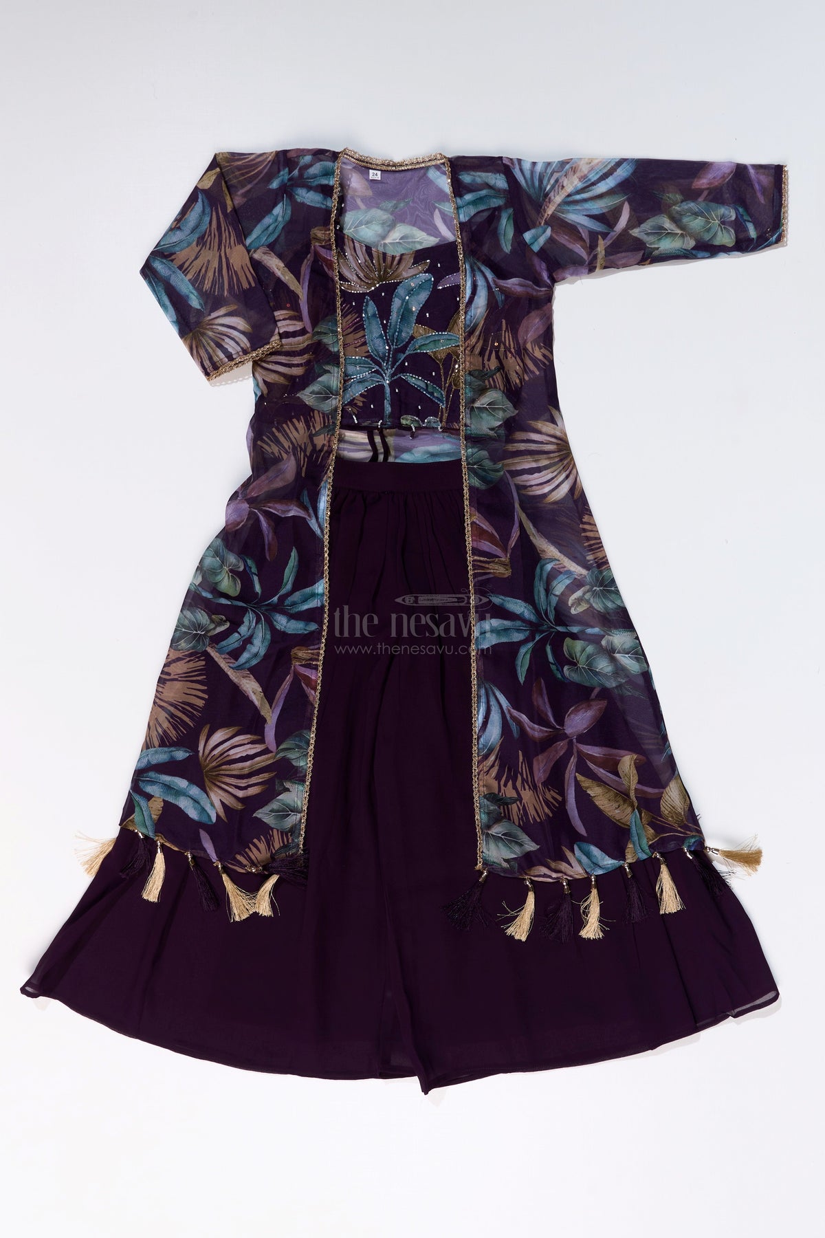 This trendy plazo with top dress is a unique fusion of style and tradition. The outfit features a sleek plazo pant set paired with a sleeveless embroidered top, layered under a stunning digital-printed jacket. The intricate embroidery adds a luxurious feel, while the flowy georgette fabric ensures a soft and airy touch. The jacket’s tasseled edges enhance the overall look, making this ensemble a perfect choice for weddings, family gatherings, and festive occasions.