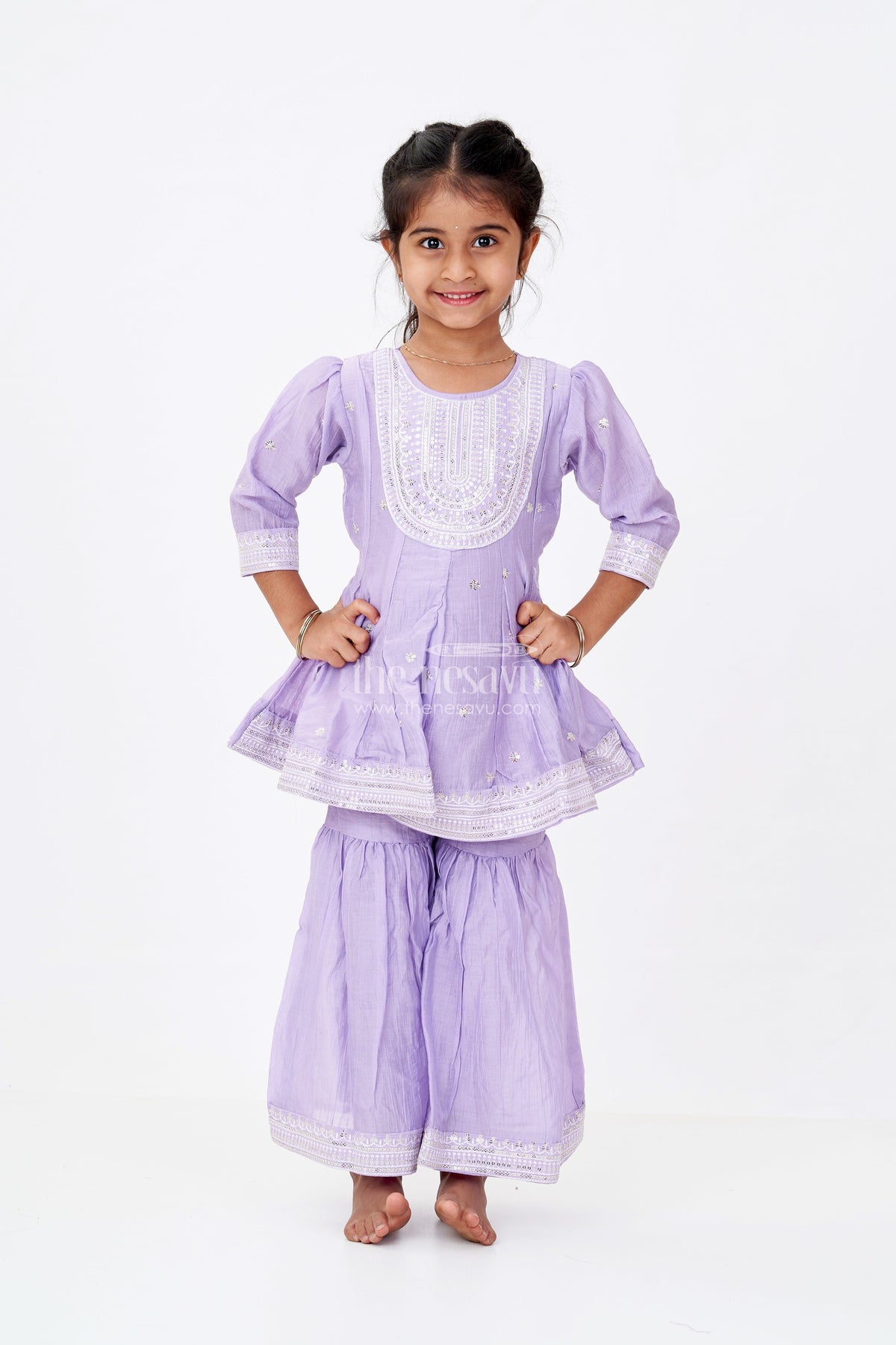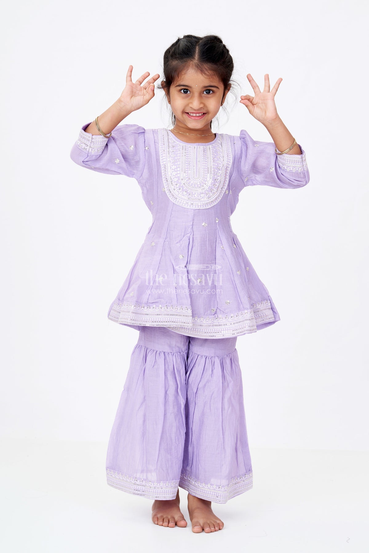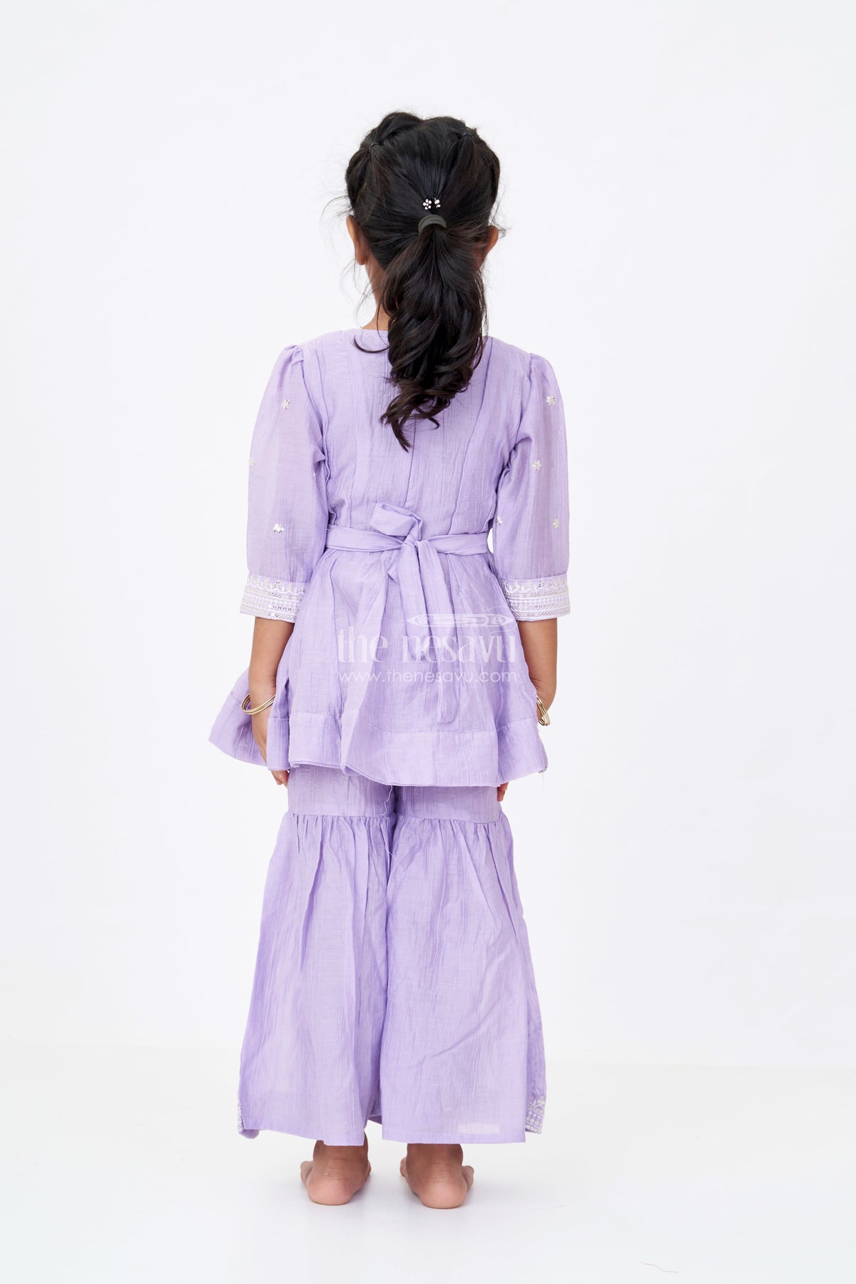 The purple sharara set is a charming addition to any little girl’s traditional wardrobe, designed to blend comfort and elegance. This set, made from soft cotton, features a richly embroidered kurta with shimmering sequins that elevate its ethnic charm. The kurta’s yoke-style embroidery is detailed and eye-catching, while the pants are flared at the bottom for a fun twist on the classic sharara silhouette. In a lovely lavender hue, the set exudes grace and playfulness. It’s breathable, gentle on the skin, and easy to move in—making it a go-to choice for festive events, school functions, or family gatherings. The subtle sheen and intricate detailing make it dressy without being too loud, ensuring your child looks adorable while staying comfy.