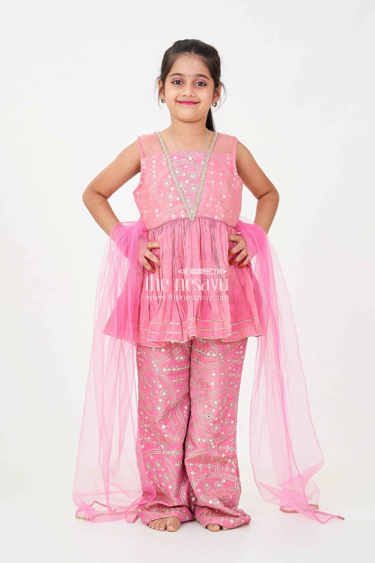 This stunning light pink sharara set from Nesavu is crafted for girls who love a bit of sparkle with their ethnic elegance. Featuring a sleeveless peplum-style top adorned with detailed embroidery and sequin highlights, this outfit is paired with matching sharara pants enriched with all-over mirror and thread work. The set comes complete with a soft dupatta and coordinating mask, making it an ideal choice for festive events, weddings, or traditional functions. Lightweight yet glamorously festive!