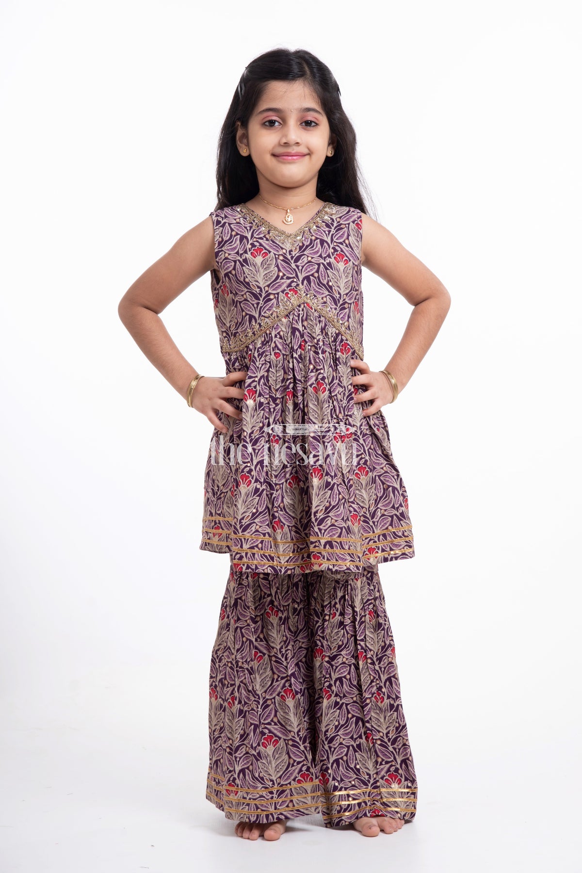 Make your little one’s Durga Puja celebrations extra special with this beautiful Nesavu Modal Silk Sharara Gharara Dress. Crafted from printed Modal Silk and adorned with intricate hand embroidery, this outfit is perfect for festive occasions. Available in sizes for girls aged 1 to 10 years, this dress combines tradition with modern style.