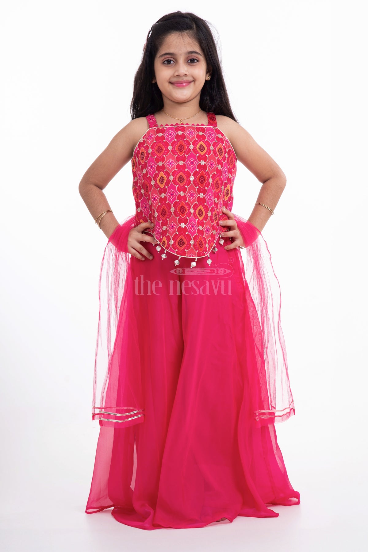 Celebrate Navratri and Diwali with this stylish Nesavu Pure Georgette Crop Top with Plazo Set for girls. Featuring a U-shaped crop top and matching plazo pants, this outfit is perfect for festive occasions. Designed for girls aged 4 to 9 years, this set offers both elegance and comfort.