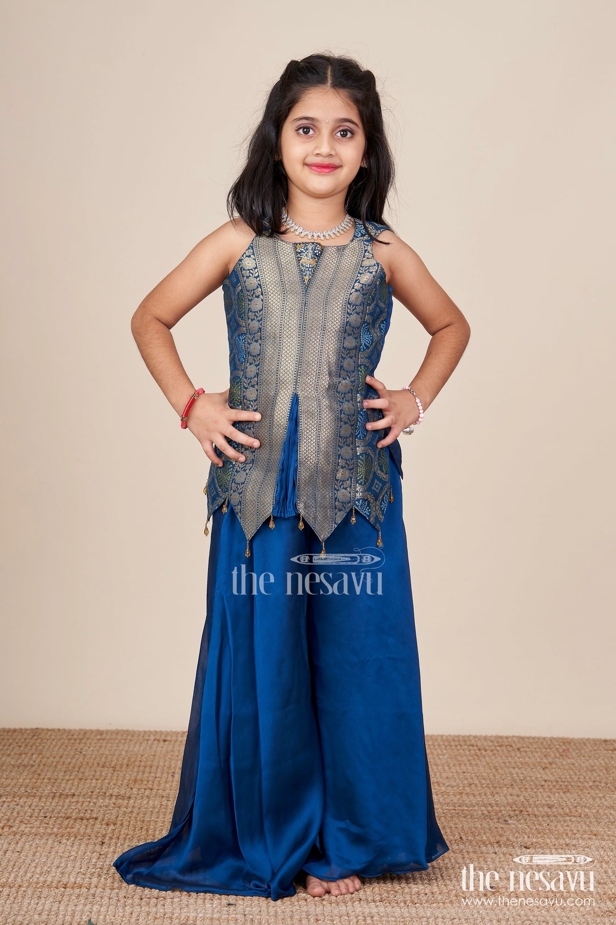 The Nesavu Girls Sharara / Plazo Set Traditional Girls Ethnic Set with Sleeveless Blouse and Flared Pants Nesavu Nesavu girls ethnic palazzo set jacquard blouse weddings cultural events
