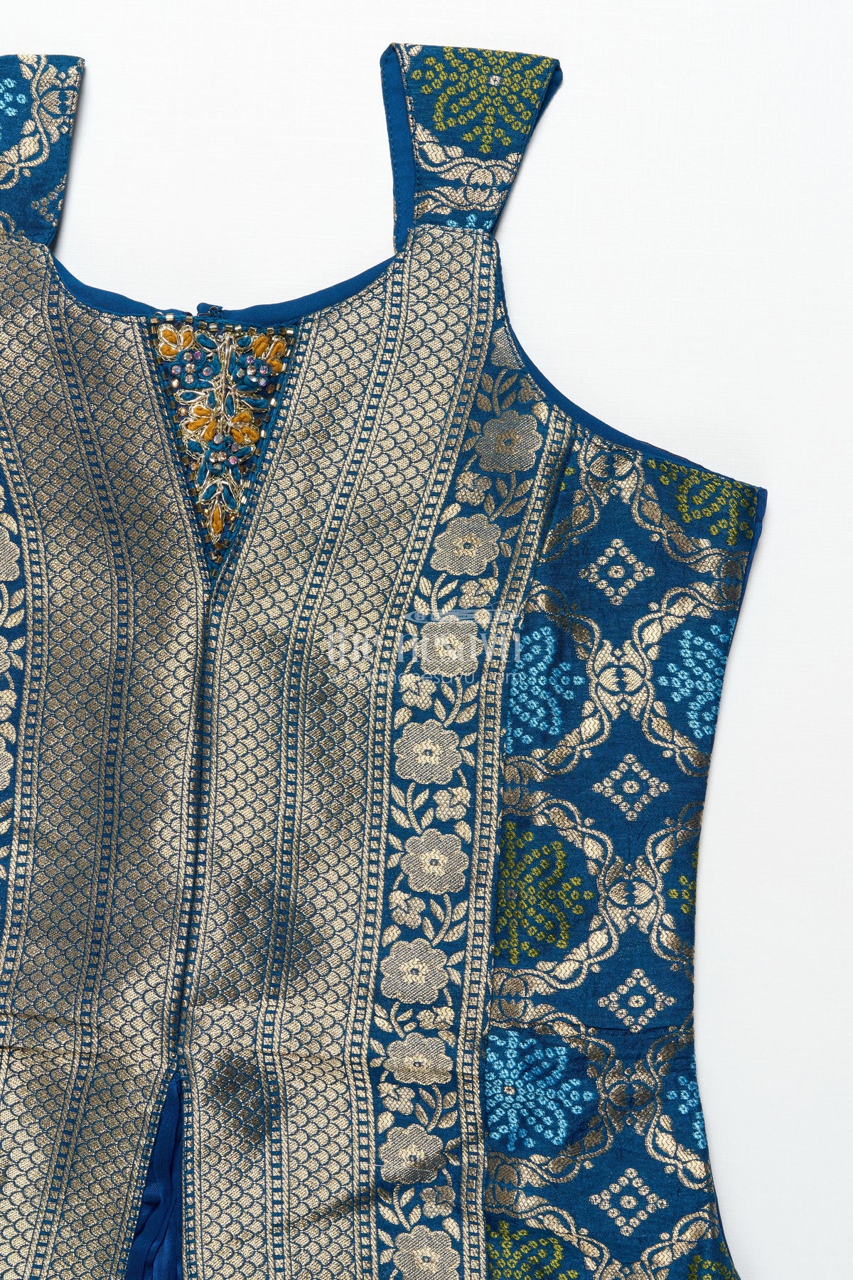 • This ethnic girls set features a sleeveless brocade-style top with detailed jacquard weave
