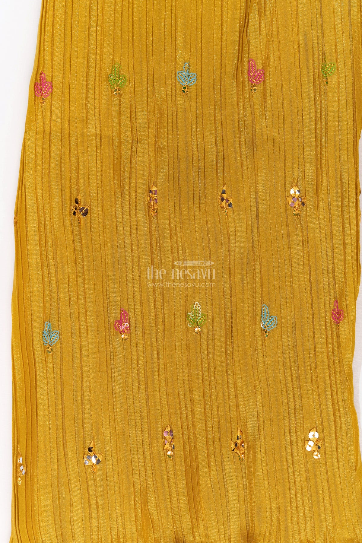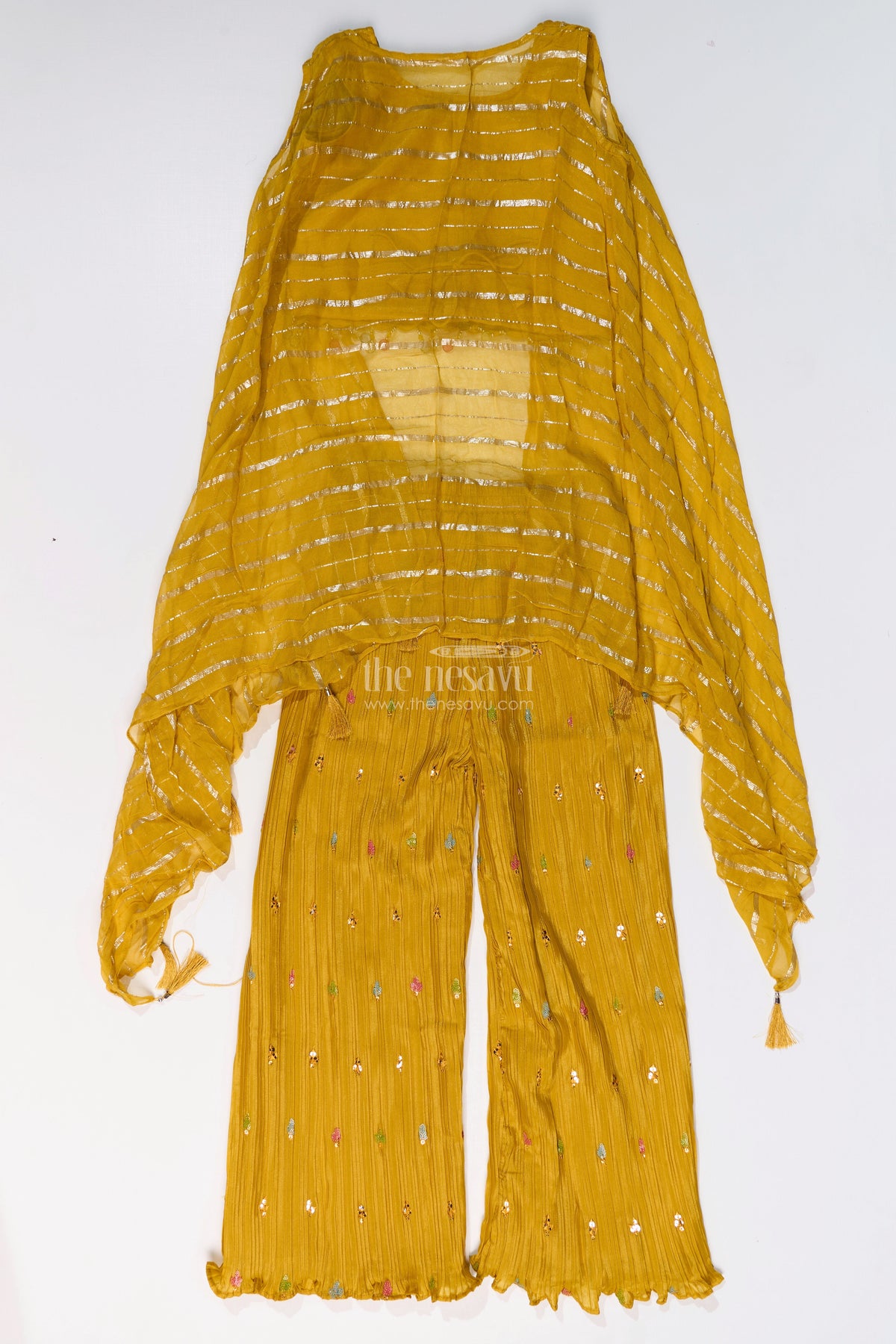 This trendy beautiful kurti plazo set for girls is a stunning combination of traditional and contemporary fashion. Made from premium georgette embroidery fabric, the set features intricate mirror work on the kurti, adding a festive sparkle. The flowing plazo pants provide a stylish yet comfortable fit, while the matching long jacket enhances the outfit’s elegance. Perfect for weddings, festive occasions, and special events, this ensemble is designed to keep your little one looking effortlessly chic. The soft, lightweight fabric ensures all-day comfort while offering a regal appeal.
