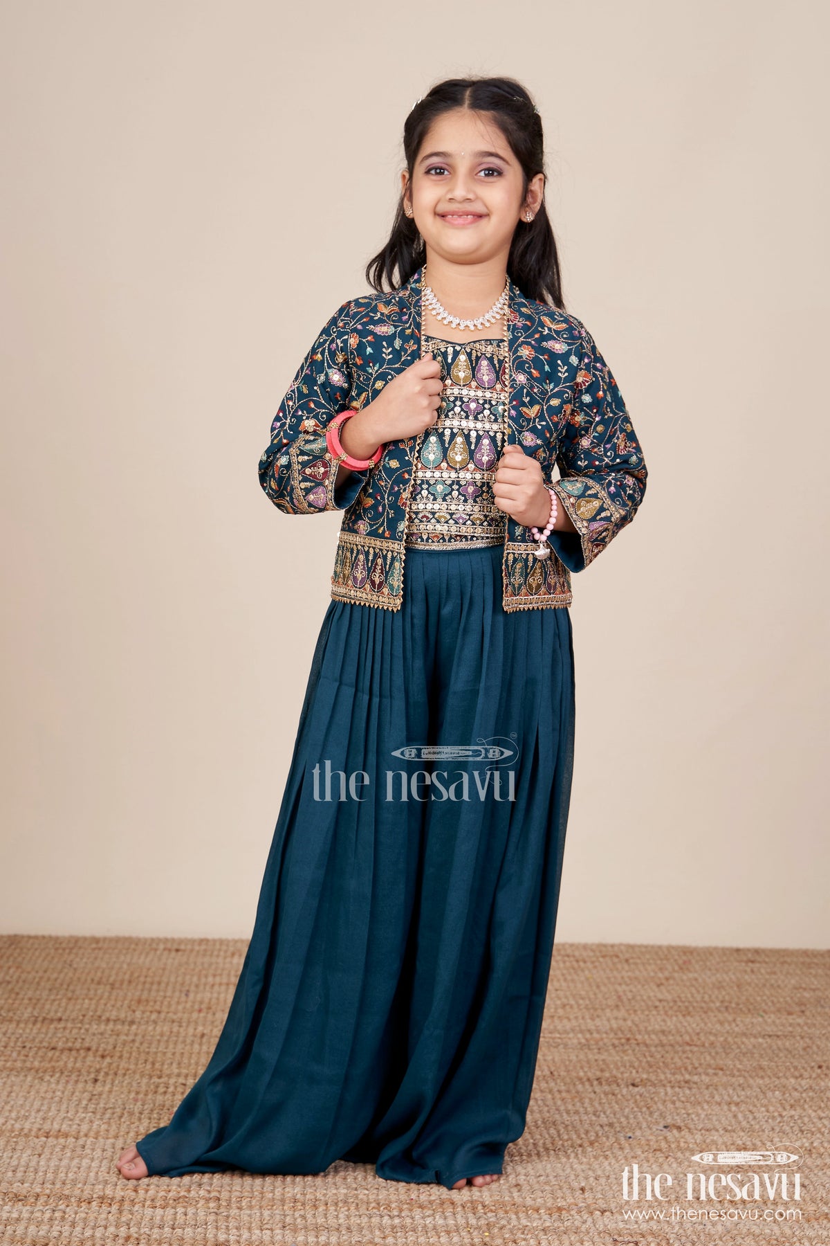 The Nesavu Girls Sharara / Plazo Set All-Over Embroidered Ethnic Co-Ord Set Traditional Charm for Girls Nesavu 26 (6Y) / Green GPS747A-26 Traditional embroidered co-ord set girls  festive plazo outfit Nesavu