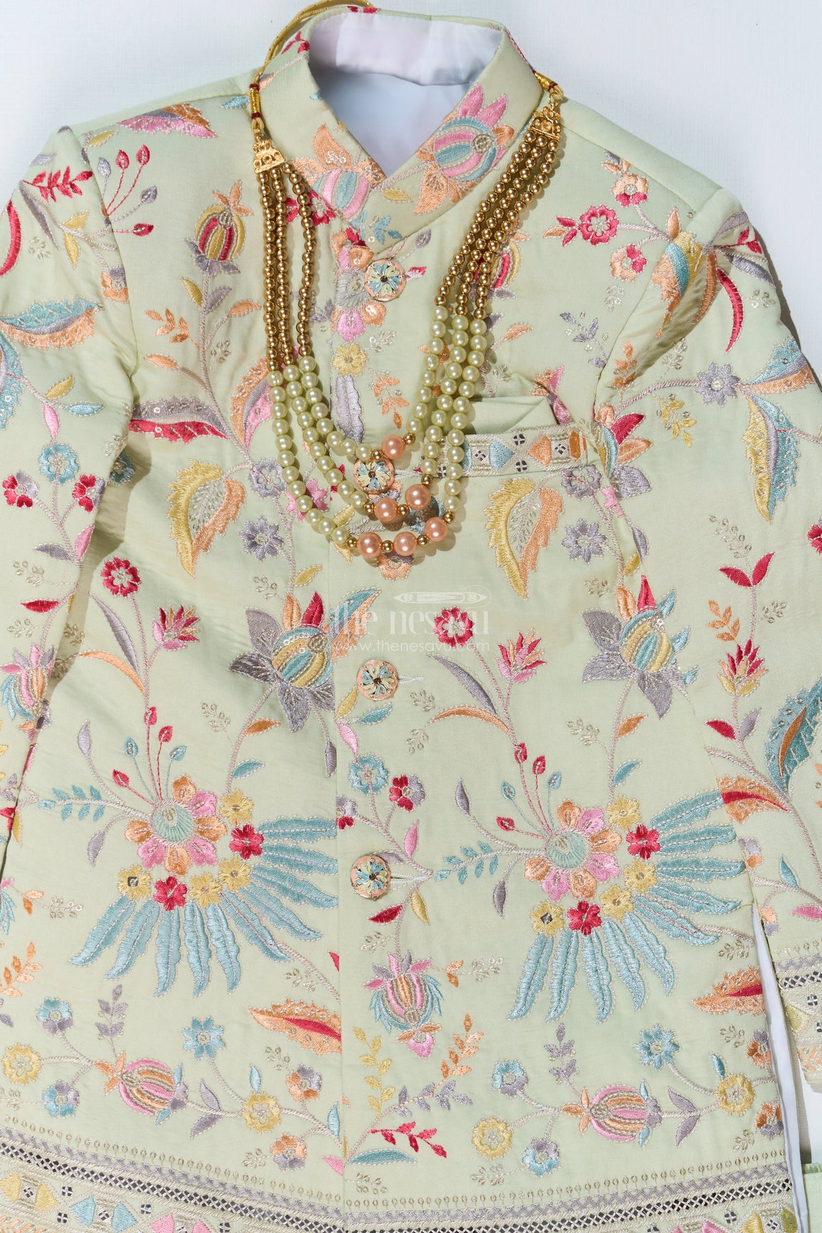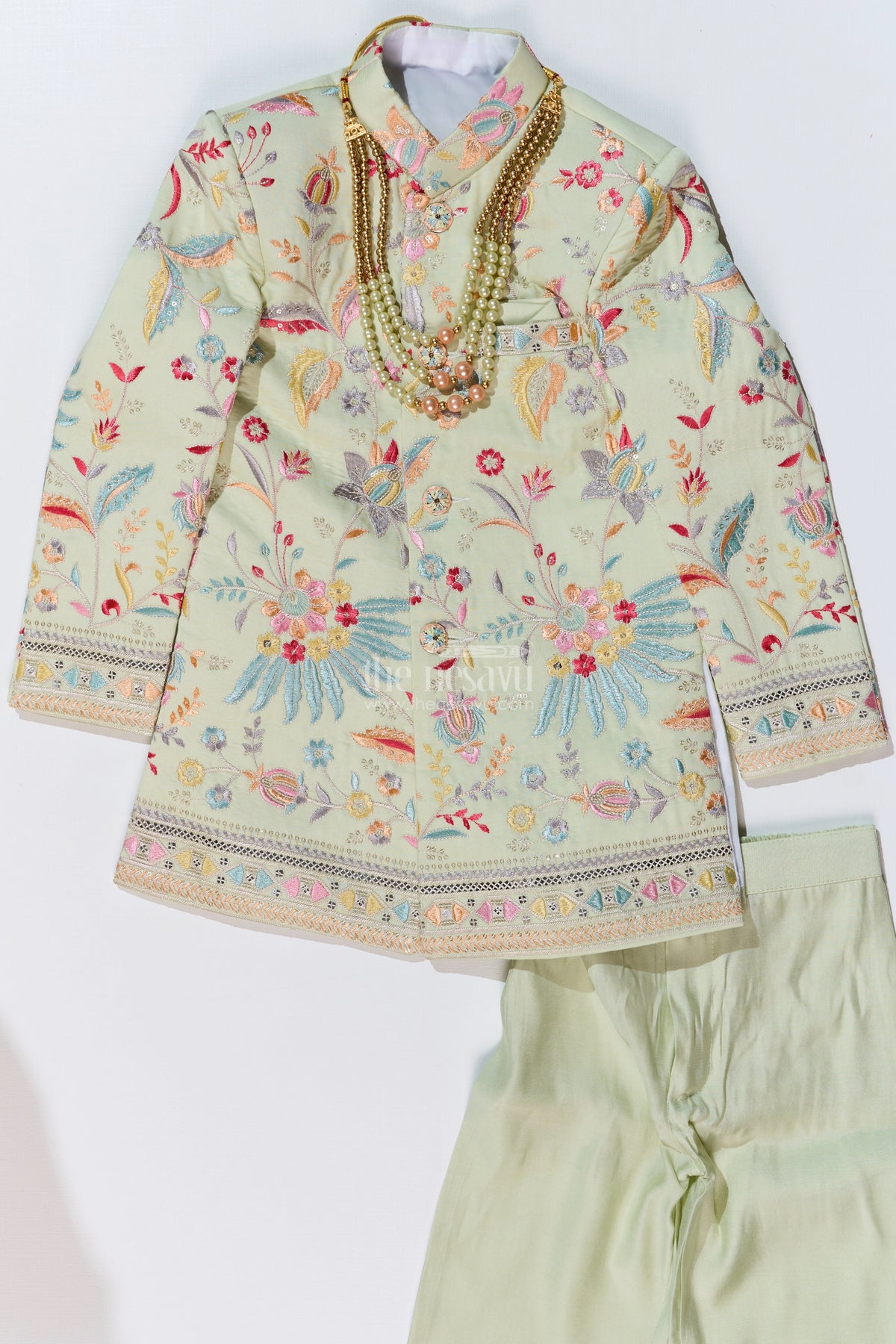 Make your little one stand out at weddings and special occasions with this designer kurta for wedding. Crafted from luxurious blended silk, this kurta set features elaborate floral embroidery with sequin accents, giving it a grand and traditional look. The full-sleeved jacket-style kurta comes with elegant handcrafted buttons, adding to its royal charm. Paired with silk pants for a sophisticated finish, this outfit is perfect for festive events, receptions, and cultural gatherings. The lightweight fabric ensures all-day comfort while keeping your child looking effortlessly stylish.
