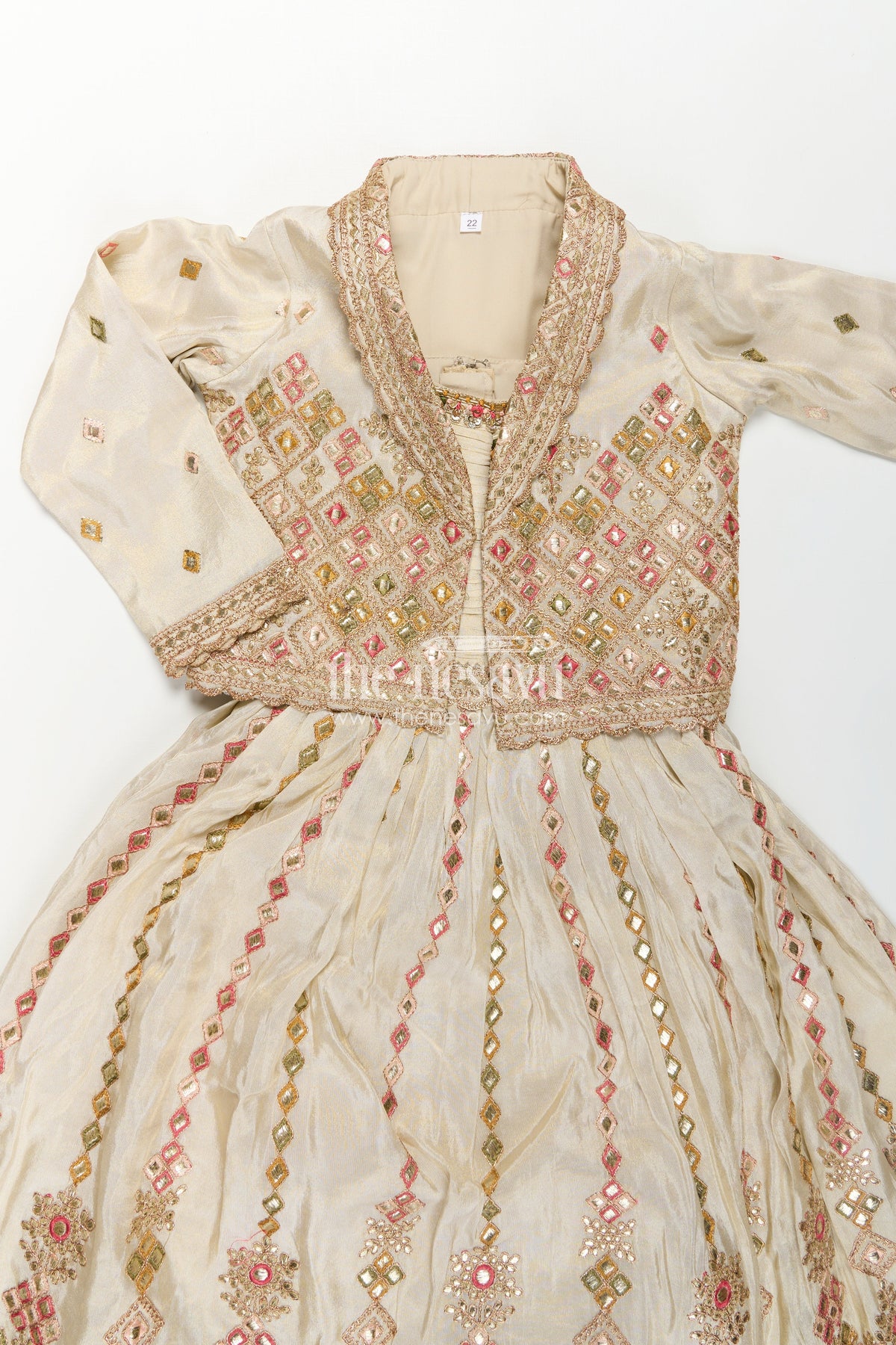 Designer anarkali takes center stage in this elegant ivory ensemble designed for girls who love refined ethnic fashion. Made from shimmer viscose silk, this anarkali gown features a structured bodice with multi-color button detailing, leading into a voluminous flared skirt embellished with intricate designer embroidery. The set includes a matching long-sleeved jacket adorned with sequins, thread work, and mirror accents, adding an extra layer of traditional opulence. Lightweight and comfortable, this outfit allows for easy movement while offering a regal silhouette. Perfect for weddings or formal celebrations, it combines sophistication and child-friendly practicality in one beautiful piece.