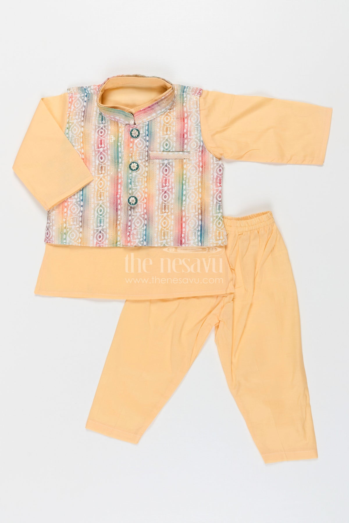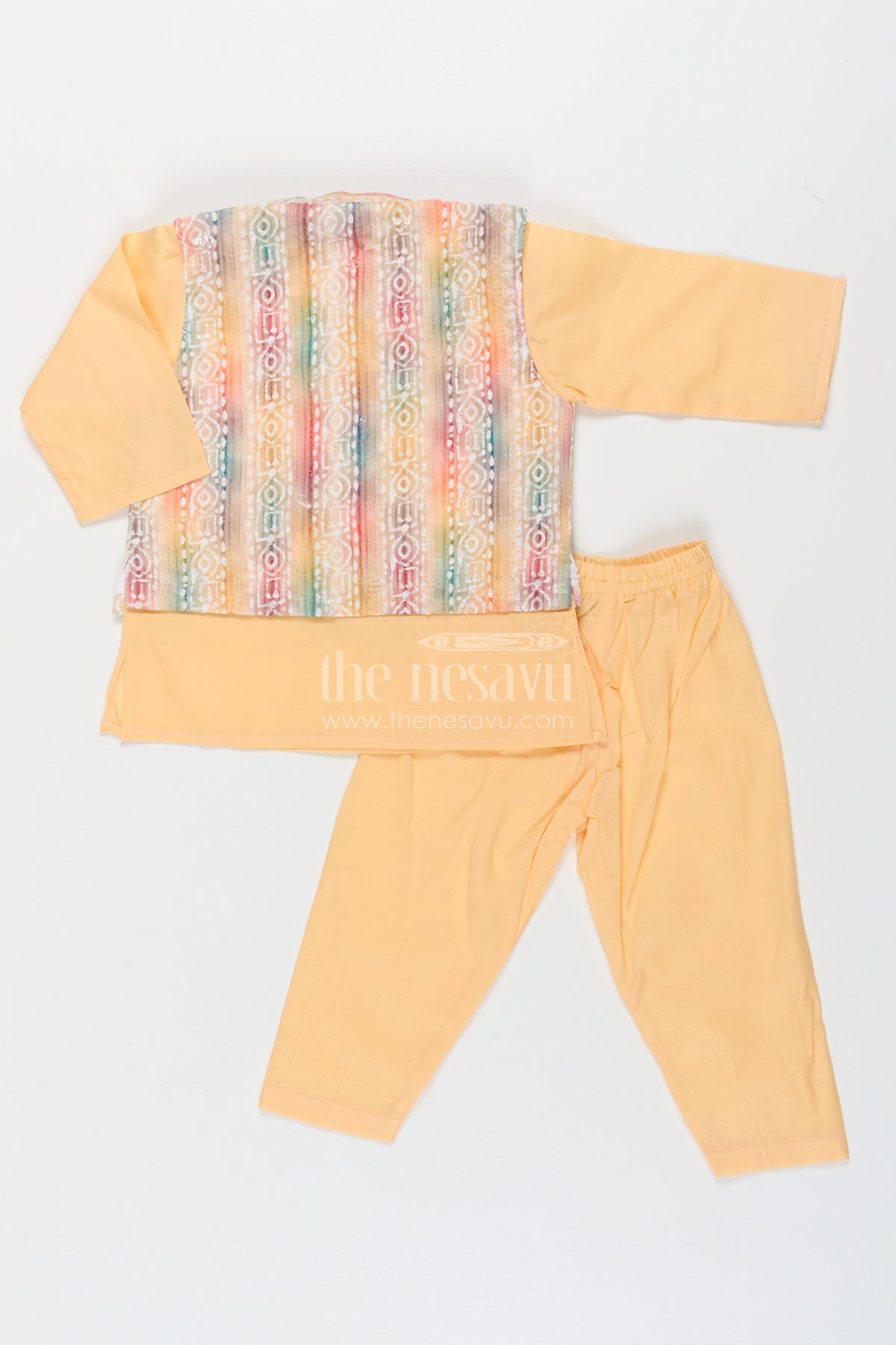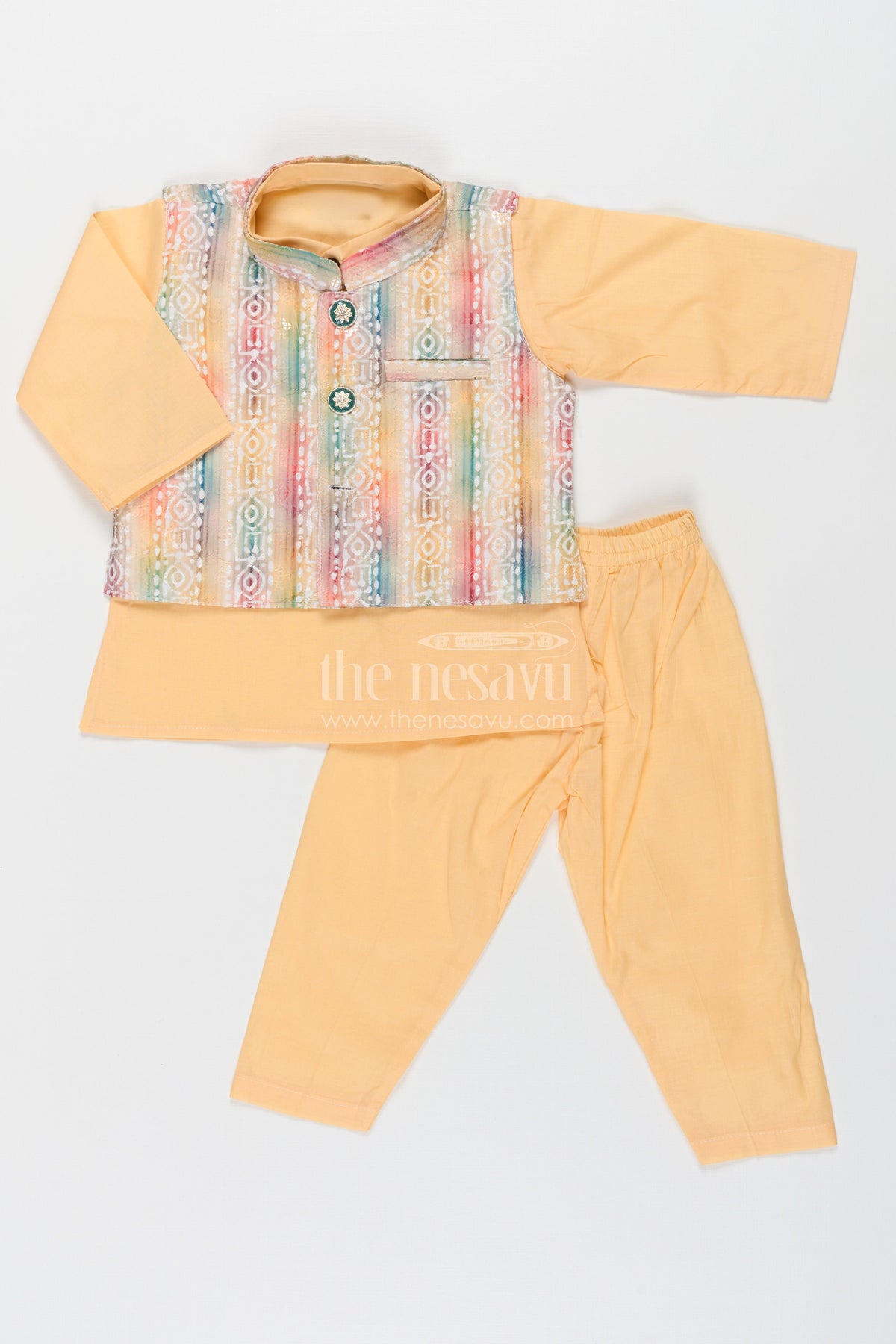 Ethnic jacket and kurta set adds a splash of joy to any festive occasion with its radiant yellow base and multicolored jacket. The kurta-pant duo in soft cotton is paired with a sleeveless jacket detailed with digital print and sparkling sequin embellishments. A stylish front button closure and vibrant Ikat-inspired patterns make this set an instant favorite for family celebrations and traditional functions. Designed with comfort and convenience in mind, this outfit lets your little one shine while feeling at ease throughout the day.