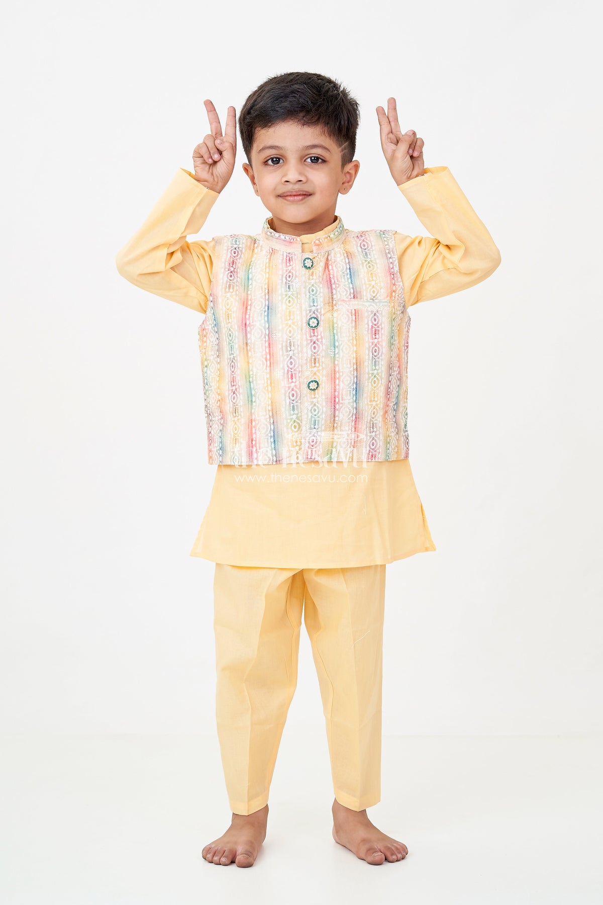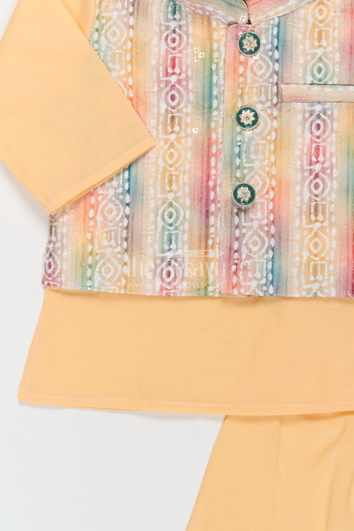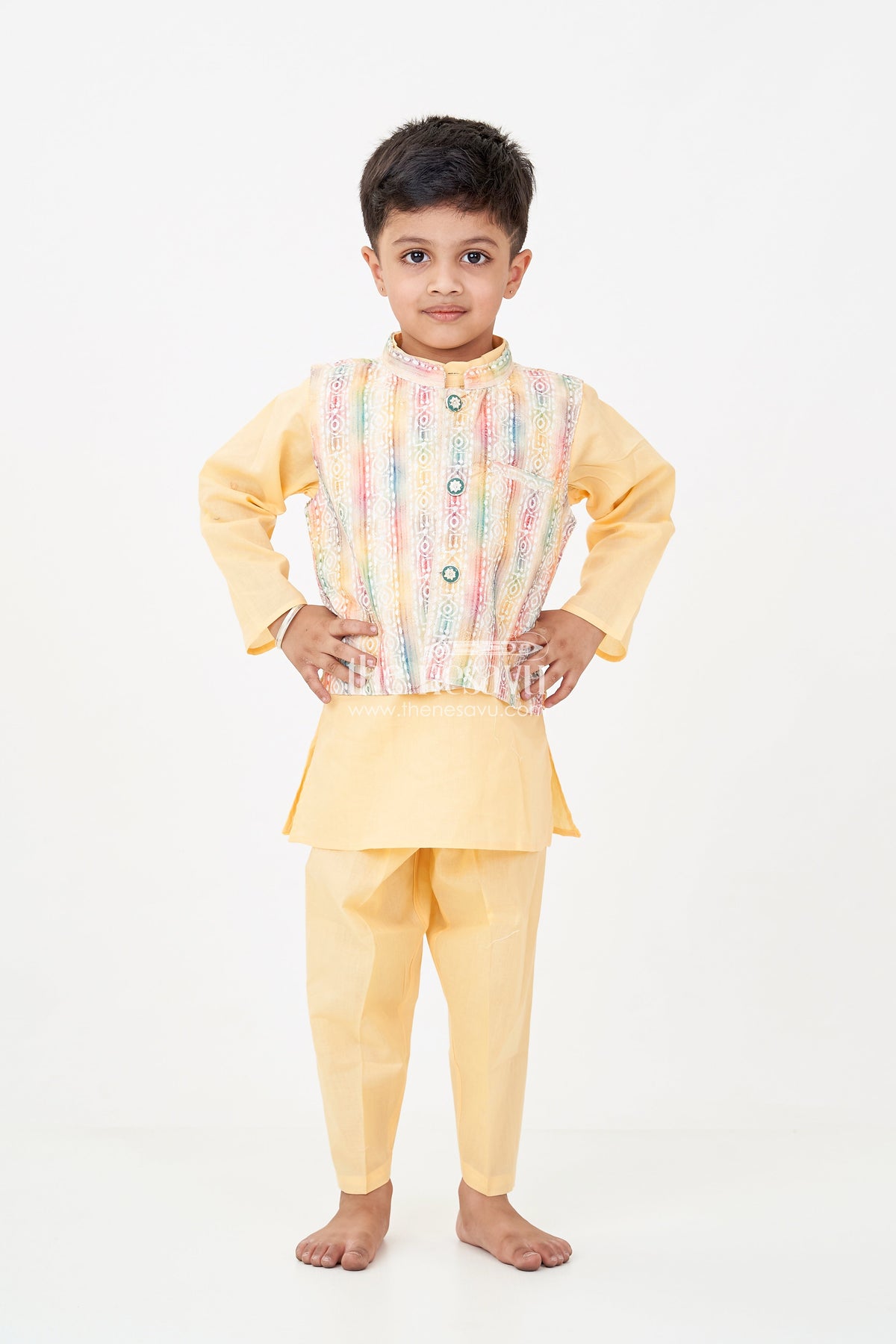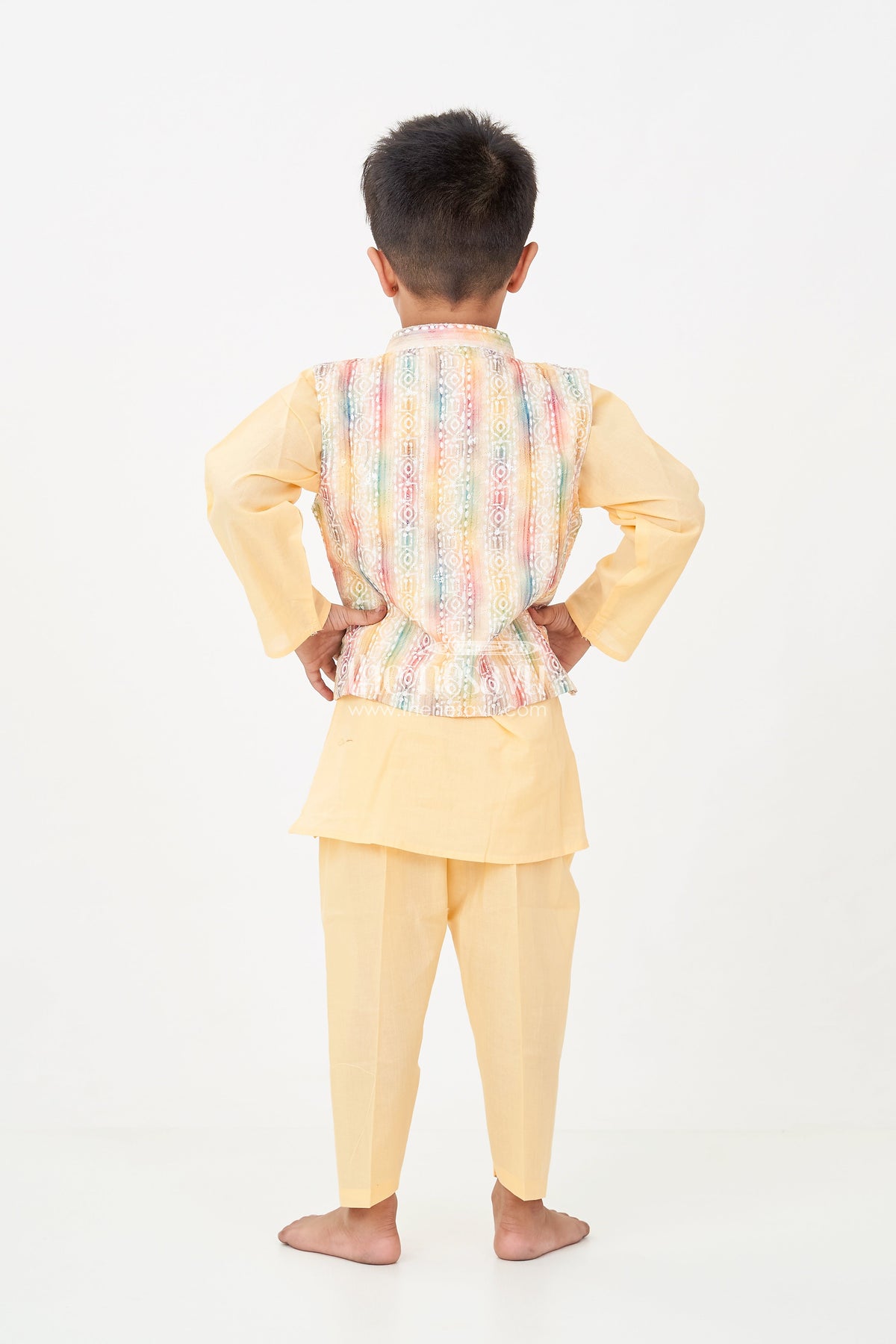Ethnic jacket and kurta set adds a splash of joy to any festive occasion with its radiant yellow base and multicolored jacket. The kurta-pant duo in soft cotton is paired with a sleeveless jacket detailed with digital print and sparkling sequin embellishments. A stylish front button closure and vibrant Ikat-inspired patterns make this set an instant favorite for family celebrations and traditional functions. Designed with comfort and convenience in mind, this outfit lets your little one shine while feeling at ease throughout the day.