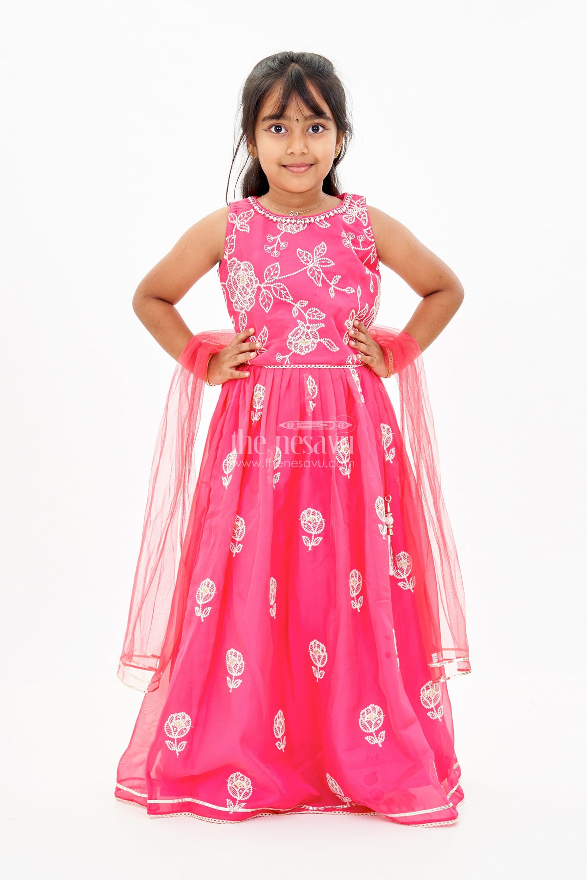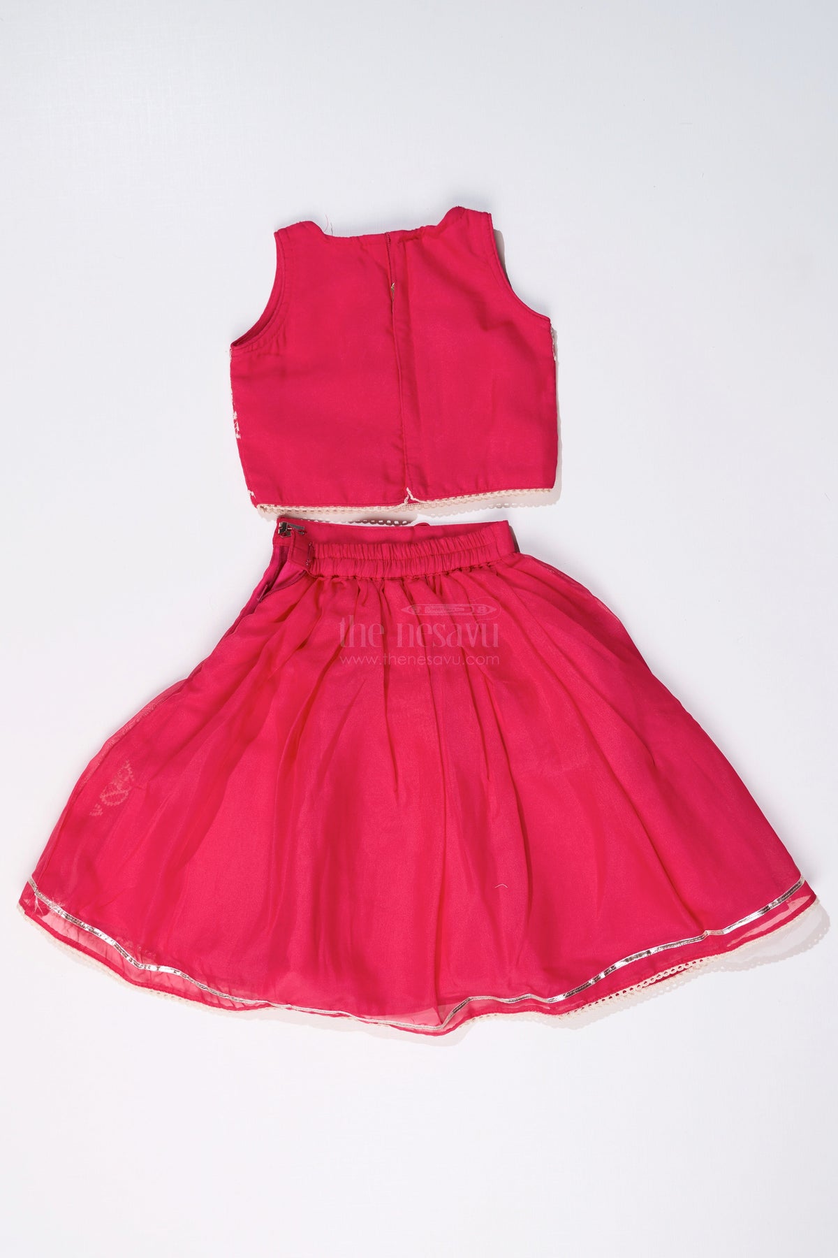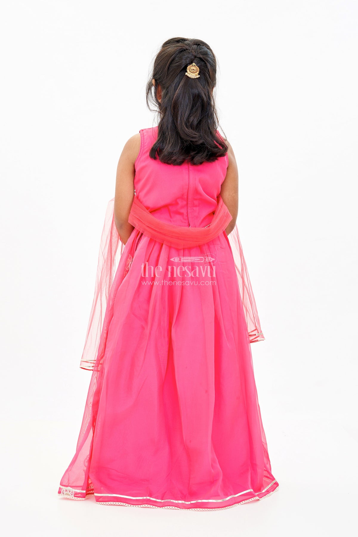 This sharara lehenga choli is a mesmerizing blend of traditional craftsmanship and modern aesthetics. Designed in rich muslin silk, the sleeveless choli is adorned with intricate gold floral embroidery and mirror embellishments. The lehenga flares out beautifully, adding a regal touch to the outfit, while the net dupatta with a shimmering gold border completes the look. Perfect for weddings, receptions, and festive occasions, this ensemble ensures your little one stands out in style.