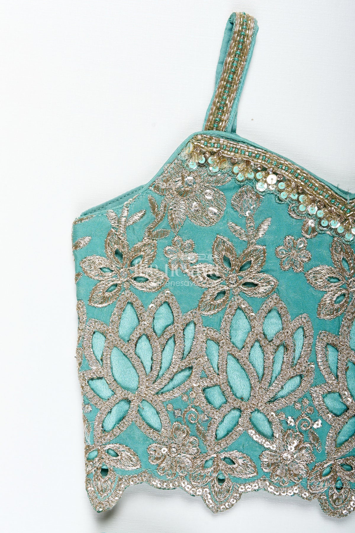 Girls Silk Lehenga transforms festive fashion with this elegant aqua blue set, beautifully constructed from pure viscose silk. The sleeveless blouse dazzles with delicate floral cutwork embroidery in gold and is adorned with pearl accents that catch the light. The lehenga skirt features light gathers and subtle golden thread motifs, giving it graceful volume without compromising comfort. Perfect for weddings or grand events, this set offers a regal look while being breathable and child-friendly. Designed to keep your little one stylish and at ease, it’s a must-have addition for any celebration wardrobe.
