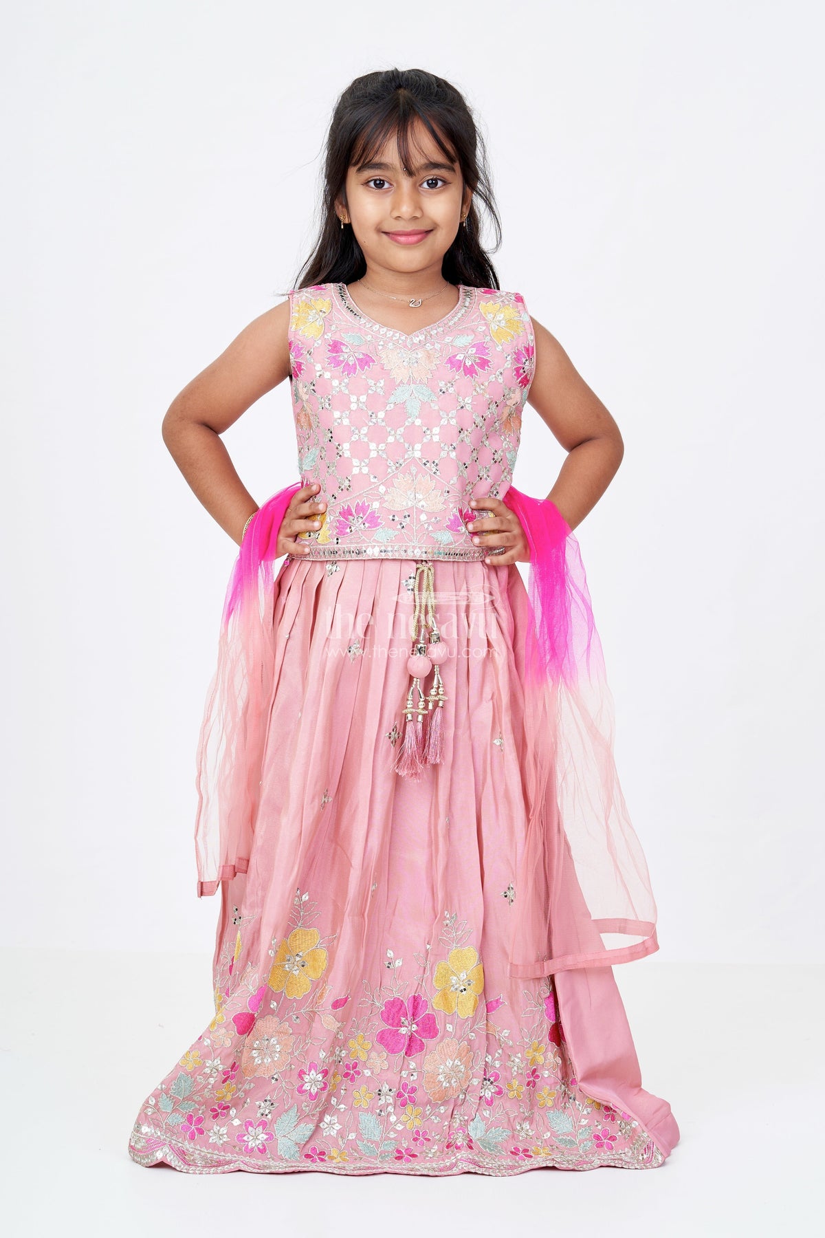 This sleeveless lehenga set is crafted from pure tissue viscose silk and brings a festive flair with its intricate designer thread embroidery and subtle mirror work. The soft pink tone paired with colorful floral detailing creates a charming and elegant ensemble for weddings, festivals, and family occasions. The sleeveless blouse features heavy embroidery, while the flowy lehenga skirt is adorned with rich floral patterns along the hem. The set is completed with a bright pink dupatta that adds a perfect contrast. Lightweight, breathable, and beautifully finished, this lehenga ensures your little girl feels like royalty.