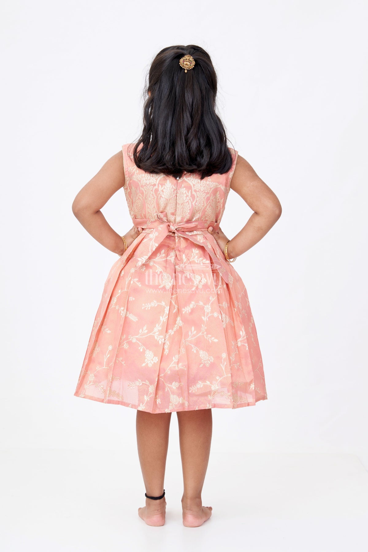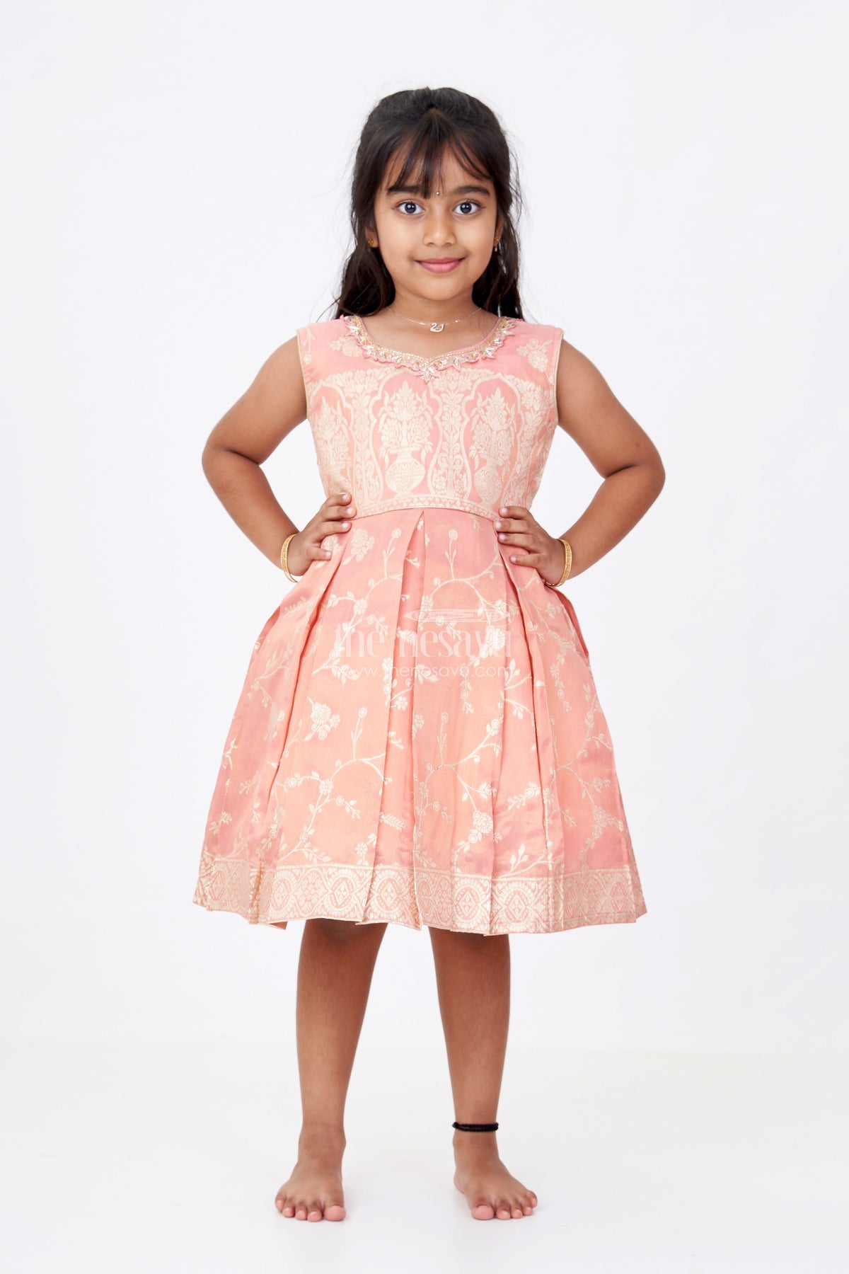 This beautiful short silk frock is a delightful blend of elegance and tradition, making it perfect for festive occasions. Crafted from luxurious gold tissue Banarasi jacquard silk blend, this frock features an intricately embroidered yoke that adds a royal touch. The flared skirt with gold zari patterns enhances its regal appeal, ensuring your little one stands out in celebrations. The sleeveless design and soft fabric provide comfort while maintaining a stylish silhouette. Whether for family gatherings, cultural events, or traditional functions, this silk frock is a must-have in your child’s wardrobe.