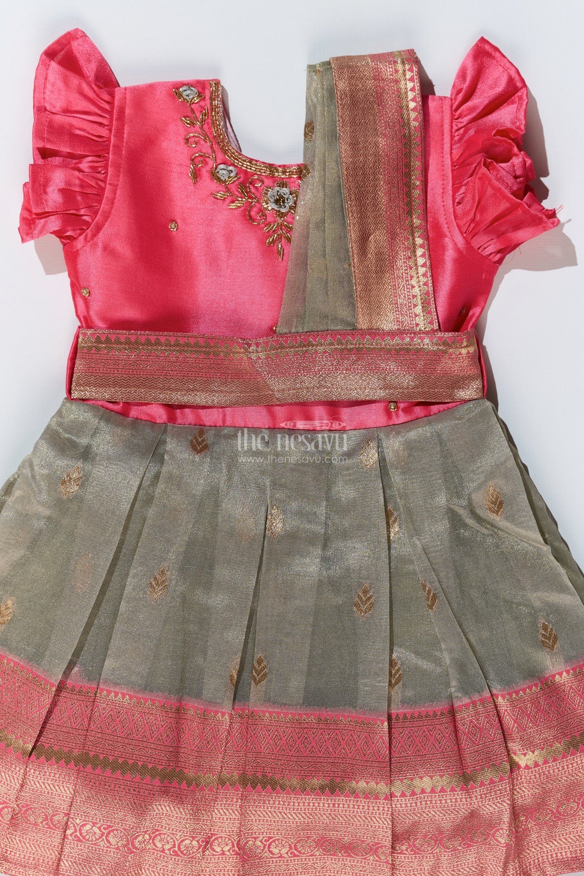 This stunning silk blend dress is designed to bring out the beauty and grace of your little one. Made from premium blend silk with a rich tissue bottom, this dress features a finely embroidered bodice, ruffled sleeves, and a pleated skirt with intricate zari borders. The traditional yet stylish design makes it an excellent choice for festive occasions, weddings, and family gatherings. The lightweight fabric ensures comfort, while the back tie-up adds a touch of elegance. Pair it with matching accessories to complete the perfect festive look.