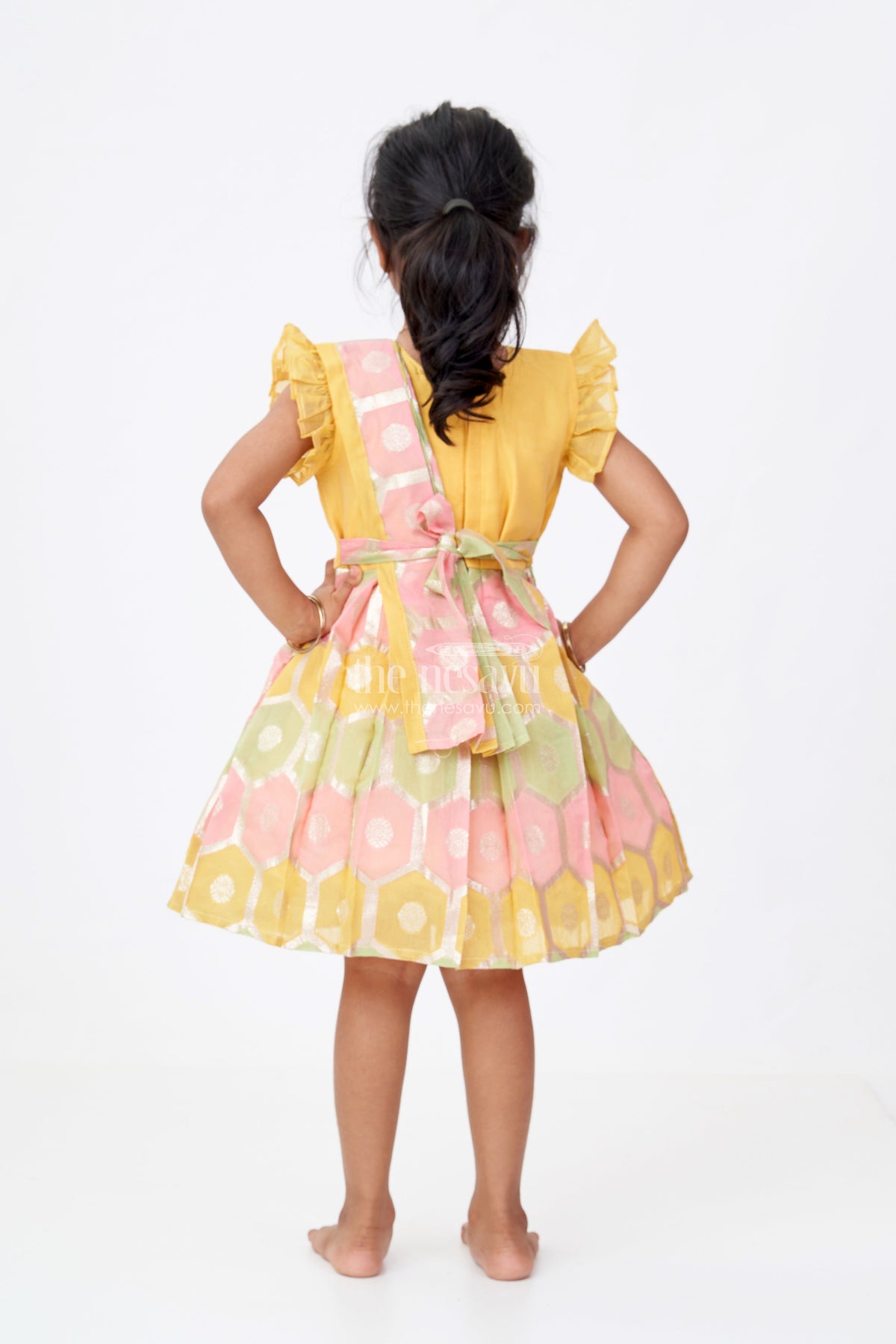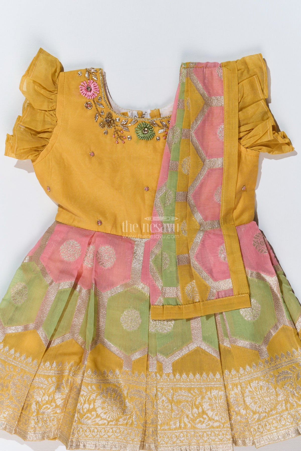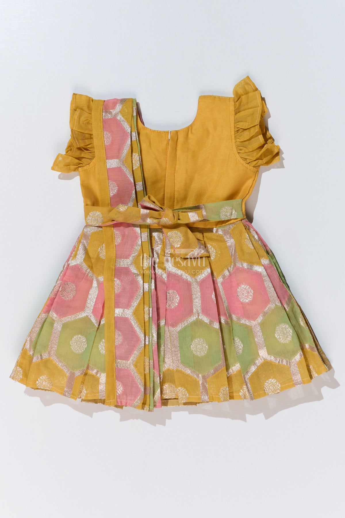 This exquisite silk saree frock is a perfect blend of tradition and style for your little princess. Crafted from premium blend silk with a rich tissue bottom, this frock features an elegant pleated skirt adorned with intricate zari work, resembling the grace of a classic silk saree. The mustard yellow bodice is beautifully embroidered with floral patterns, adding a touch of festive charm. The ruffled sleeves enhance its playful appeal, while the attached dupatta completes the ethnic look. Designed for comfort and elegance, this frock ensures your child feels light and free while looking stunning at weddings, temple visits, or family gatherings. With a back zip closure for easy wear, this dress is an ideal choice for special occasions.