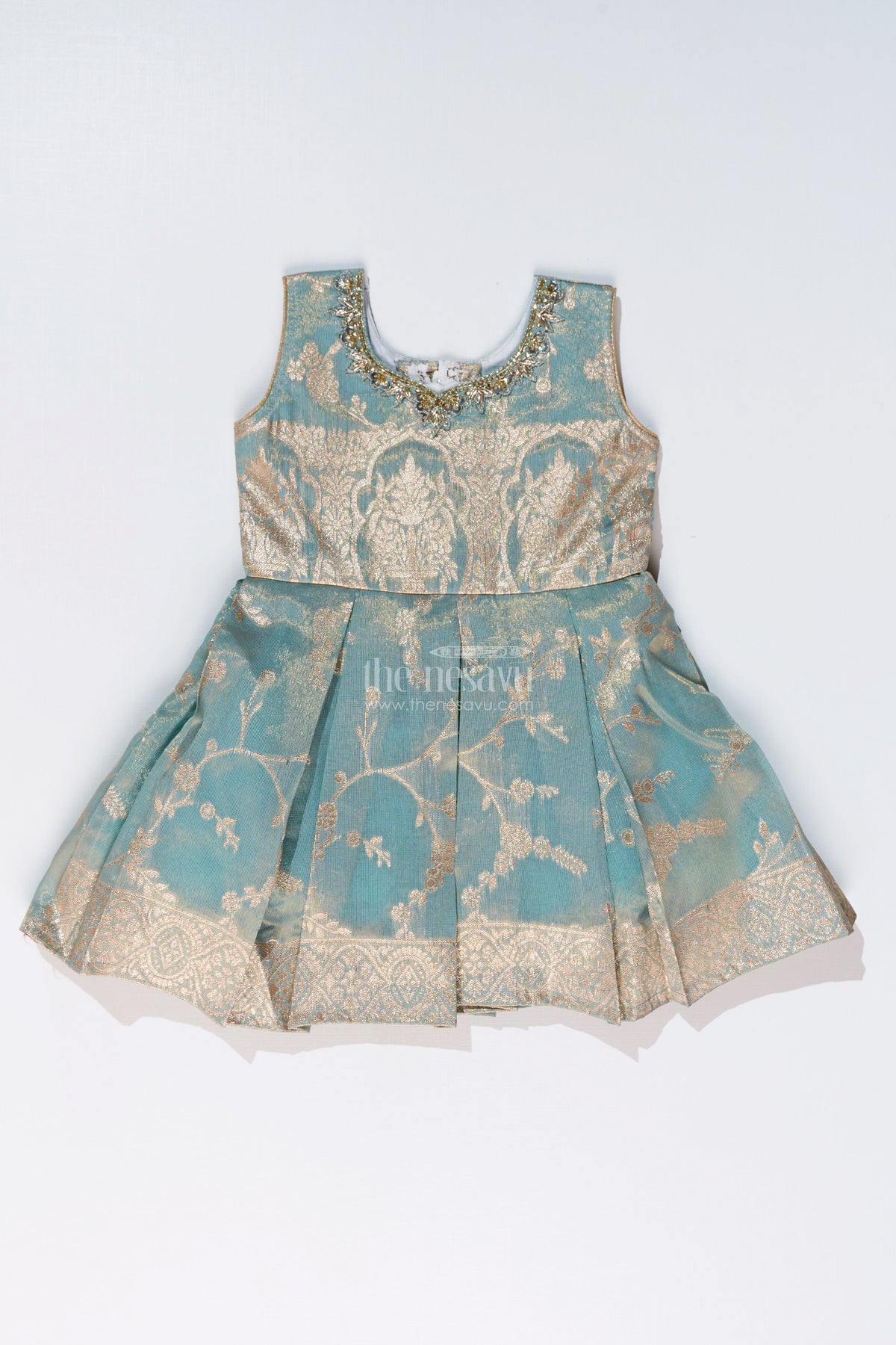 This gorgeous blue silk frock is a perfect combination of elegance and comfort. Made from luxurious gold tissue Banarasi jacquard silk blend, this dress features intricate golden zari motifs and a delicately embroidered yoke for a touch of sophistication. The flared skirt adds charm and movement, making it ideal for festive occasions and traditional celebrations. Designed with a sleeveless silhouette for added comfort, this outfit is a timeless addition to your little one's ethnic collection.