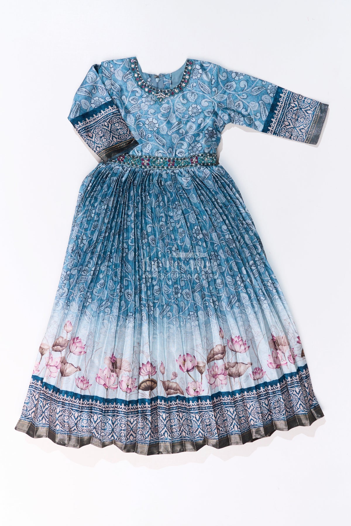 Let your little one shine in this stunning glitter gown for girls, designed with an enchanting Pichwai-inspired print on luxurious semi raw silk. The intricate floral motifs and shimmering embellishments give this gown a regal appeal, making it perfect for festive occasions and grand celebrations. The pleated skirt enhances the volume and flow, creating a princess-like silhouette. The gown features full sleeves with exquisite border detailing and a delicately adorned neckline that adds a touch of sophistication. Lightweight yet rich in texture, this dress offers both comfort and elegance, ensuring your child looks and feels special at any event.