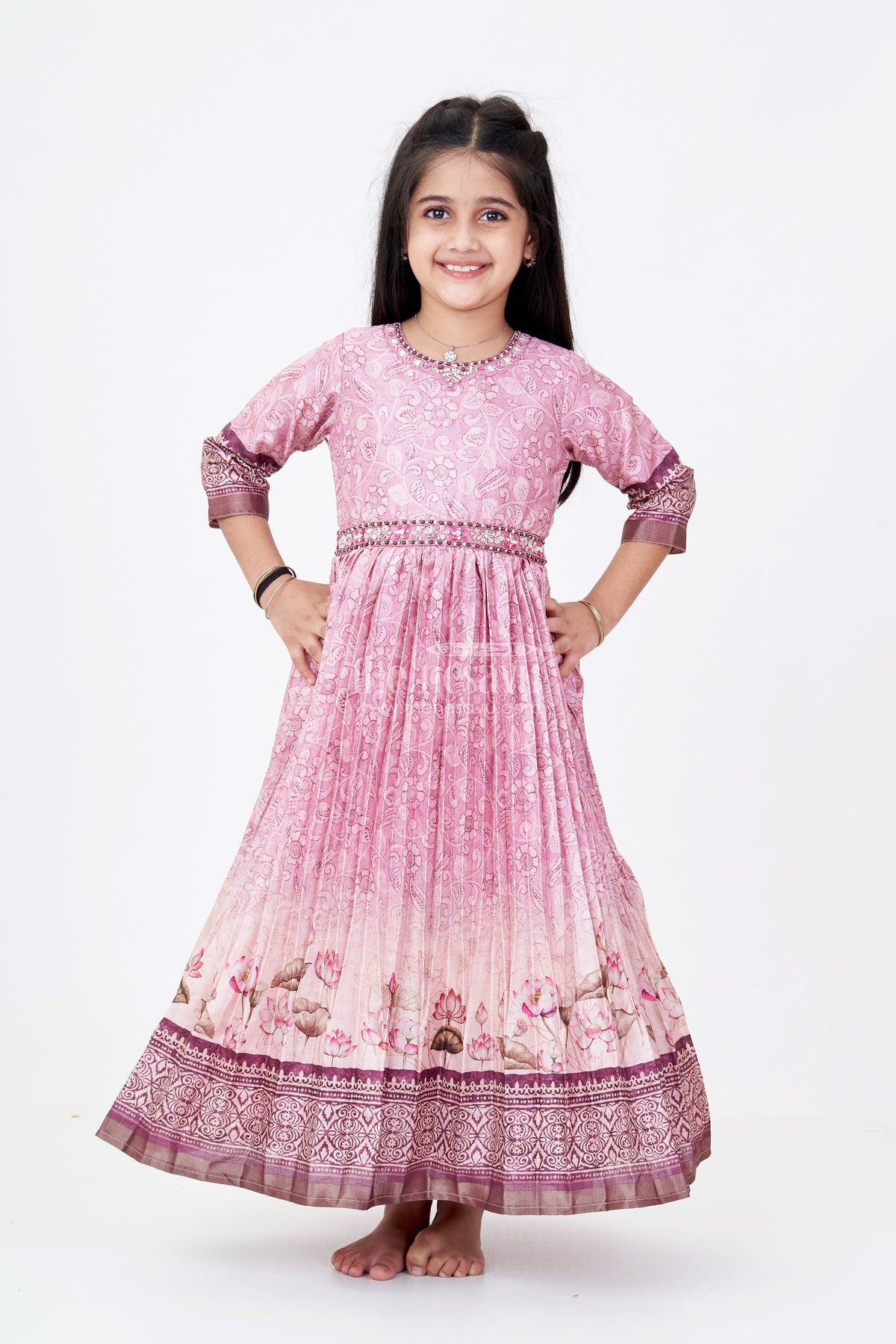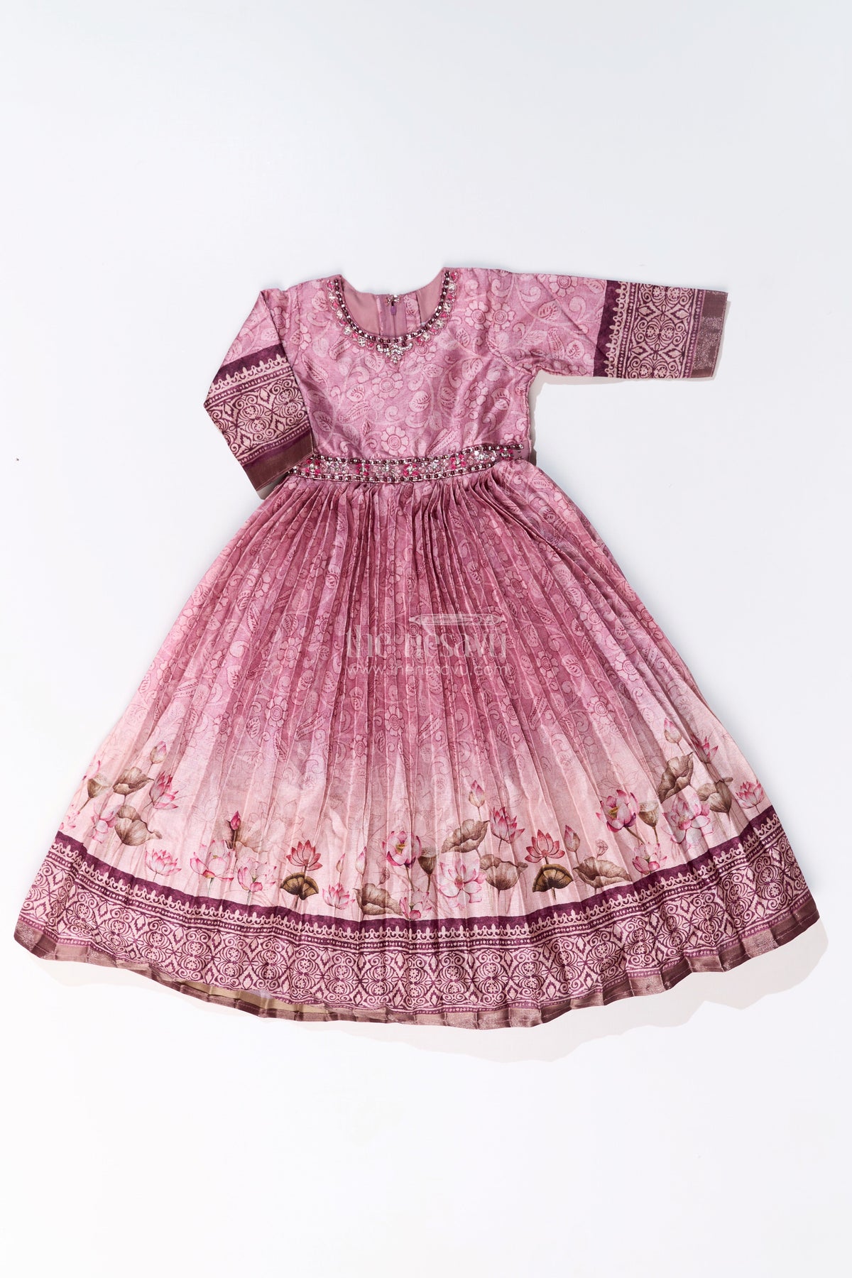 The Nesavu Girls Party Gown Exquisite Gown for Wedding Party with Pichwai Theme Semi Raw Silk and Embellished Waistline Nesavu 24 (5Y) / Pink GA295B-24 Exquisite Gown Wedding Party Pichwai Theme Semi Raw Silk Embellished Waistline | The Nesavu
