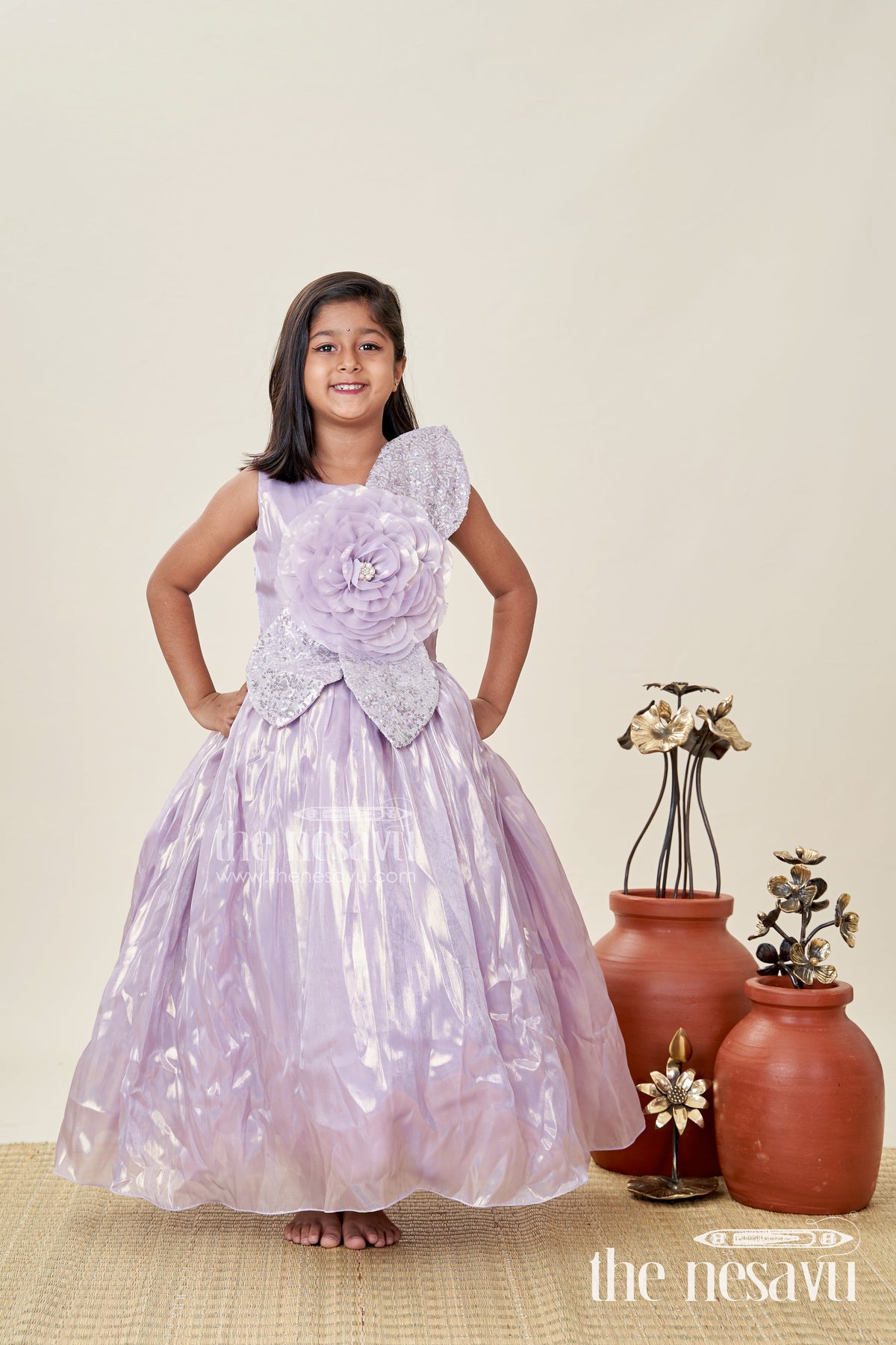 The latest design long frock from Nesavu captures elegance in every stitch. This stunning girls party frock features a flowing silhouette crafted from glossy lavender glaze organza, perfect for twirling and celebrating. The bodice is beautifully highlighted with large sequin-embellished leaf motifs and a soft 3D floral applique, making it a show-stopper for any special gathering. Lightweight and breathable, it ensures comfort while delivering maximum visual impact. The sleeveless cut and long flare offer a graceful fit, making it a top pick for festive events, functions, and elegant occasions. Let your little one step into a dreamy look with this gorgeous new arrival.