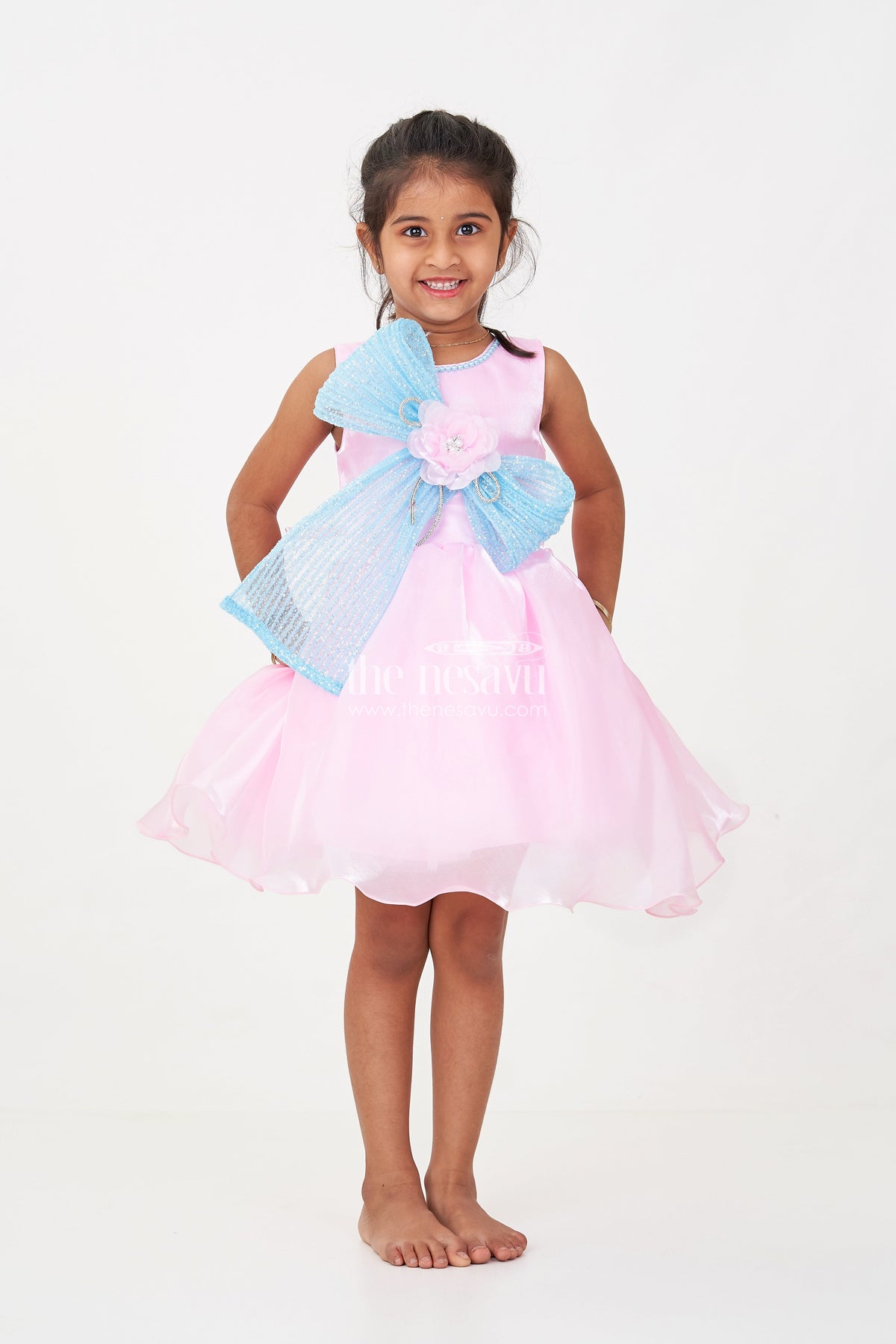 Turn your little princess into the star of any occasion with this dazzling pink net frock from Nesavu. Crafted from glossy glazed organza, this frock features soft pink layers that flow beautifully with every twirl. A sparkly teal-blue bow with glitter detail and a central floral applique adds a charming contrast at the waist. The sleeveless bodice and flared silhouette make it a perfect choice for birthday parties, photoshoots, or any special celebration. Lightweight, elegant, and festive-ready, this frock ensures both style and comfort for your girl.