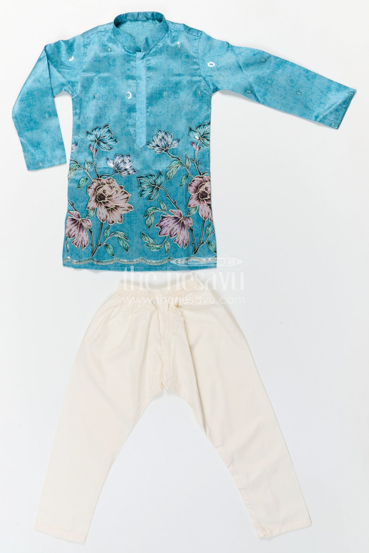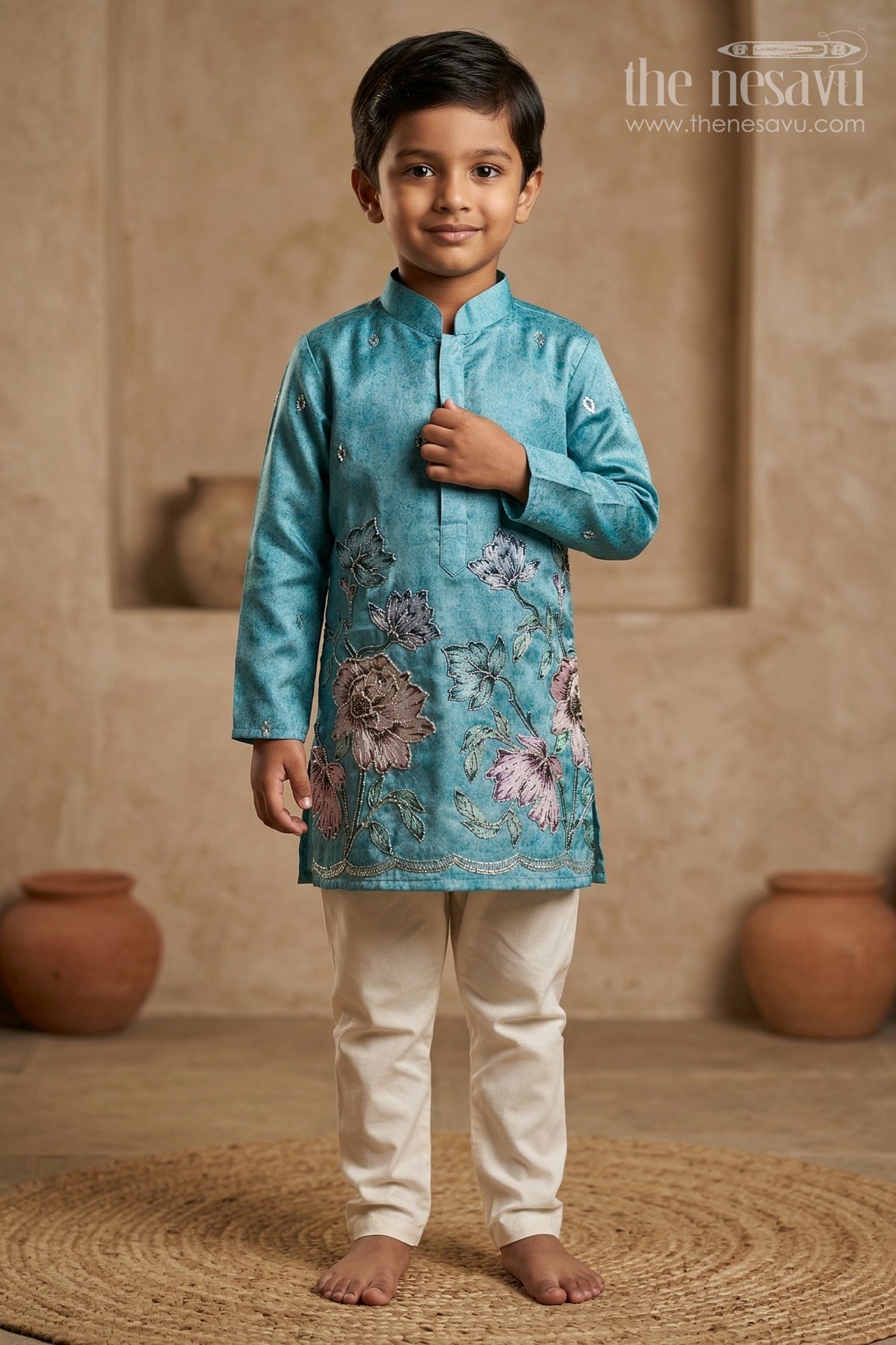 The Nesavu Boys Kurtha Set Boys Kurta Set for Weddings and Festive Celebrations Nesavu Nesavu Boys Green Kurta Set In Viscose Silk With Embroidery For Weddings And Festive Celebrations