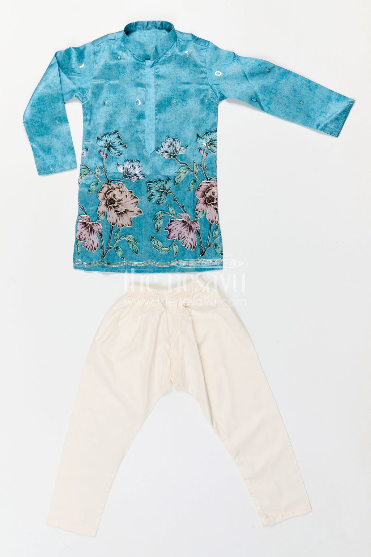• This boys kurta set for weddings is crafted in viscose blend silk with elegant embroidery detailing