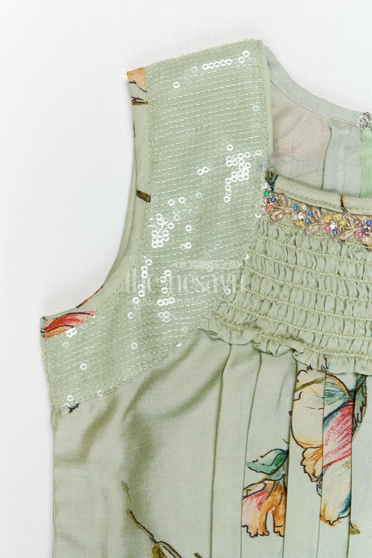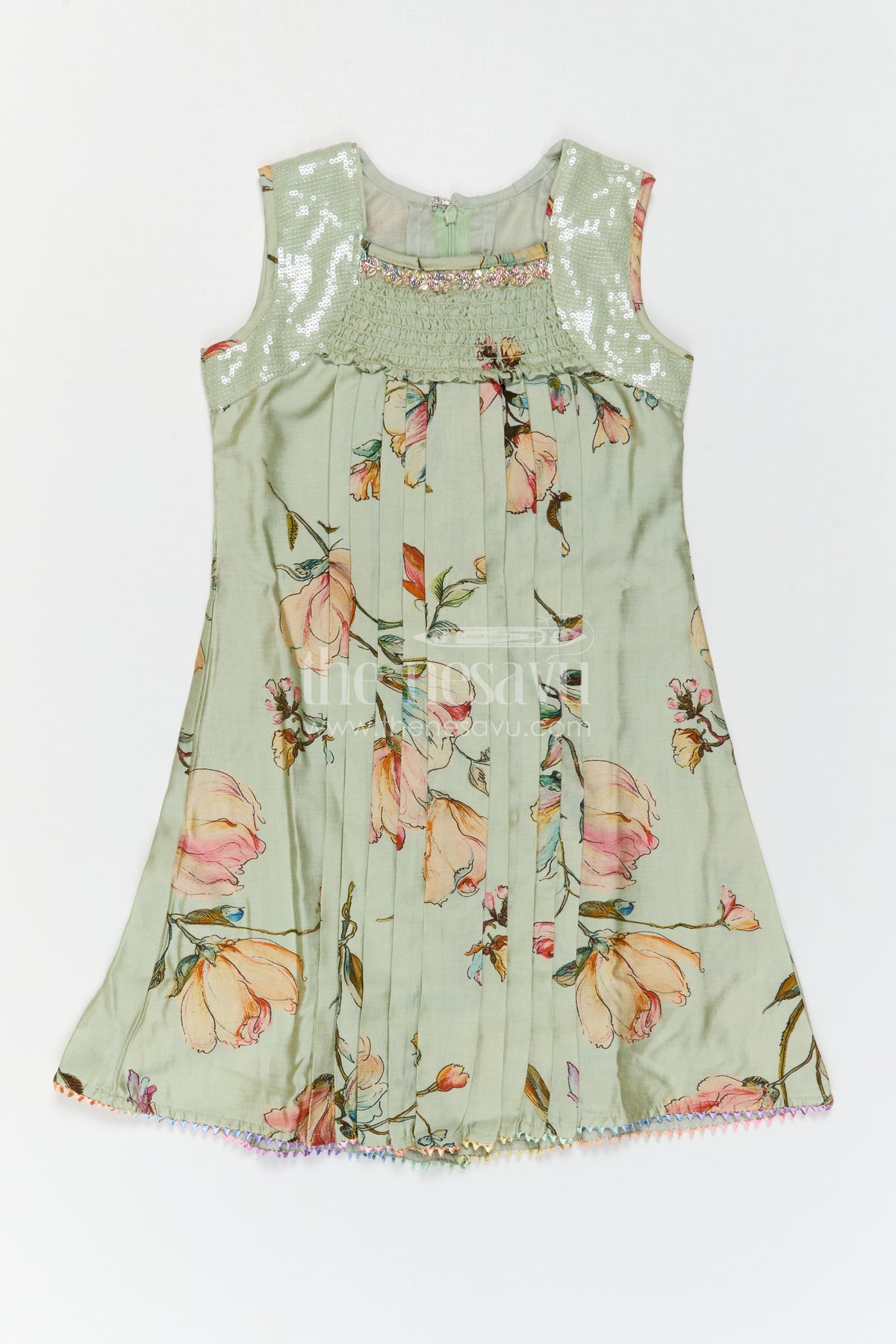 • Design: Floral print, Pleated front, Flared frock