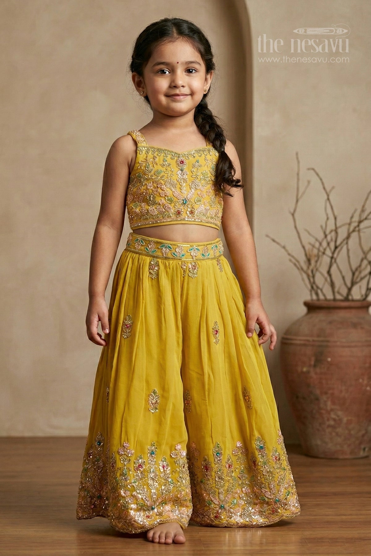 The Nesavu Girls Sharara / Plazo Set Girls Sharara for Festive Celebrations and Wedding Functions Nesavu 18 (2Y) / Yellow / Georgette GPS996B-18 Nesavu girls georgette sharara set with designer embroidered yoke for weddings and festive occasions