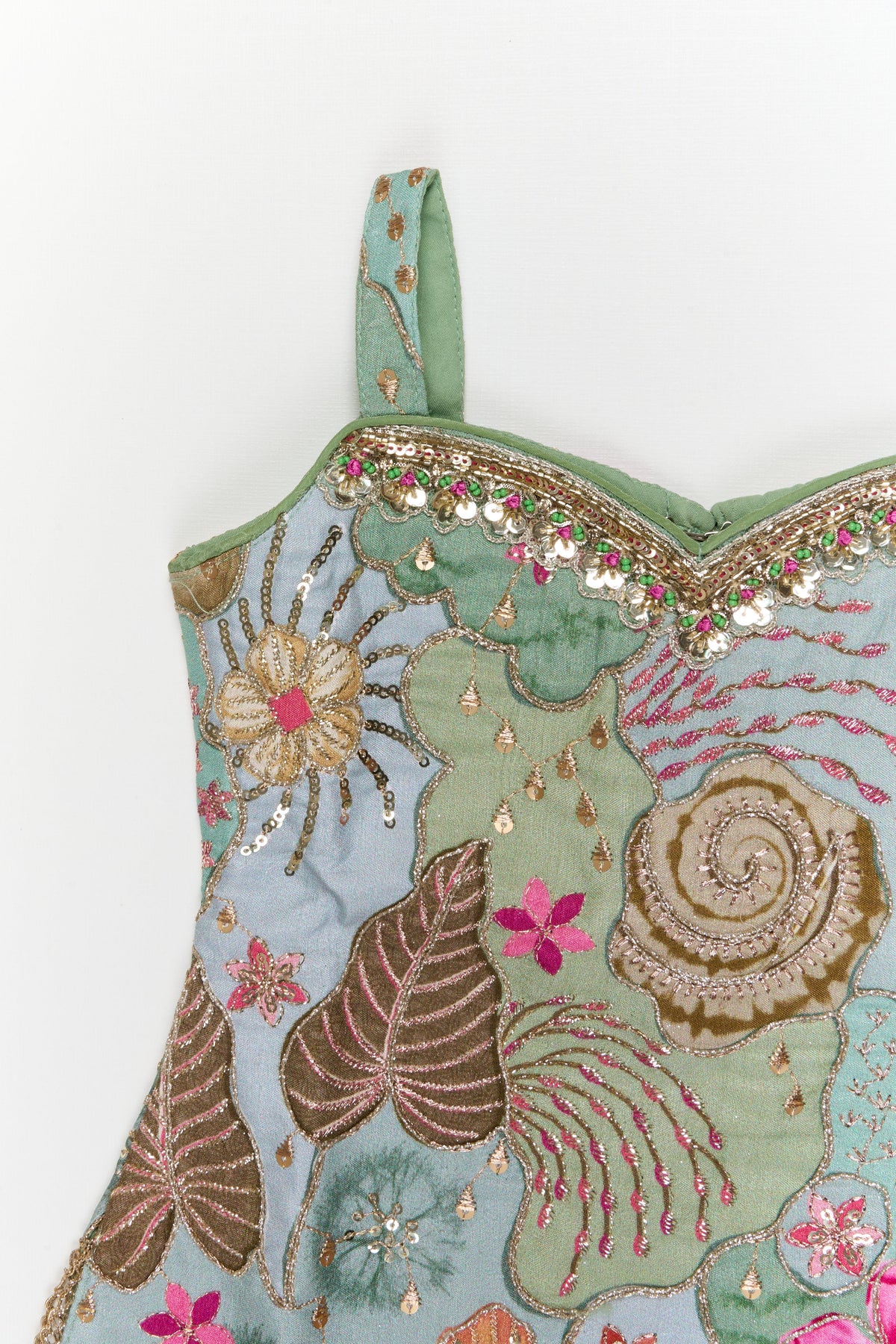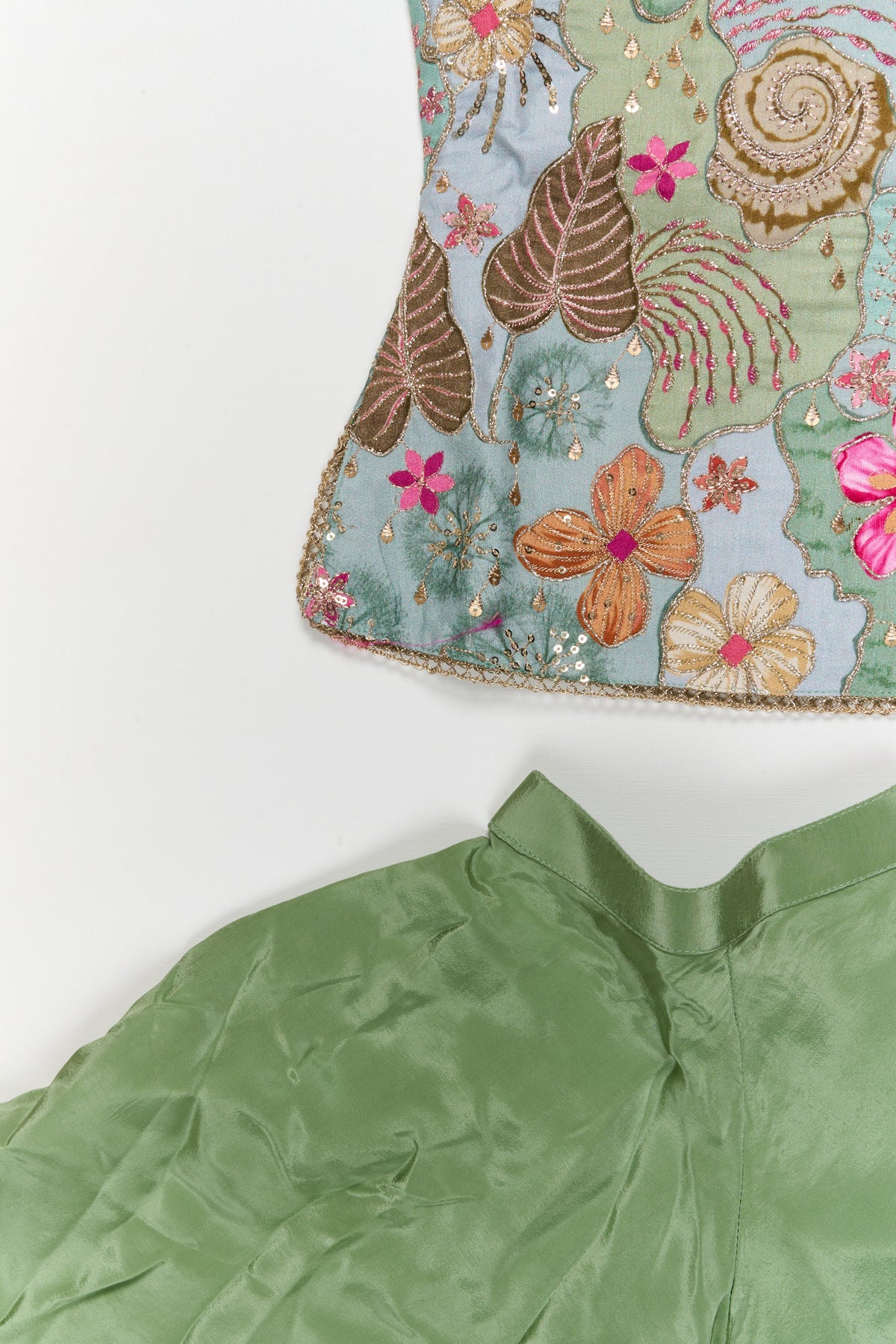 • The sleeveless blouse features intricate yoke embroidery with floral and leaf motifs