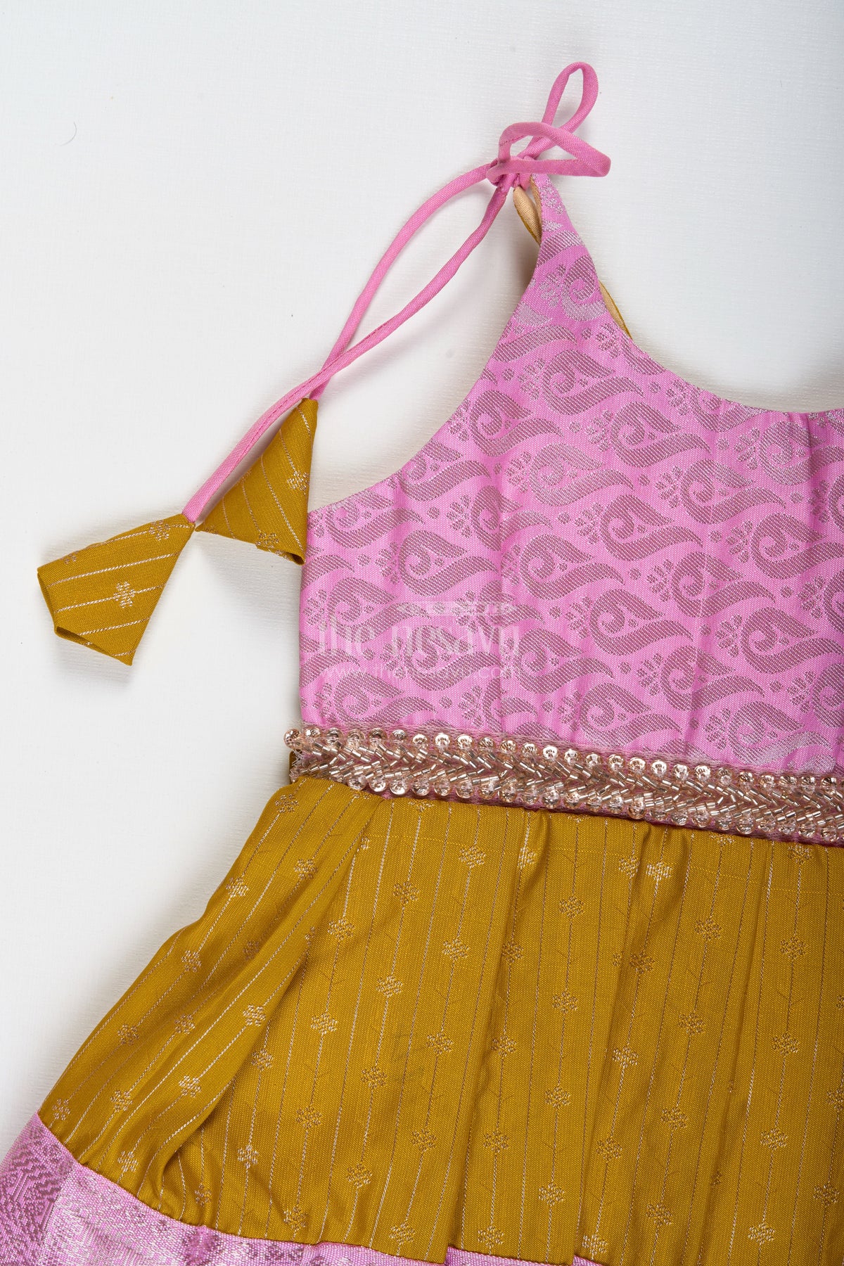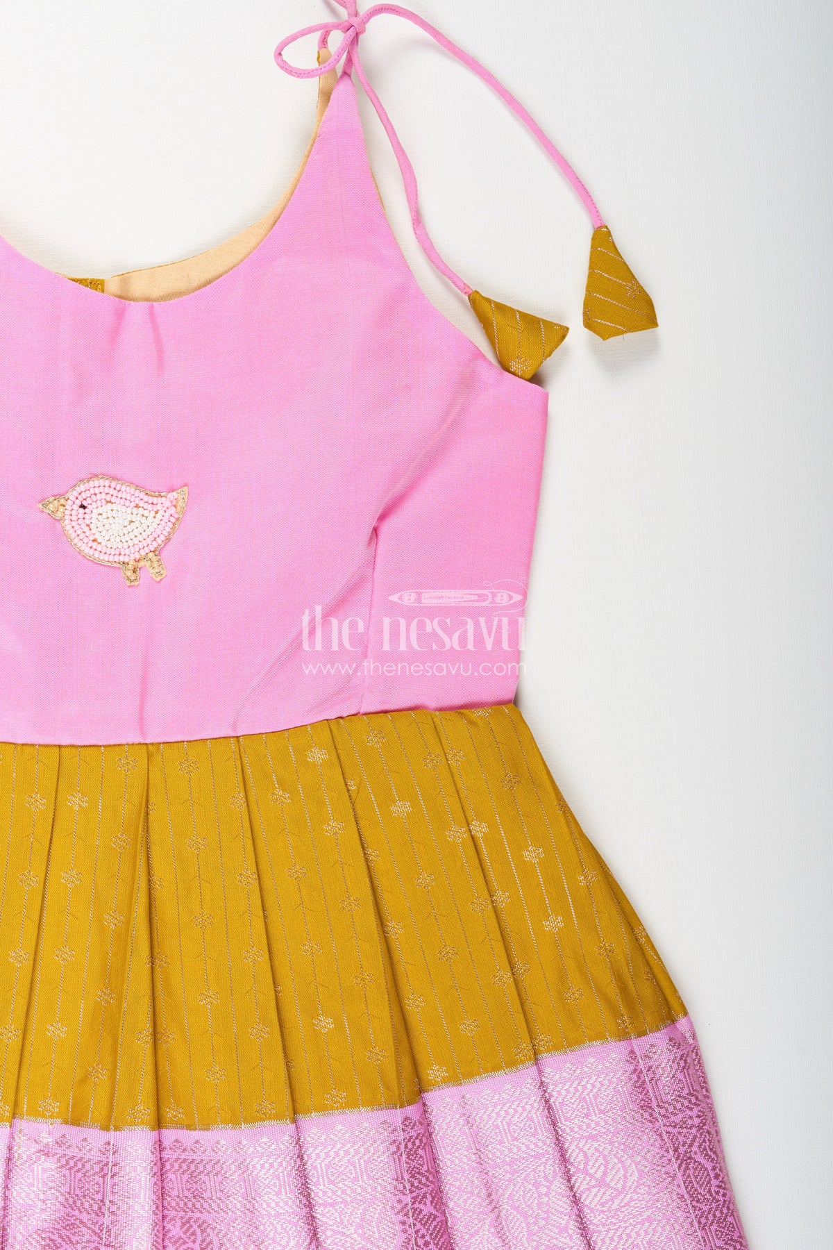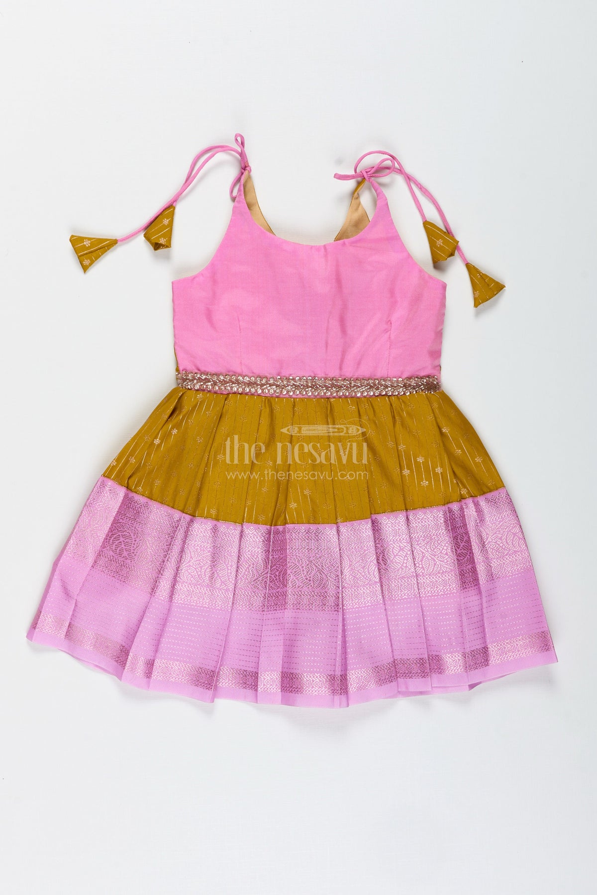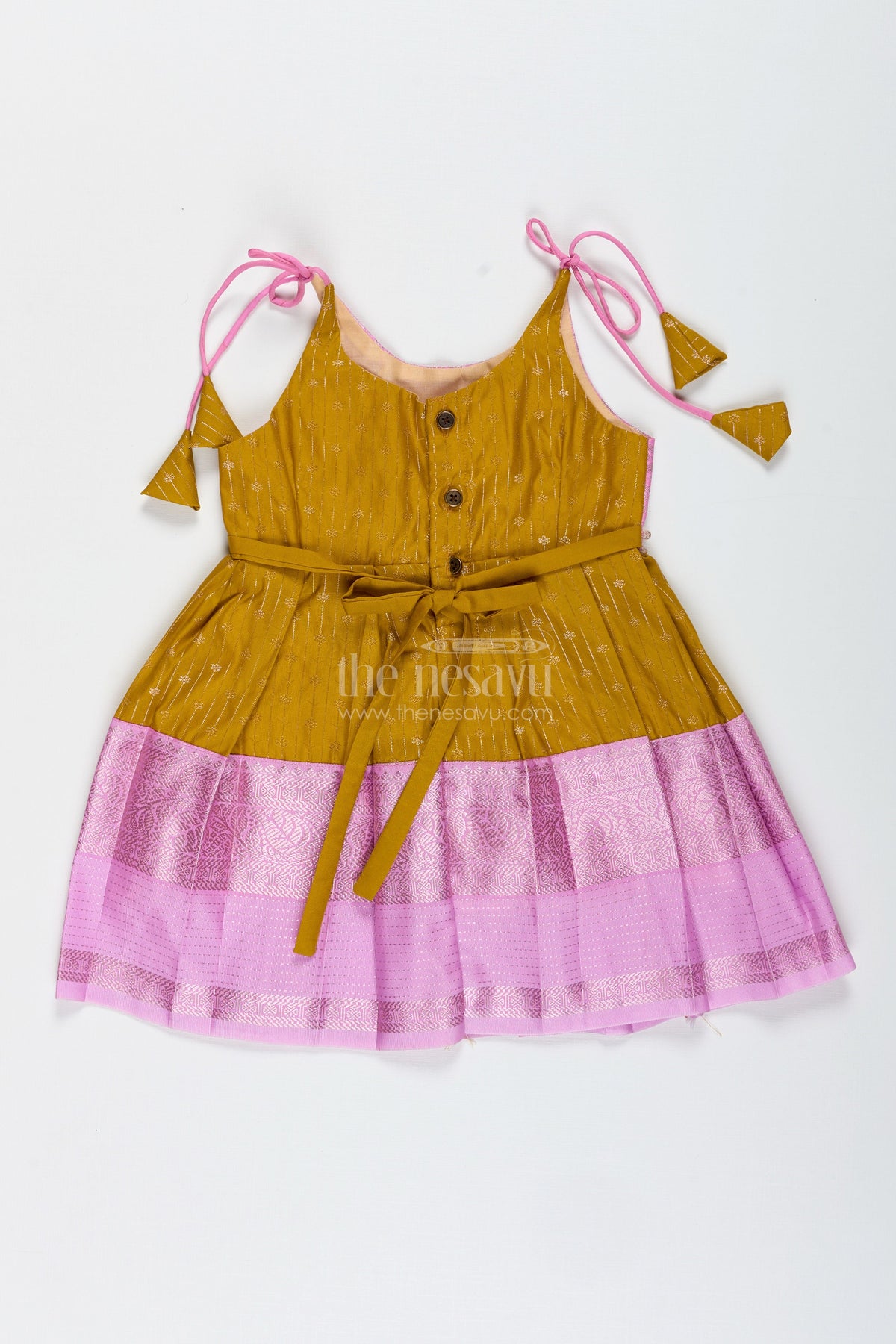 The Nesavu Tie-up Frock Pink And Mustard Frock For Baby Girls In Semi Silk Ideal For Birthdays And Traditional Gatherings Nesavu Nesavu Pink And Mustard Frock For Baby Girls Semi Silk Ethnic Dress For Birthdays And Poojas