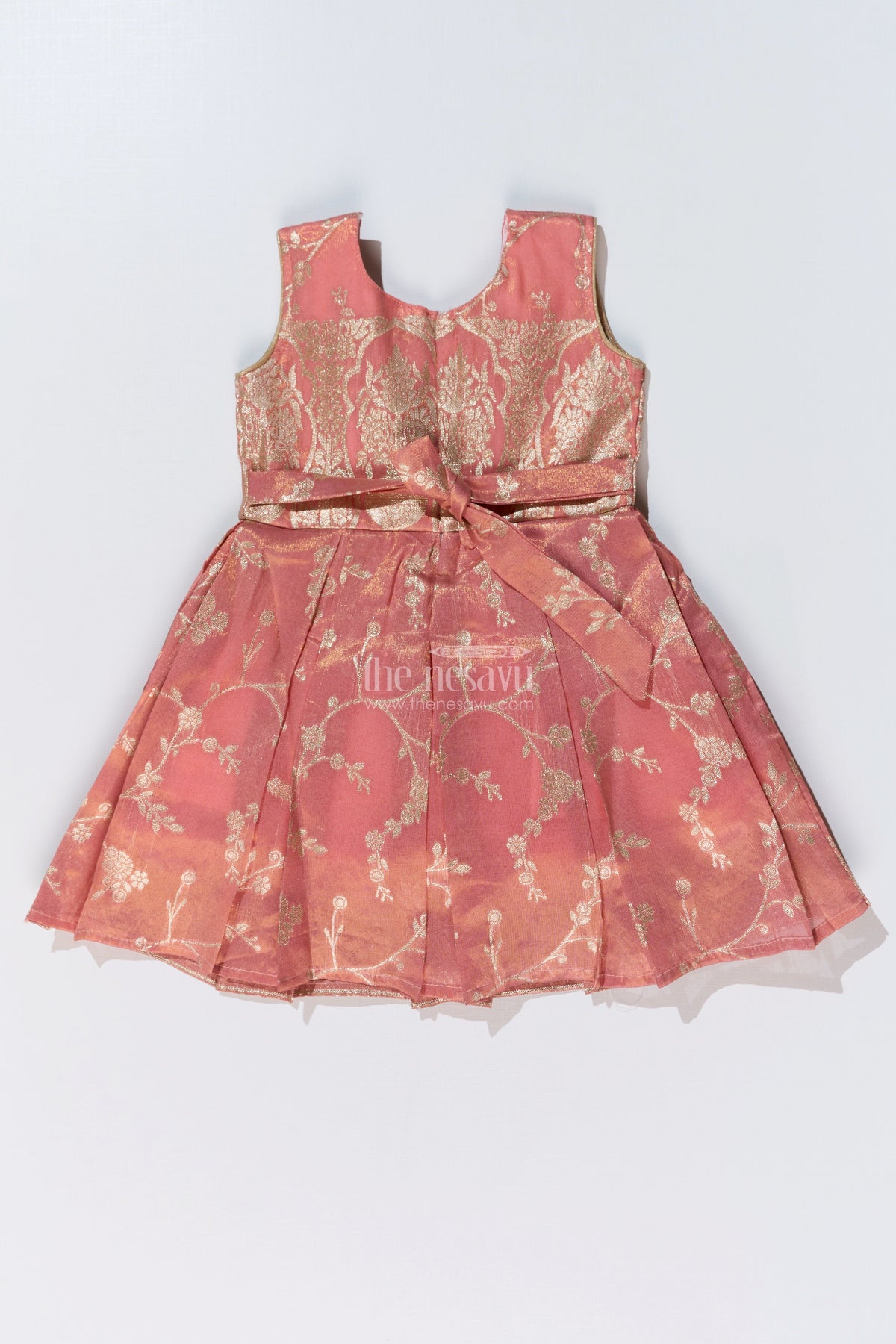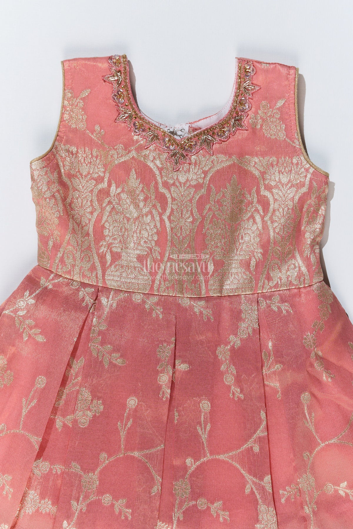 This charming peach color frock is an enchanting addition to your little girl’s festive wardrobe. Made from luxurious blend silk with a tissue bottom, the dress features intricate zari motifs that add a regal touch. The rich peach hue, complemented by golden embroidery along the neckline, enhances its traditional elegance. The pleated skirt adds volume and movement, making it ideal for cultural celebrations, birthday parties, and festive gatherings. Designed with comfort in mind, this sleeveless frock has a back zip closure for easy dressing. Let your child shine in this beautifully crafted frock, perfect for creating cherished memories.