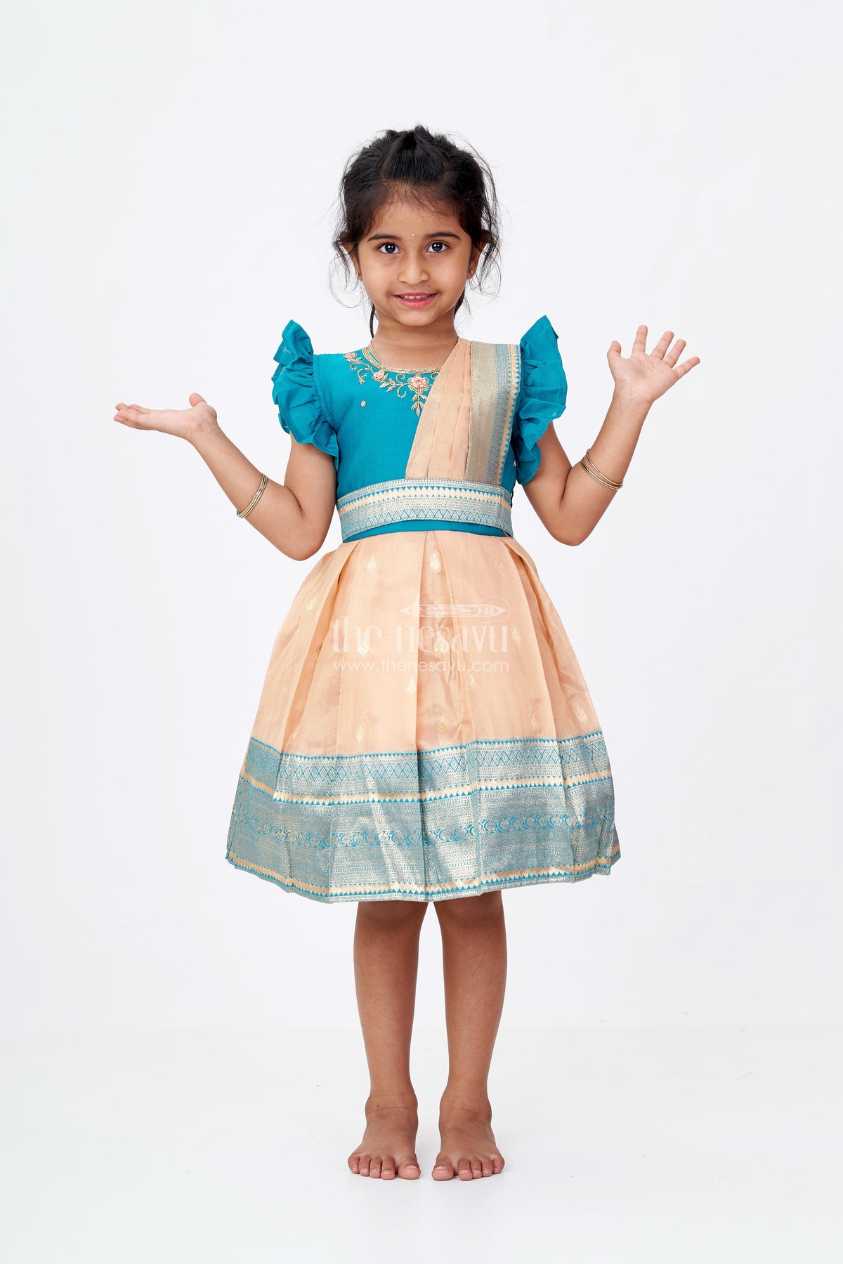 This exquisite silk saree to frock is a unique blend of heritage and modern fashion, transforming a traditional silk saree into a charming frock. Featuring a teal silk bodice with intricate embroidery, ruffled sleeves, and a pleated peach skirt adorned with detailed zari work, this dress is perfect for special occasions like temple visits, weddings, and family gatherings. The elegant contrast of colors and traditional motifs make this outfit stand out, ensuring your little girl looks graceful and stylish.