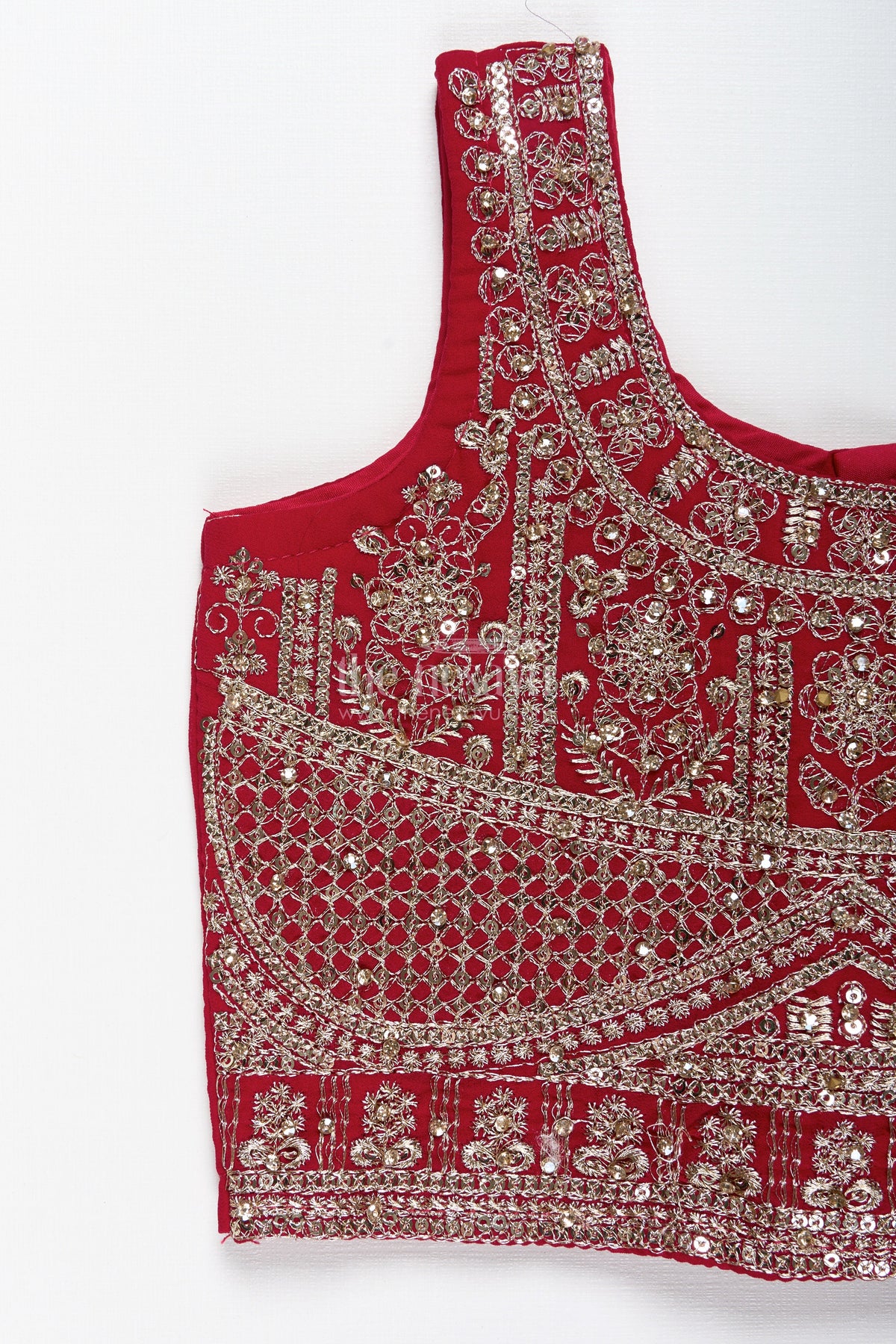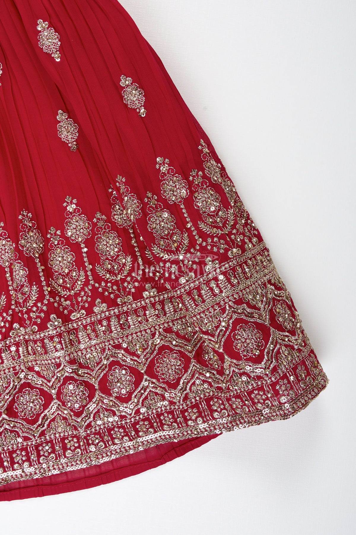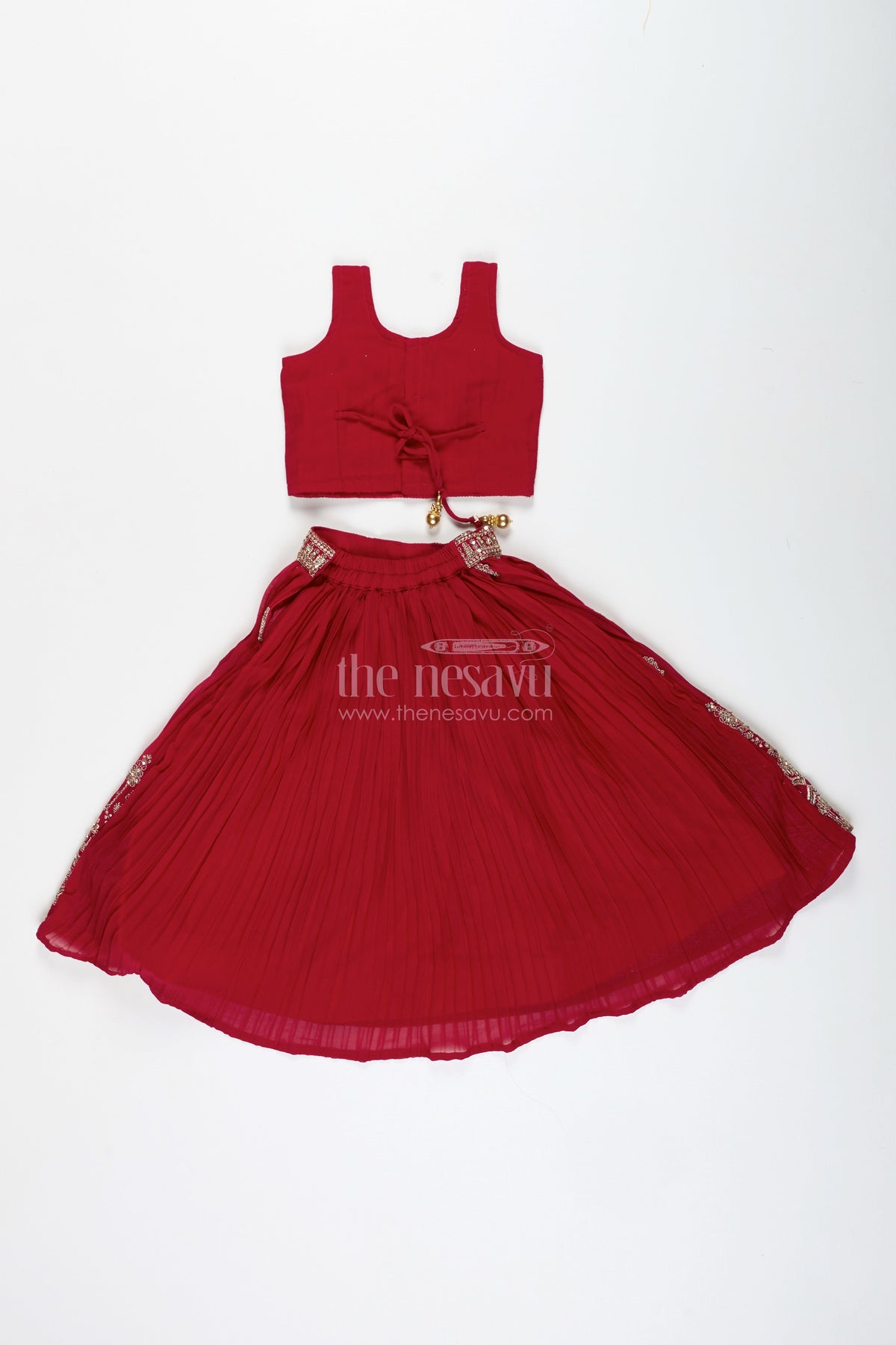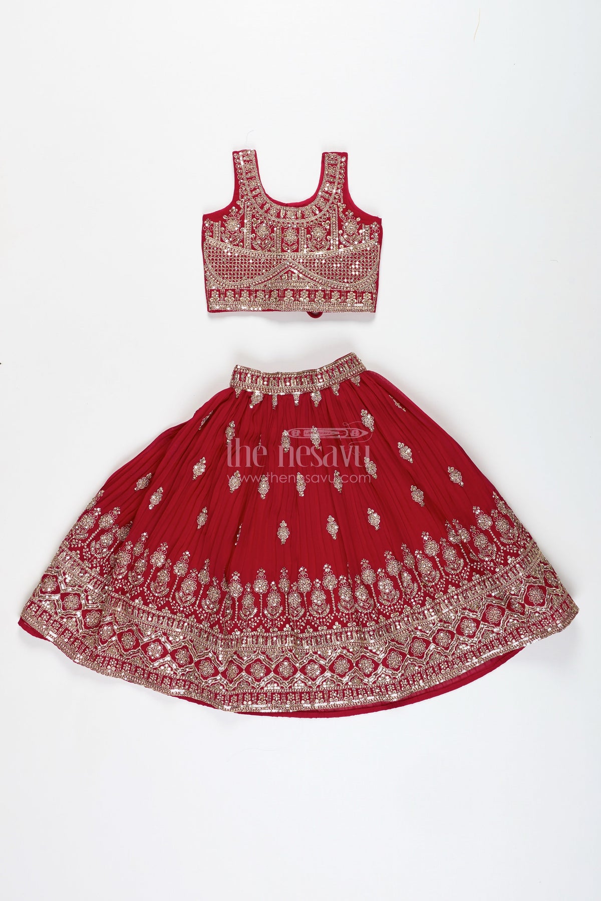 Girls Traditional Lehenga for Wedding Celebrations brings regal sophistication in a luxurious wine red tone, enhanced with heavy gold embroidery. Made from high-quality georgette, this lehenga features intricate zari work on the blouse and hemline, inspired by royal Indian motifs. The pleated skirt adds grandeur and volume, while the designer yoke on the choli ensures a perfectly structured silhouette. Whether it's a wedding function or a grand traditional gathering, this lehenga stands out with its premium finish, comfort, and cultural richness. An essential pick for weddings where style and heritage go hand in hand.