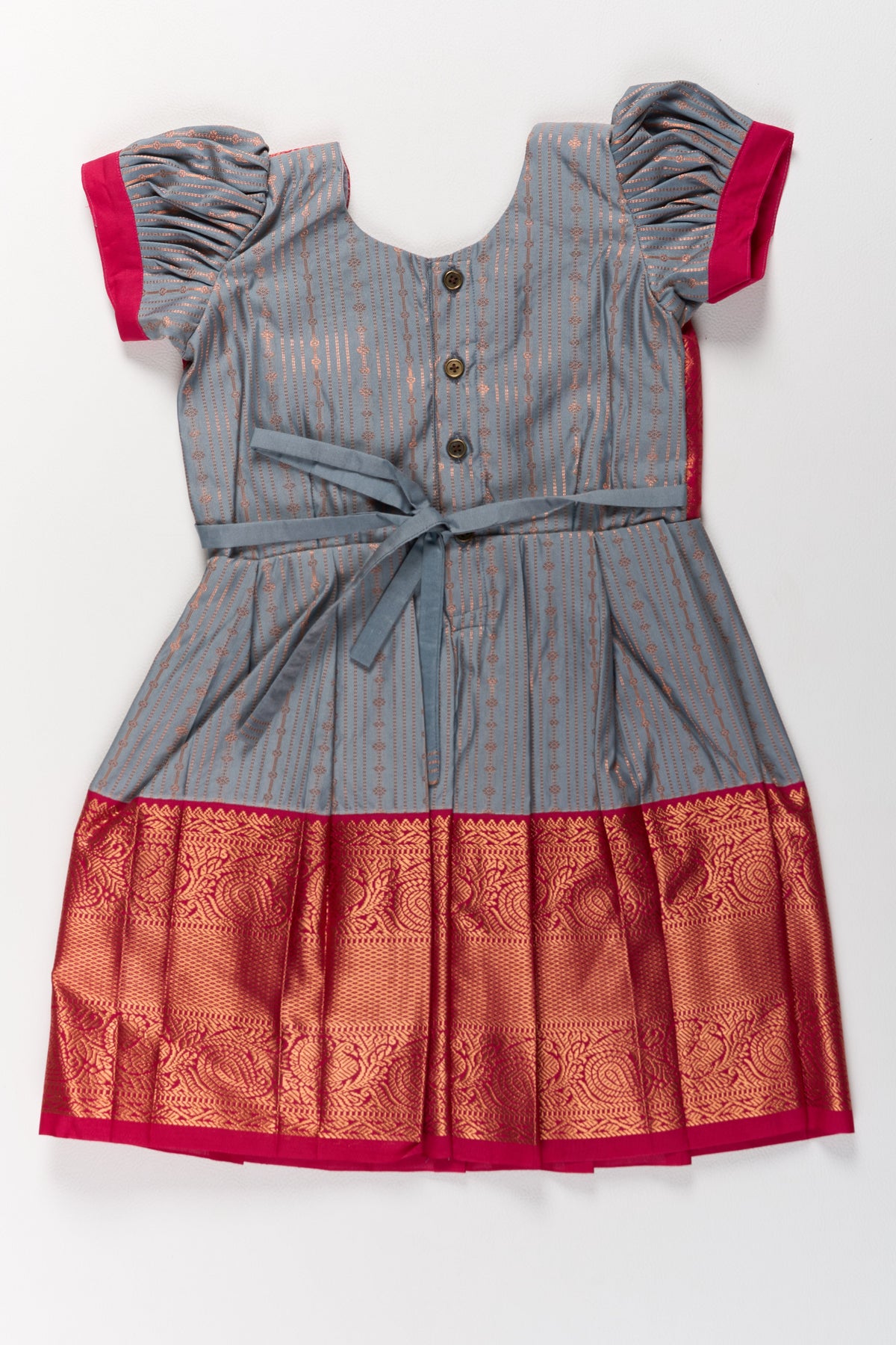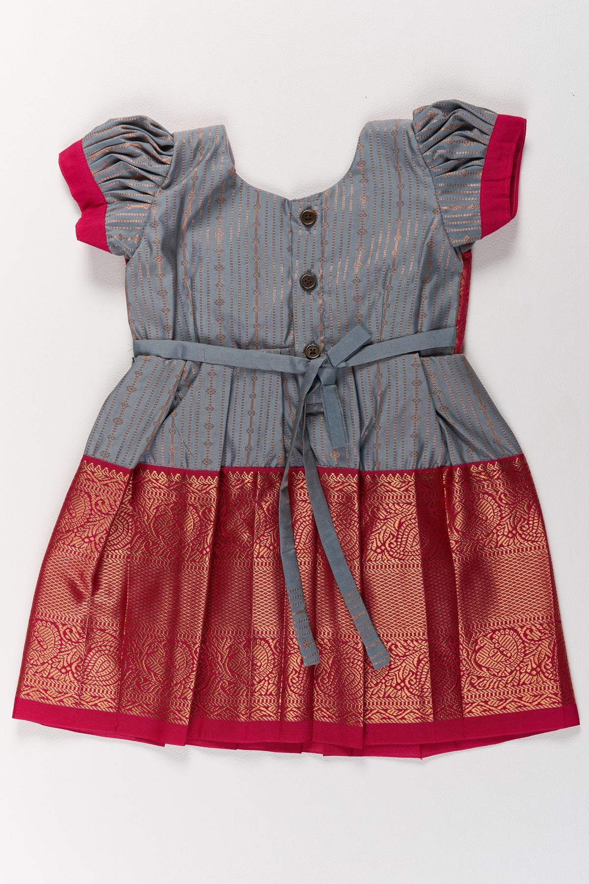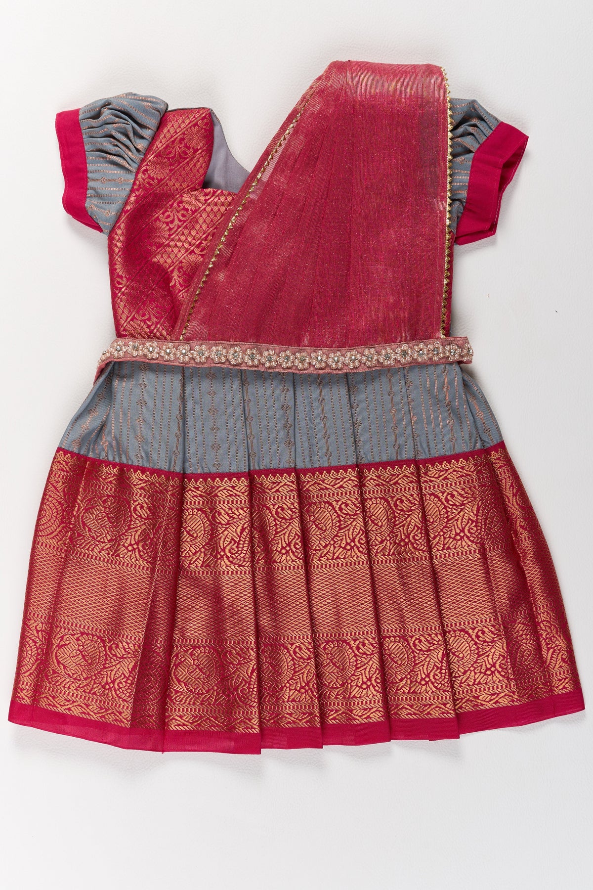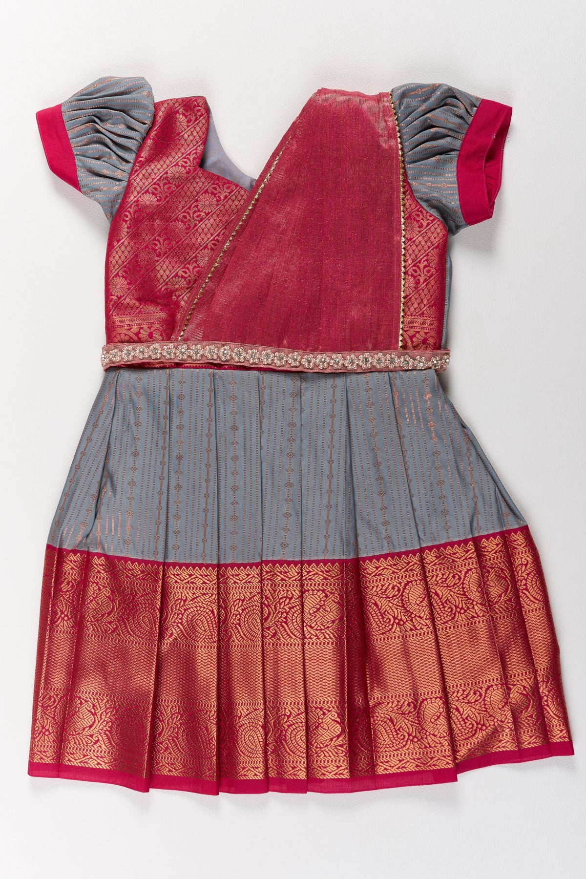 This gorgeous gray and red pattu pavadai is a blend of elegance and tradition, perfect for young girls who love to dress in ethnic wear. Made from luxurious silk fabric, it features a contrast red blouse with rich zari detailing and a pleated skirt that adds to its festive charm. The short puff sleeves and fitted bodice enhance the traditional look, making it ideal for temple visits, weddings, and family gatherings. The silk fabric ensures breathability and comfort, allowing free movement throughout the day. Pair it with traditional footwear and accessories for a picture-perfect festive ensemble.