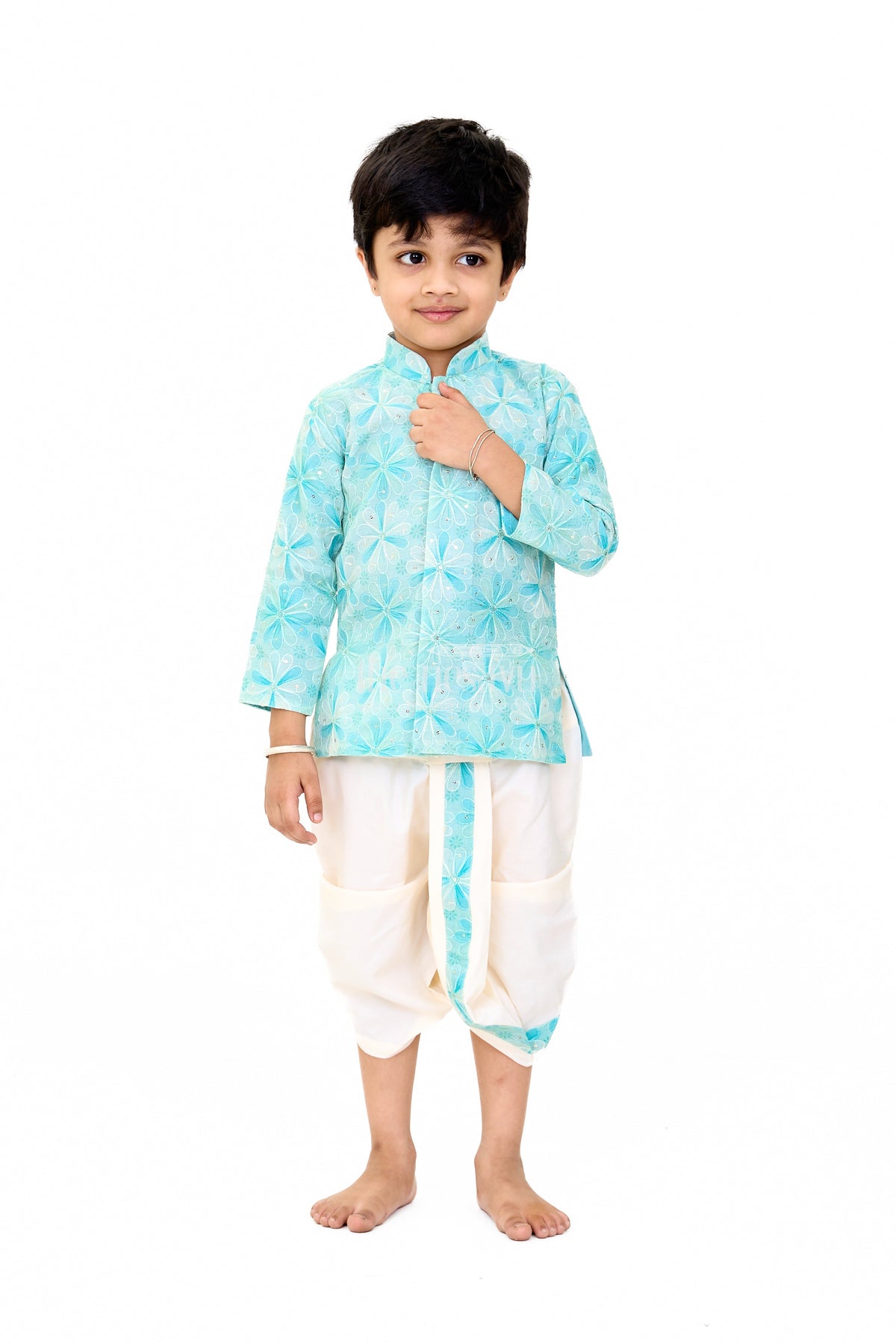This boys dhoti kurta wedding set is an elegant and stylish choice for special occasions. The green kurta is adorned with delicate floral embroidery and subtle sequins, adding a festive sparkle to the outfit. The cream dhoti is designed with a matching green border, completing the traditional look. Made from a lightweight cotton blend fabric, this outfit ensures comfort and breathability. Whether for weddings, temple visits, or cultural gatherings, this set is a perfect blend of tradition and contemporary fashion, making your little one look effortlessly stylish.